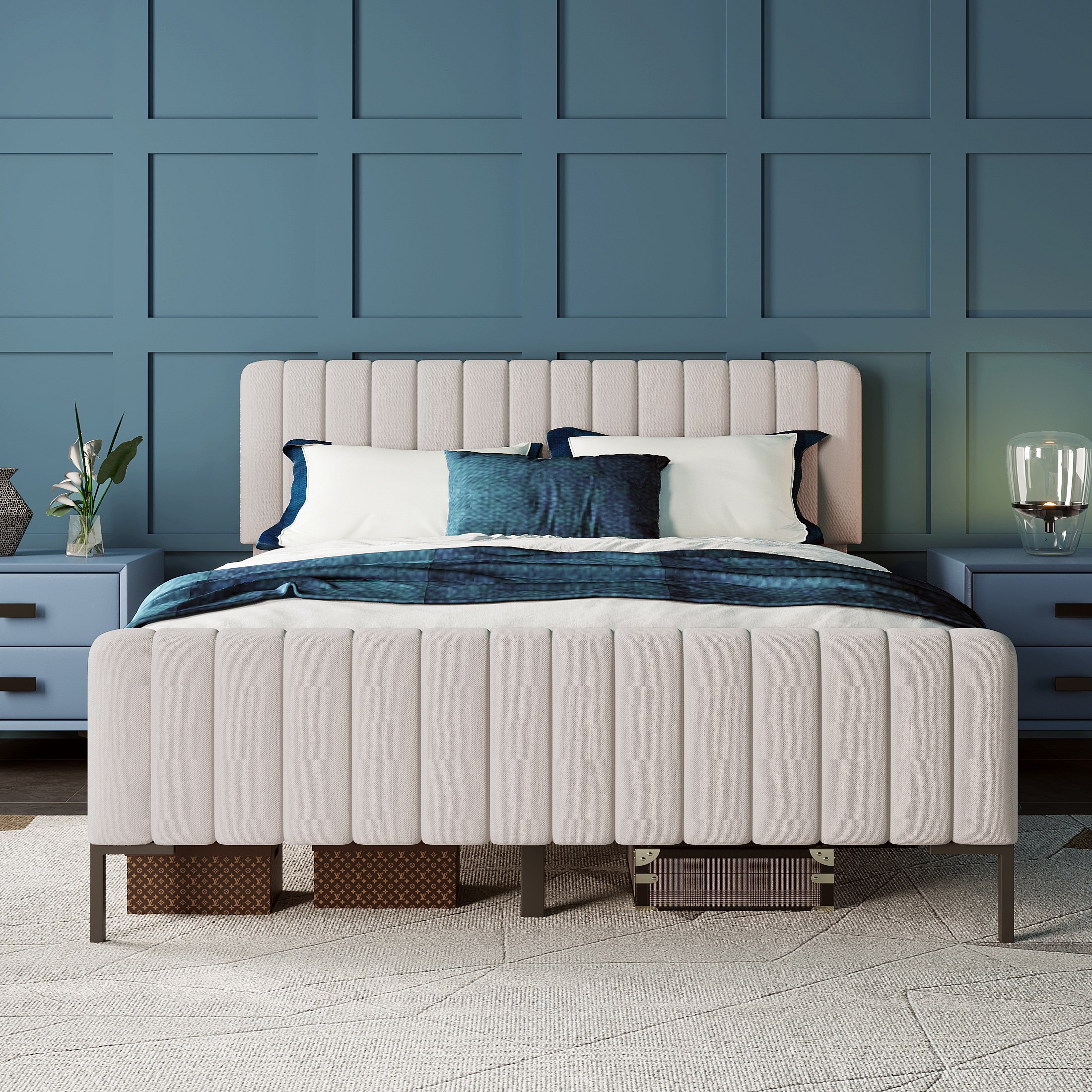 Lit double 140 x 200 cm, cadre de lit avec sommier et tête de lit réglable, lit rembourré gris-beige