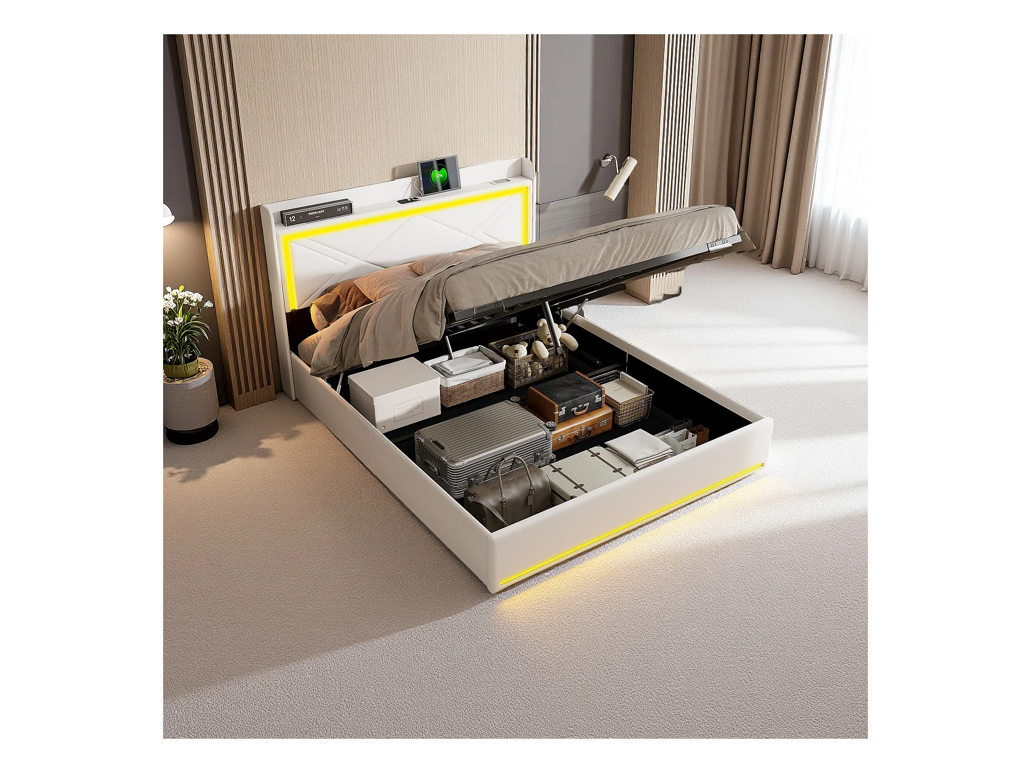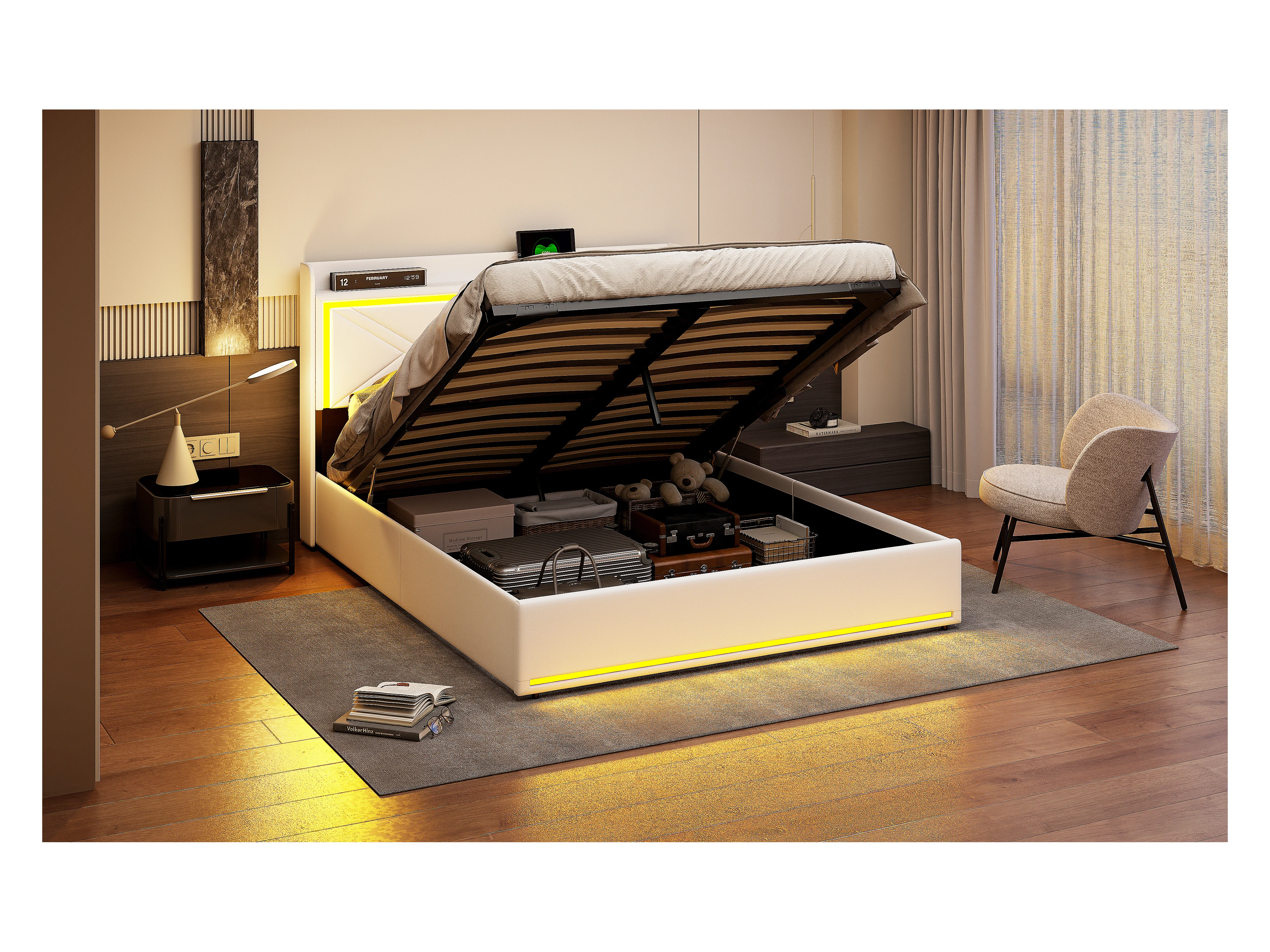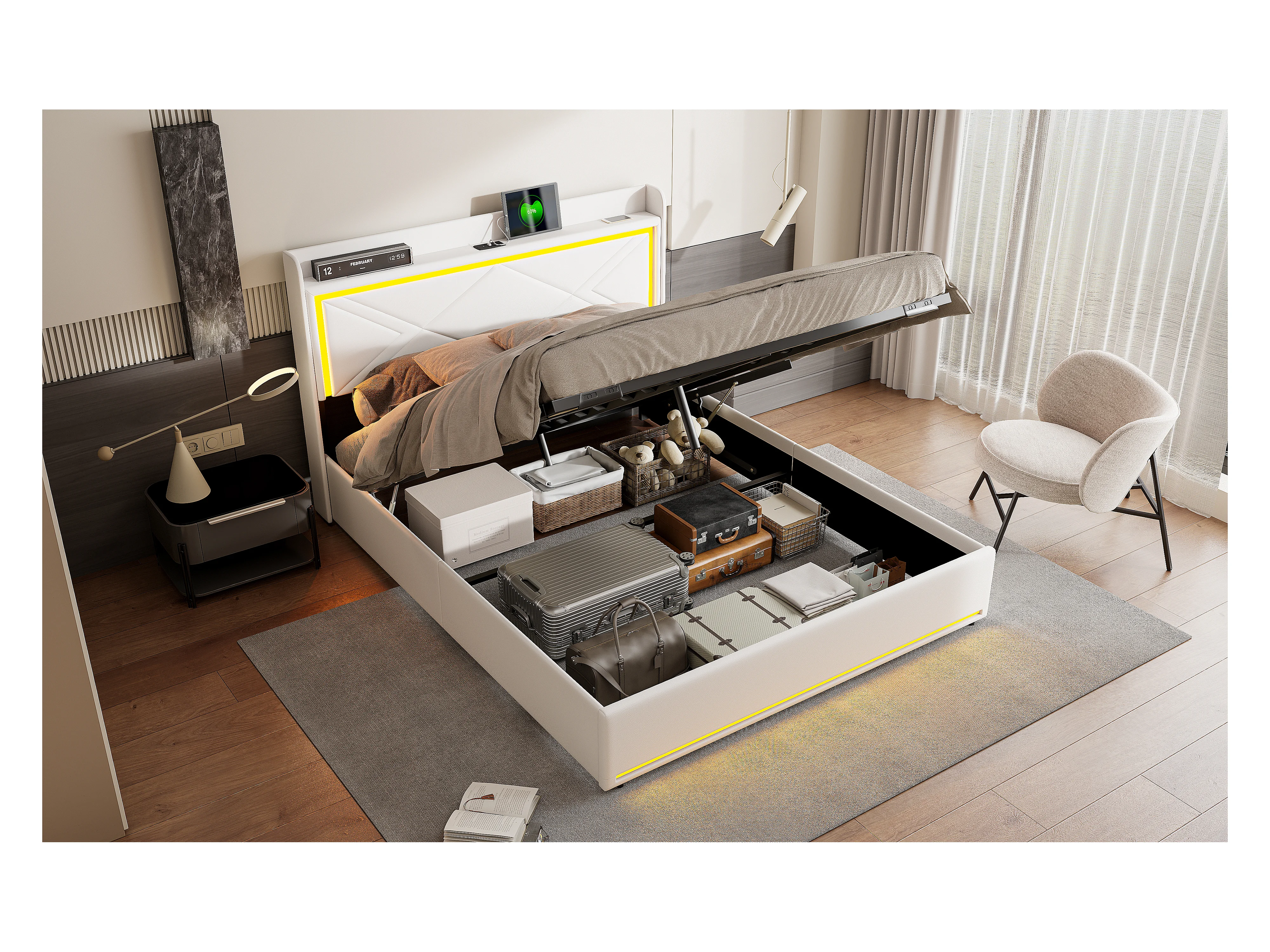 Lit double 140 x 200 cm - Lit de rangement hydraulique rembourré avec LED et port de charge USB - Sans matelas (blanc)