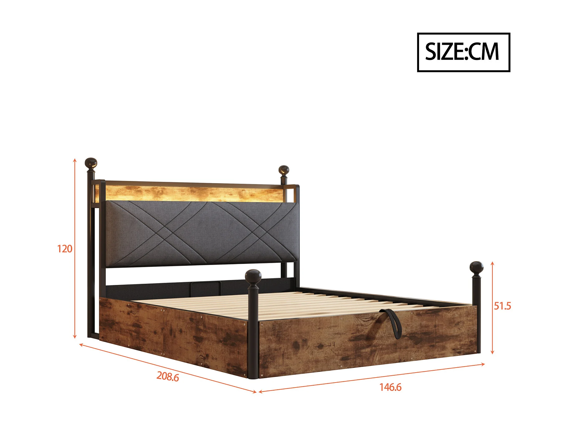Lit double 140x190 cm en fer forgé noir avec coffre hydraulique, baldaquin, poteaux amovibles, LED et ports USB, adulte/adolescent