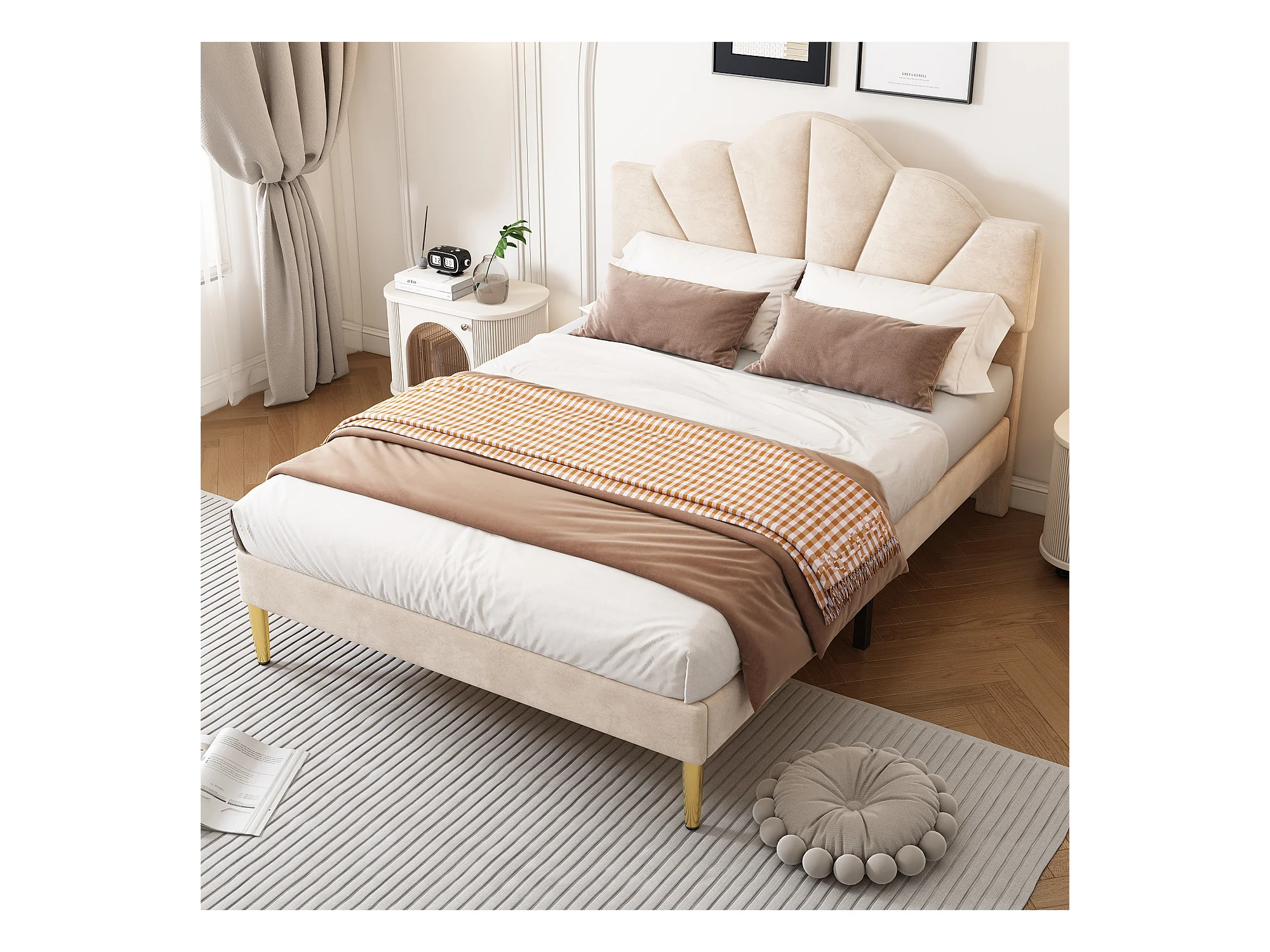 Lit adulte 140x190 cm en forme de coquille, pieds en fer doré, tête de lit réglable, en velours Beige(sans matelas)