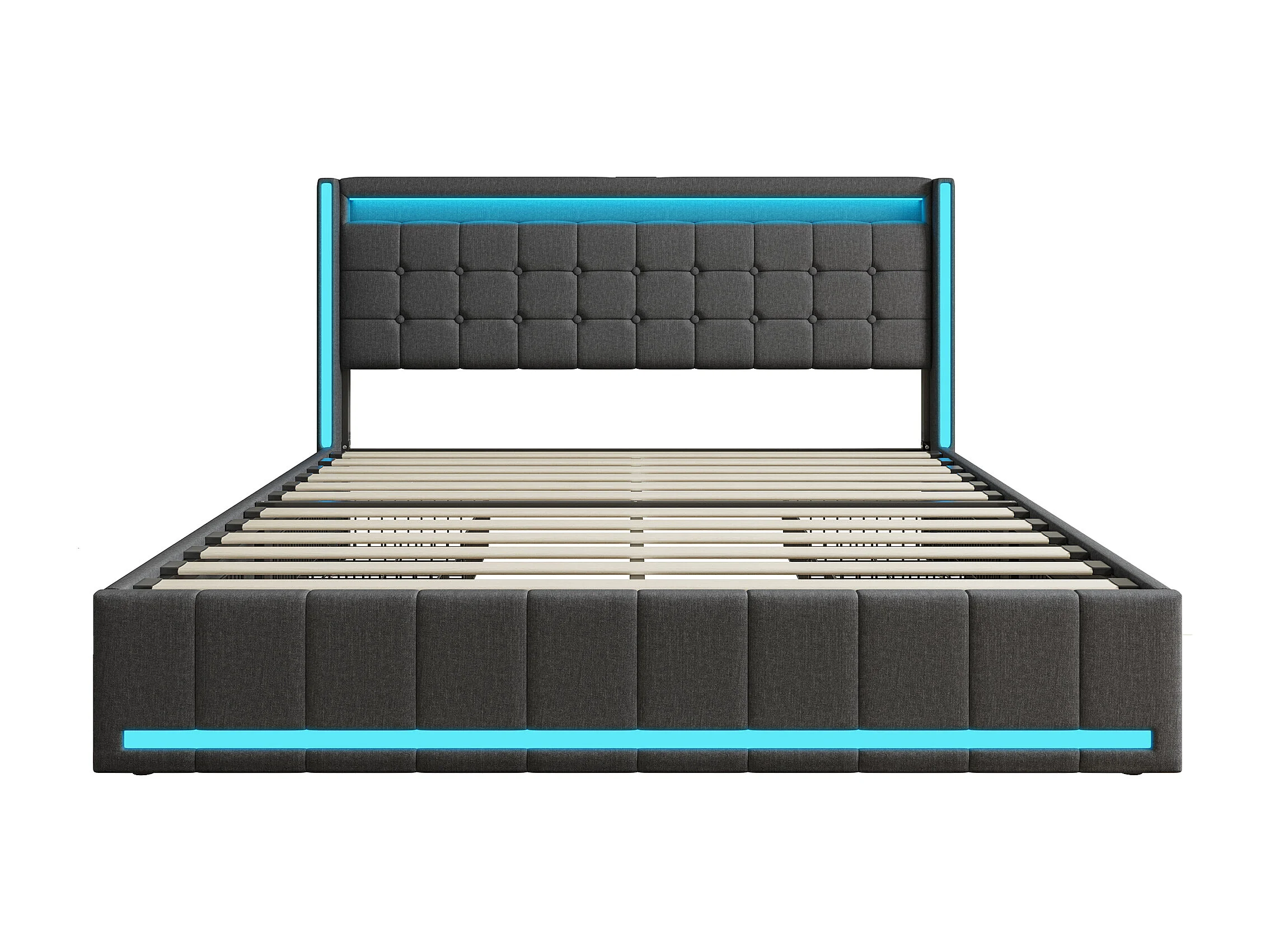 Lit Double 140x190 cm en Lin Gris Foncé avec LED, 4 Tiroirs en Métal et Ports USB à la Tête de Lit
