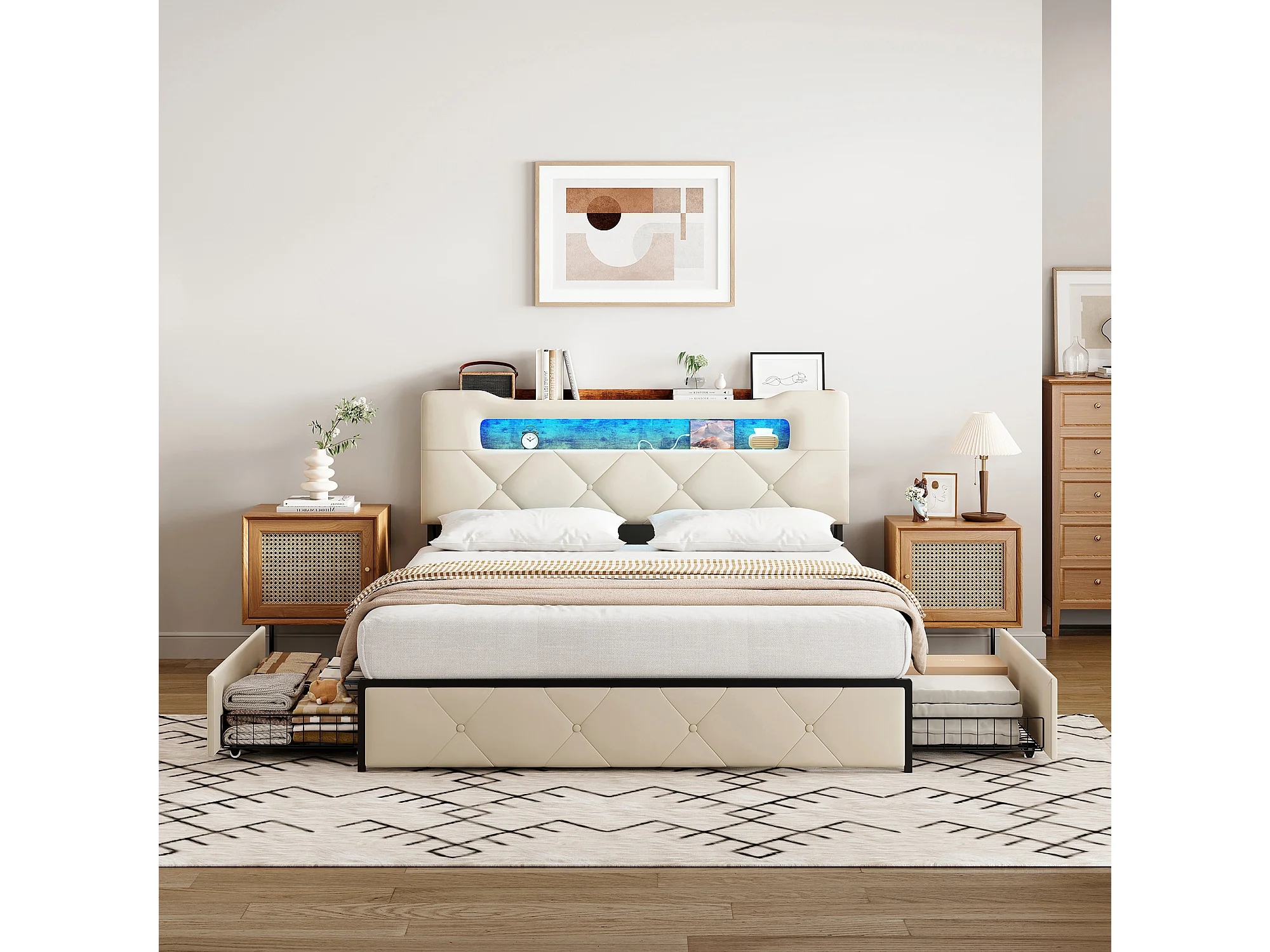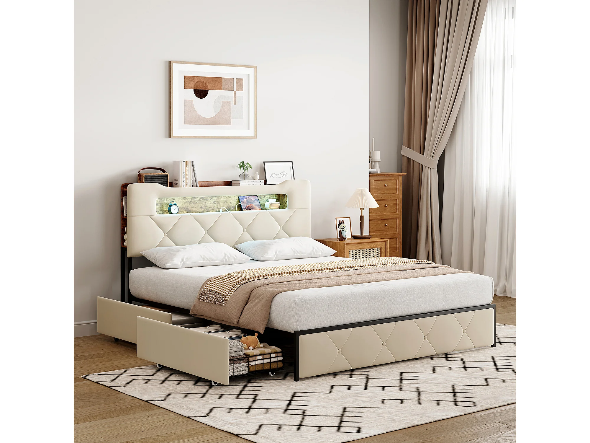 Lit double 140x190 cm - lit avec éclairage LED et port USB - lit coffre avec 4 tiroirs - velours - Beige