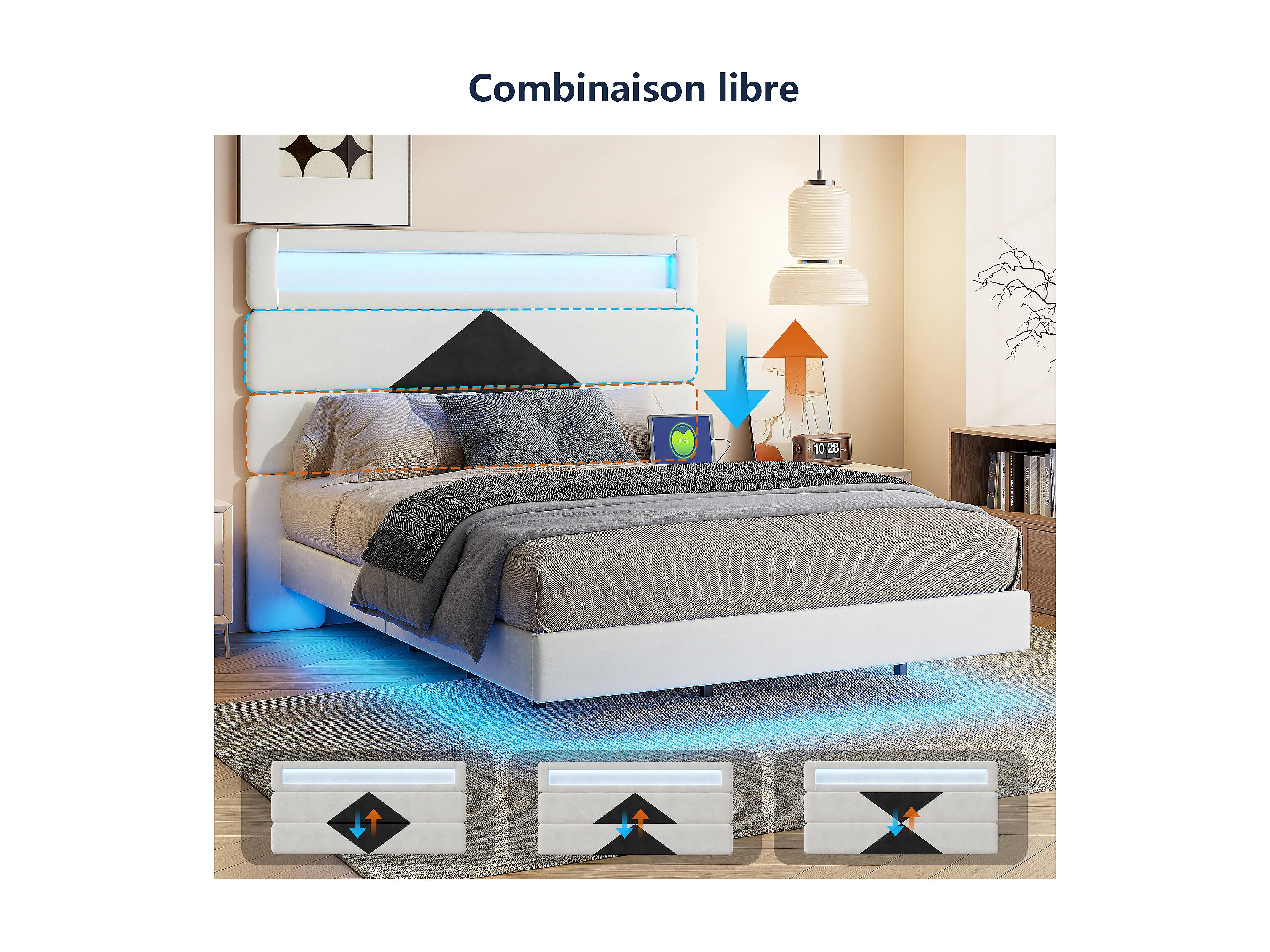 Lit double 140x190 cm - USB et USB C - LED intégrée - Tissu velours blanc