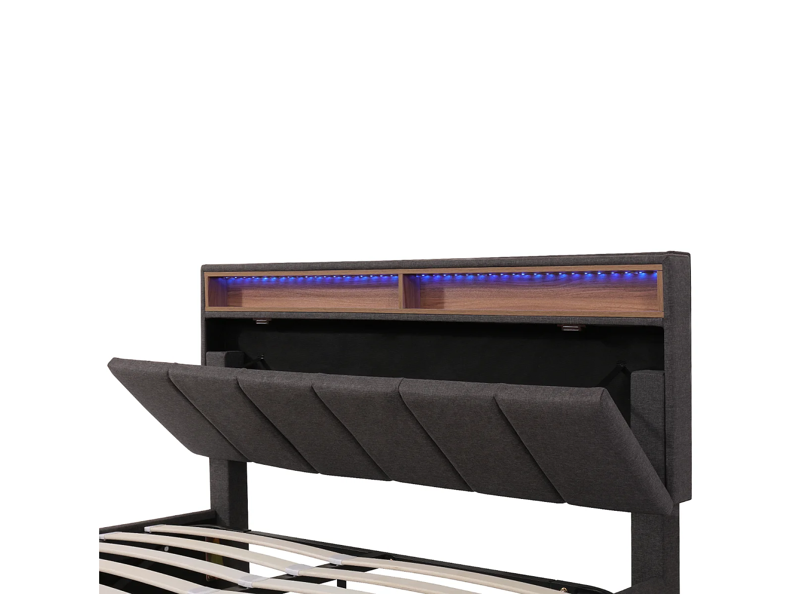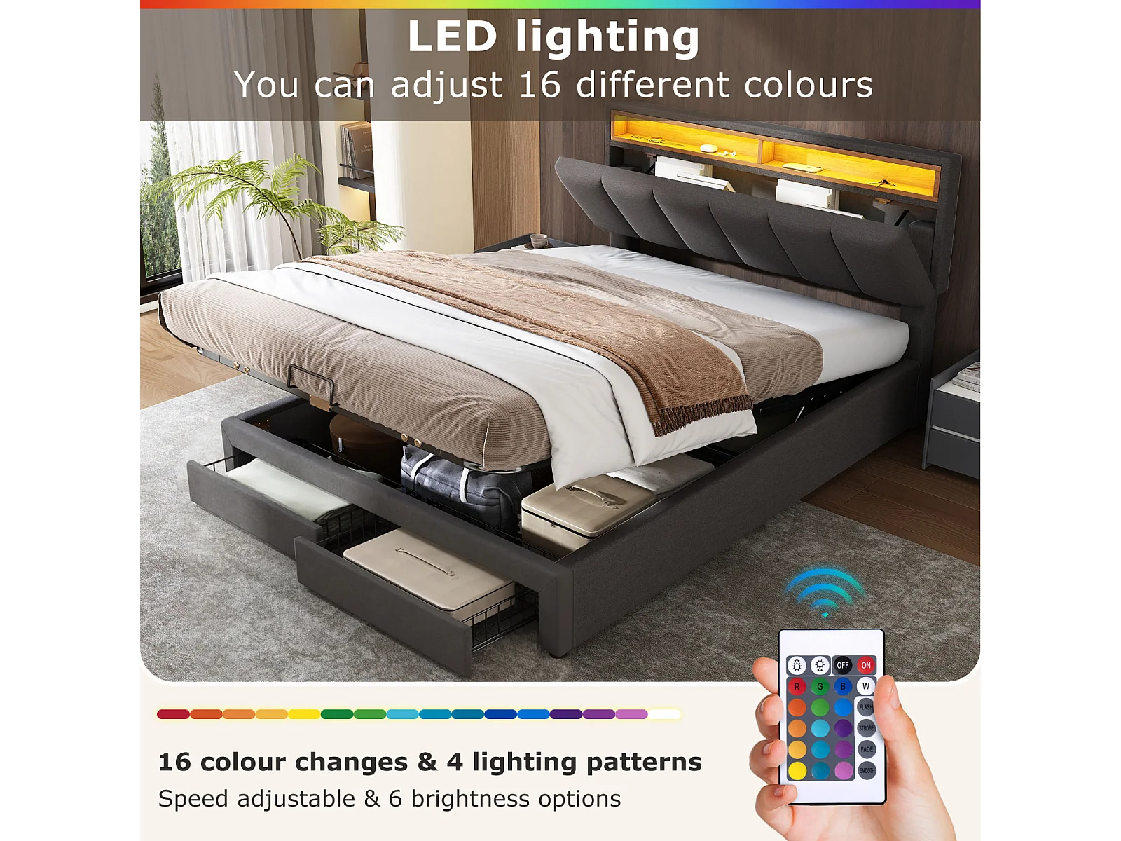 Lit double 140x190cm avec éclairage LED et 2 tiroirs - espace de rangement inclus - tête de lit réglable - lin - gris