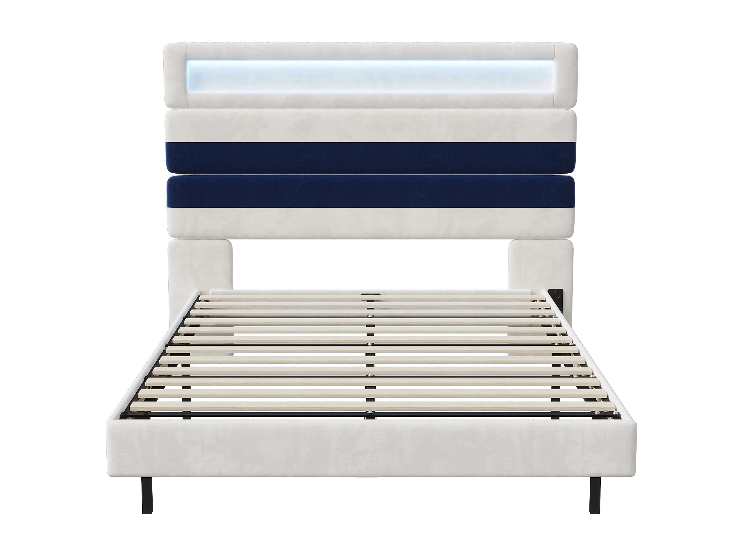 Lit double 140x190cm avec éclairage LED et interface USB/Type-C - tête de lit rayée à hauteur réglable - velours - blanc cassé