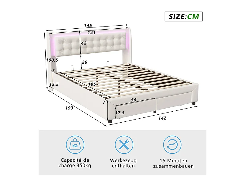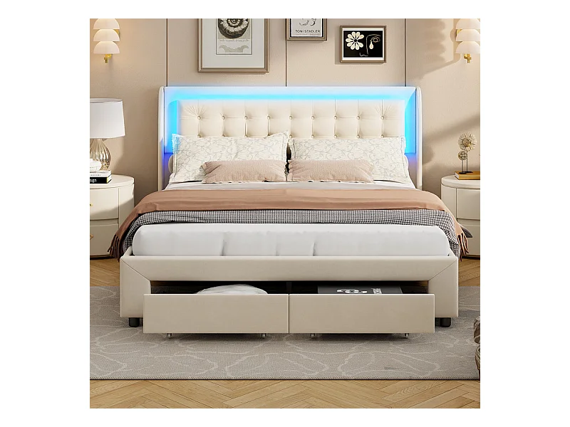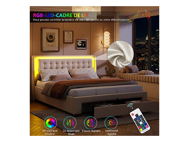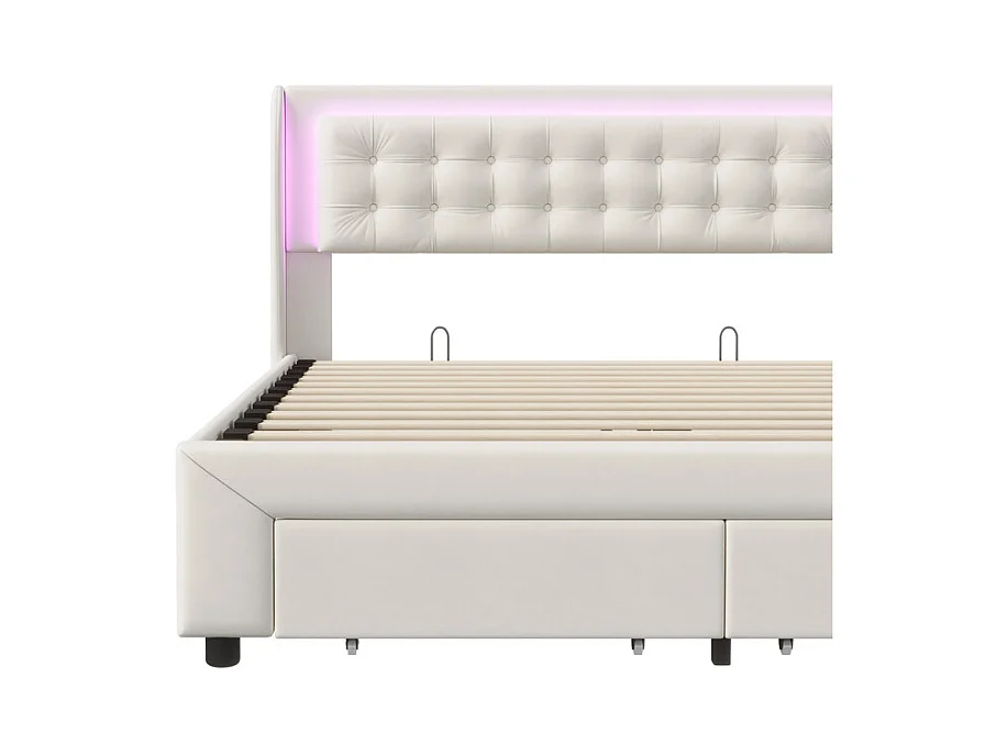 Lit Double 140x190cm avec Rangement Hydraulique, Tête de Lit Velours Blanc Cassé et Bandeau LED RGB Intégré