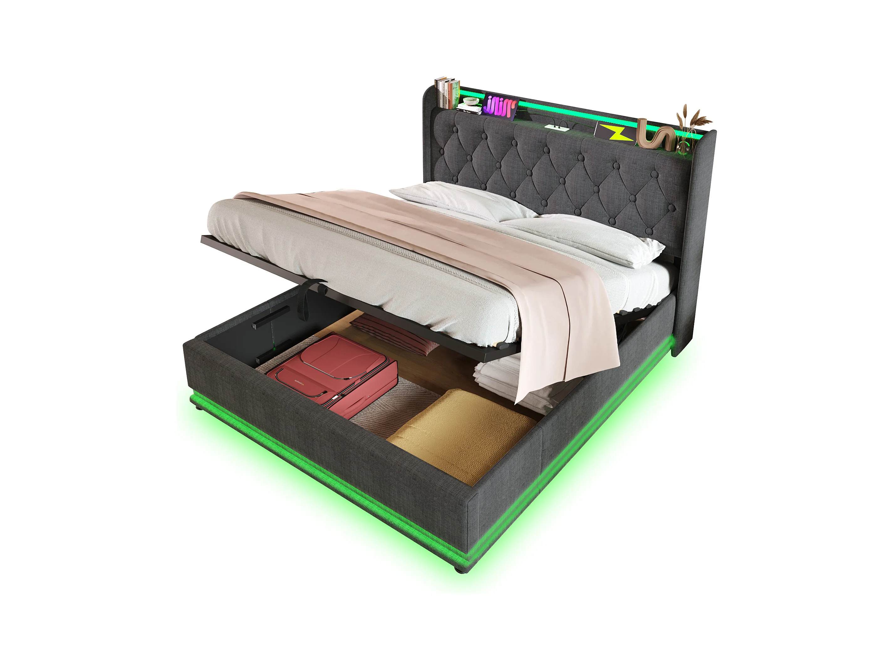 Lit double 140x200 avec LED 360°, tête rembourrée, commande tactile/app/à distance, USB Type-C, lin gris, hydraulique (sans matelas)