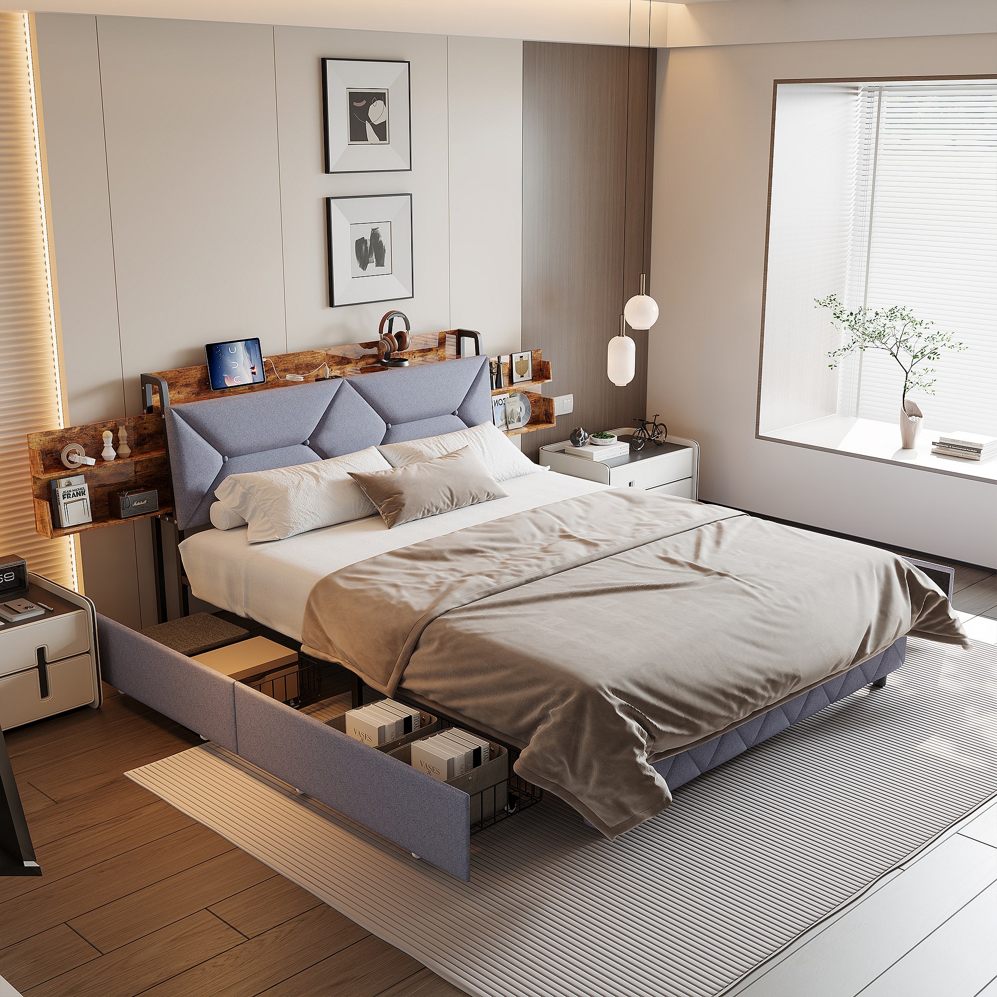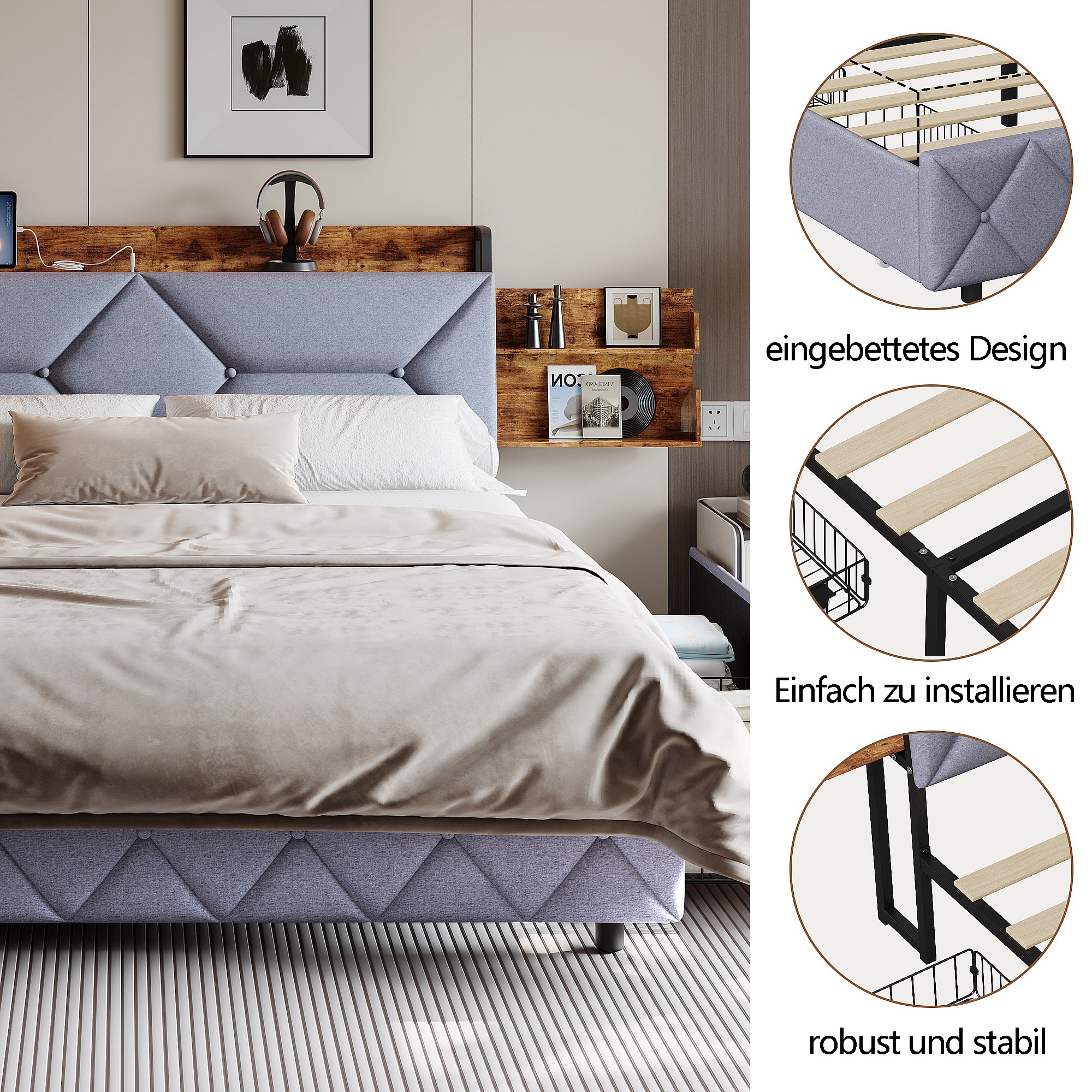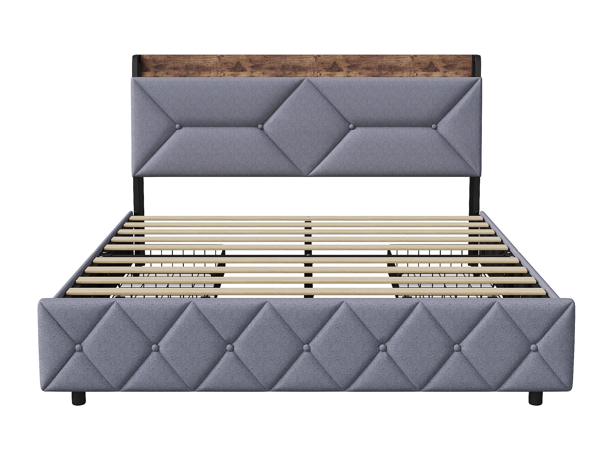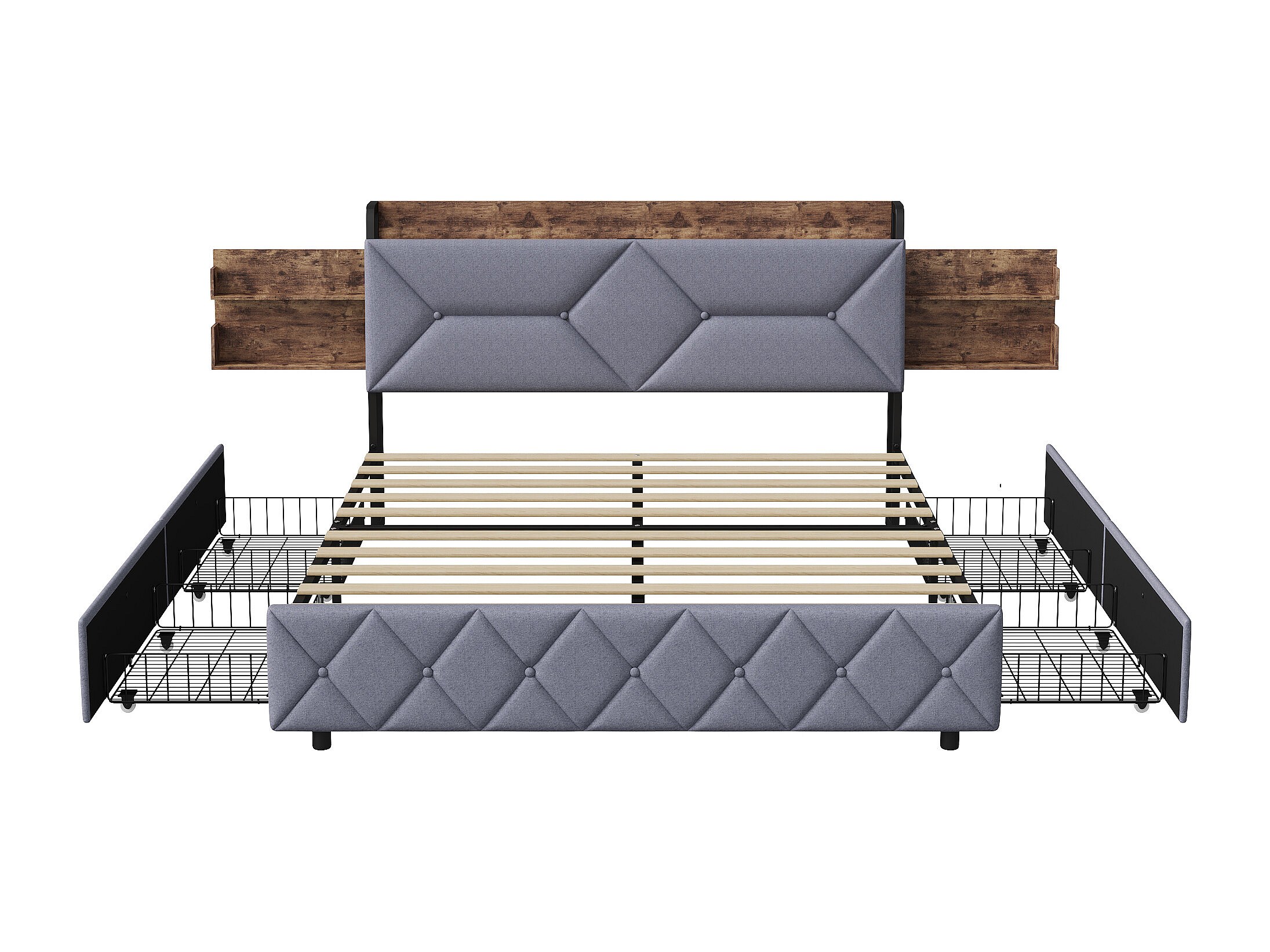 Lit Double 140x200, Cadre de Lits avec 4 tiroirs et sommier à Lattes, Ports USB et Type-C, Rangement sous Le lit