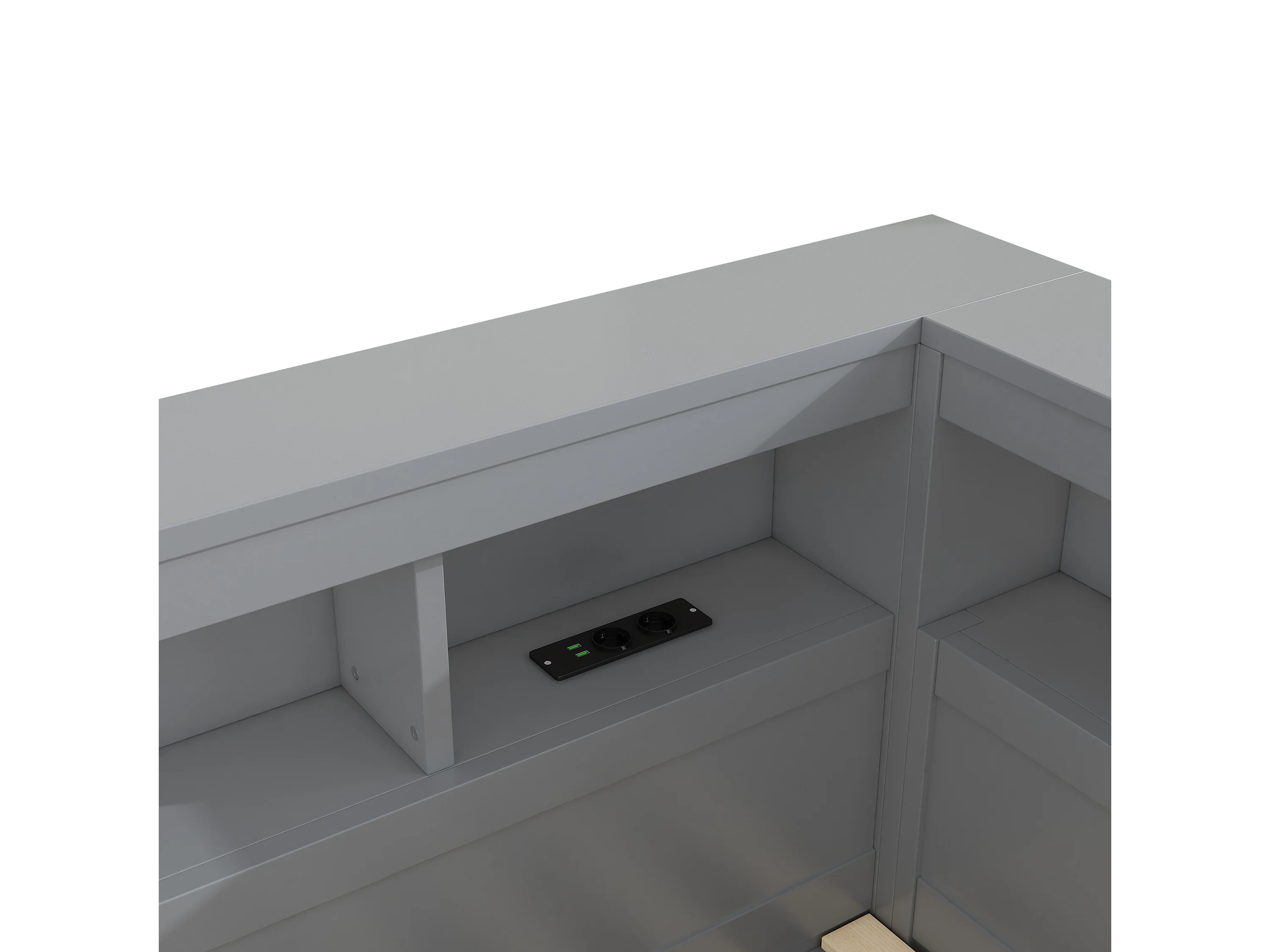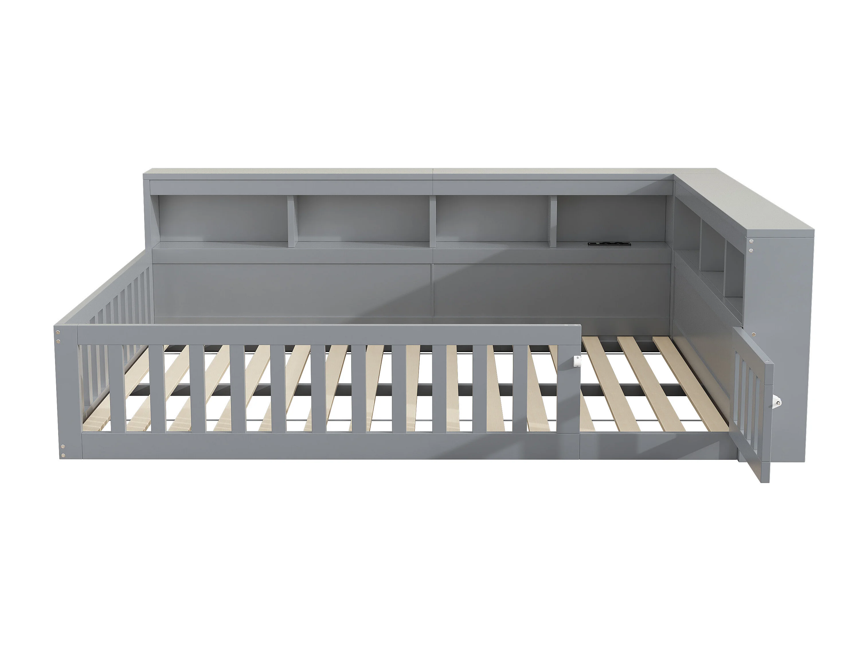 Lit double 140x200 cm au sol avec prise et rangements - Lit enfant en bois pin et MDF - Gris