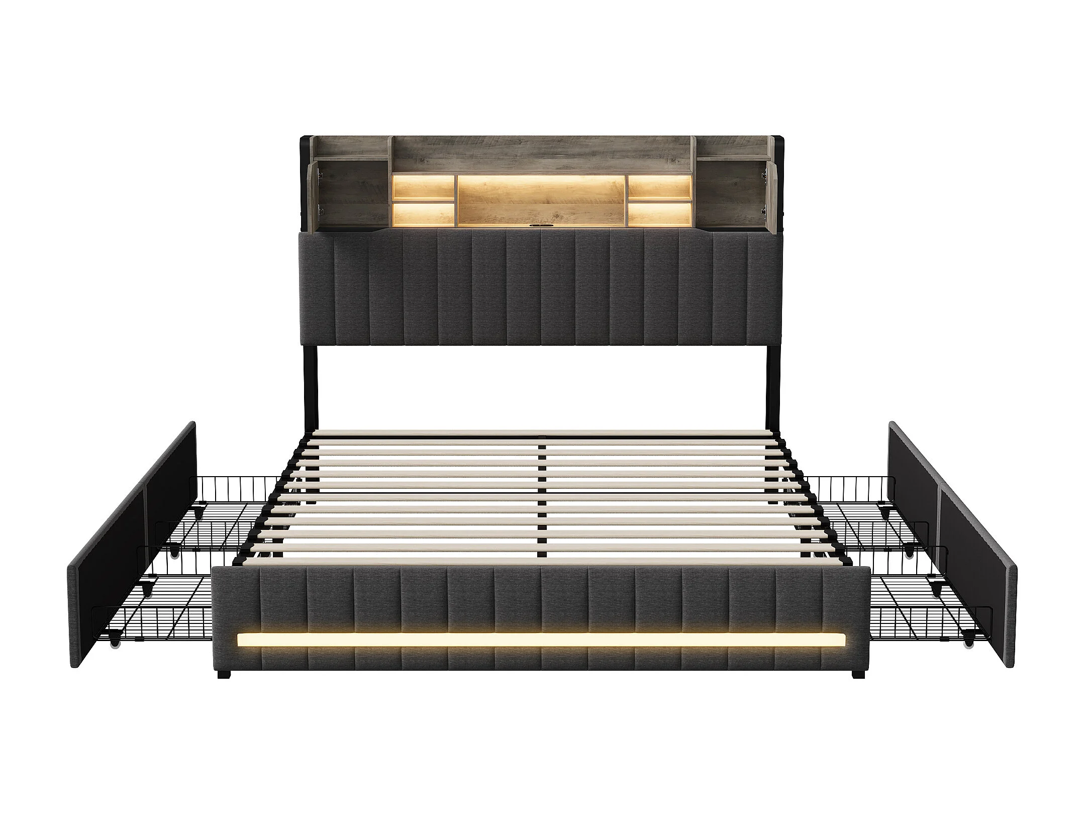 Lit double 140x200 cm - avec 4 tiroirs - chargement USB - éclairage LED - tables de chevet avec rangement - cloisons ouvertes - sommier à lattes - Gris