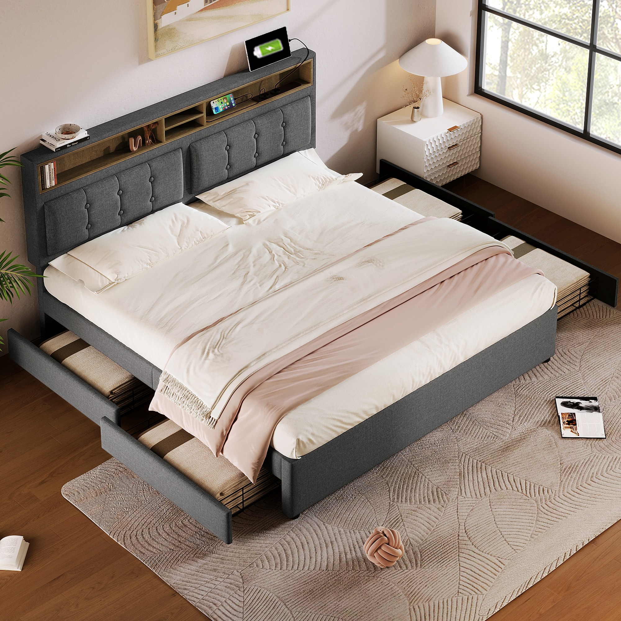 Lit double 140x200 cm avec 4 tiroirs et prise USB-C, tête de lit réglable en hauteur, sommier en bois