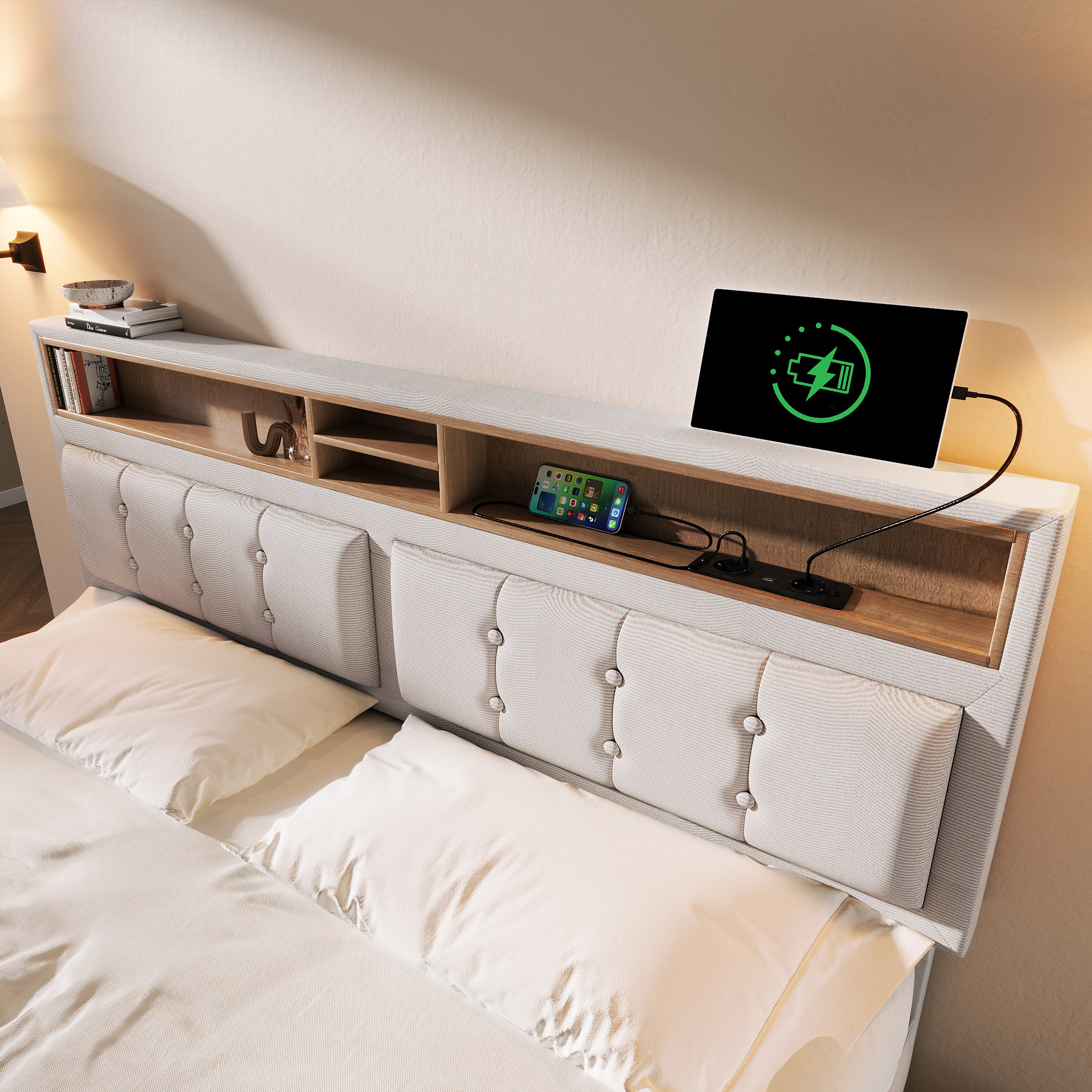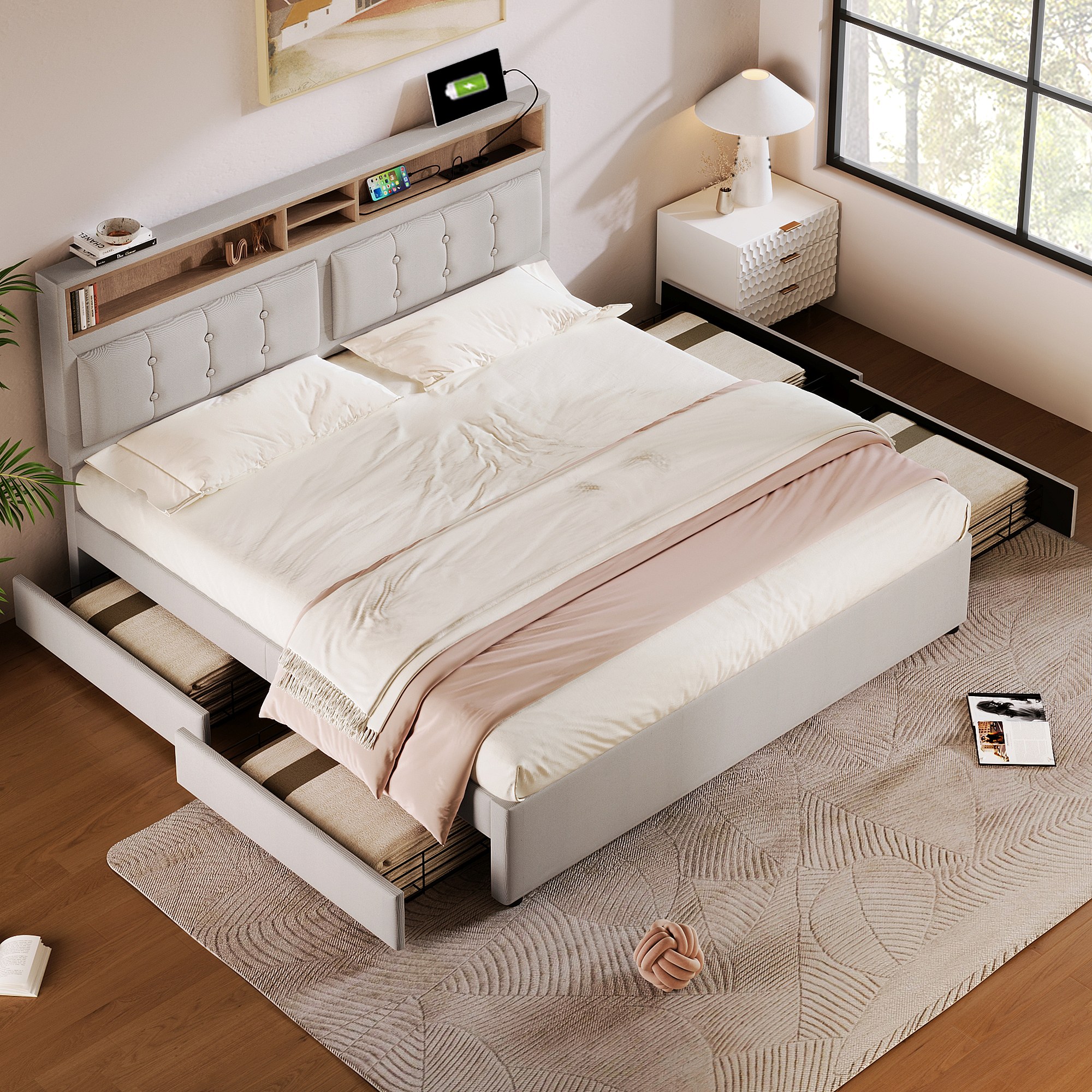 Lit double 140x200 cm avec 4 tiroirs et prise USB, tête de lit réglable en hauteur, en lin beige