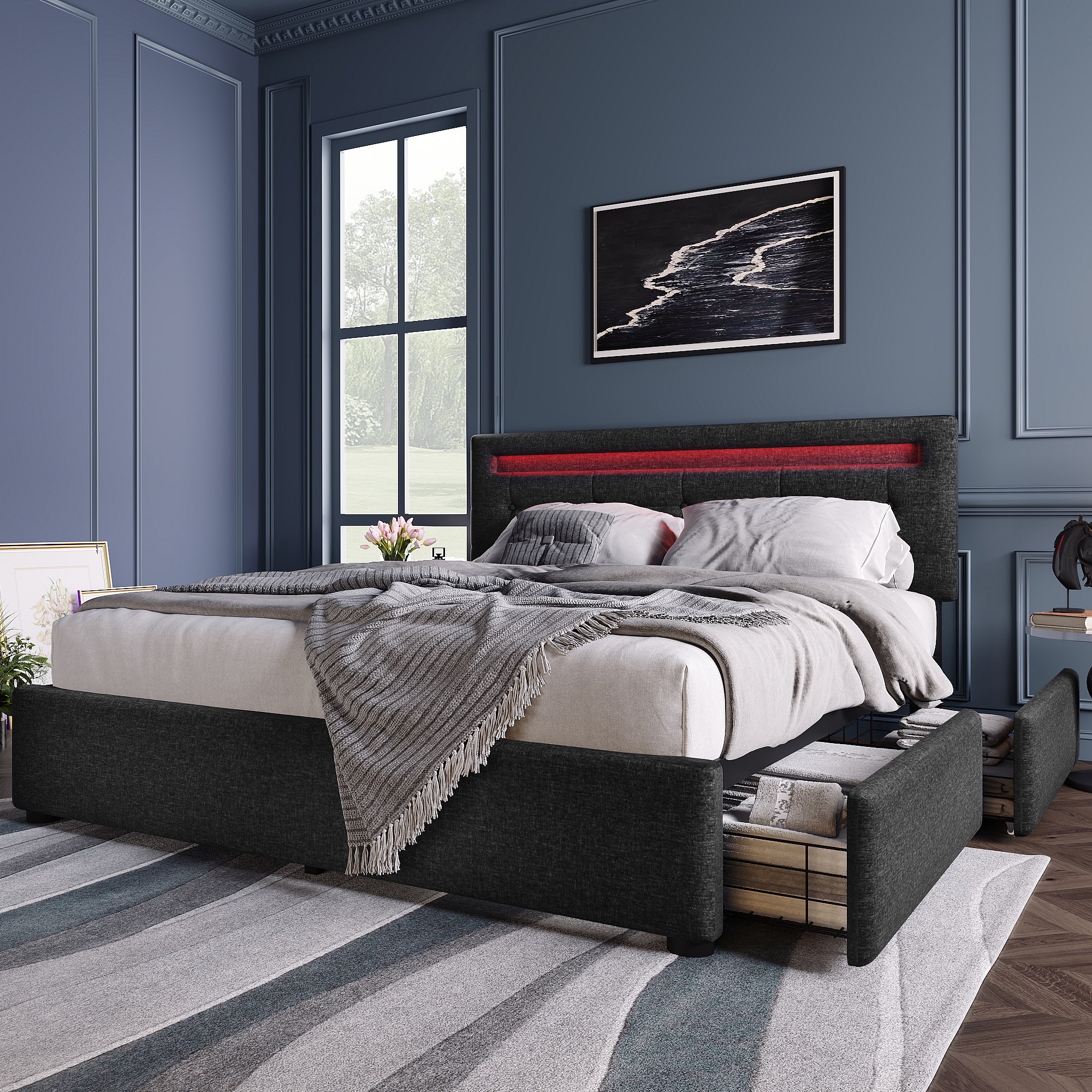 Lit double 140x200 cm avec éclairage LED et 4 tiroirs, tête de lit réglable en hauteur, noir