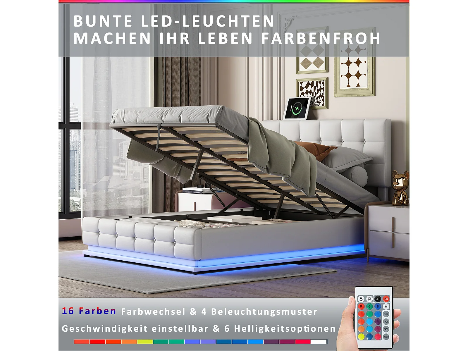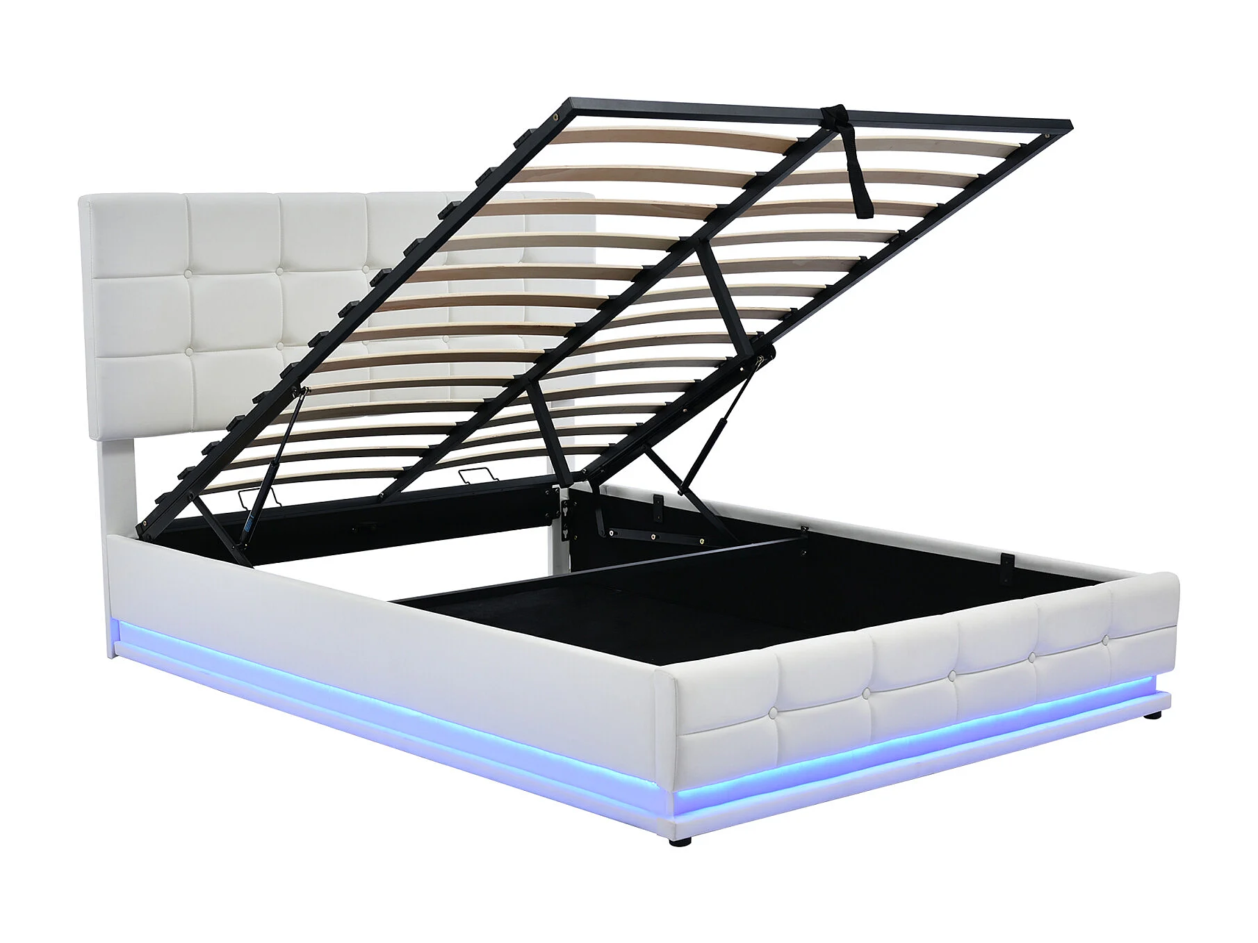Lit double 140x200 cm avec éclairage LED - tête de lit réglable en hauteur - espace de rangement hydraulique et sommier à lattes - PU - blanc