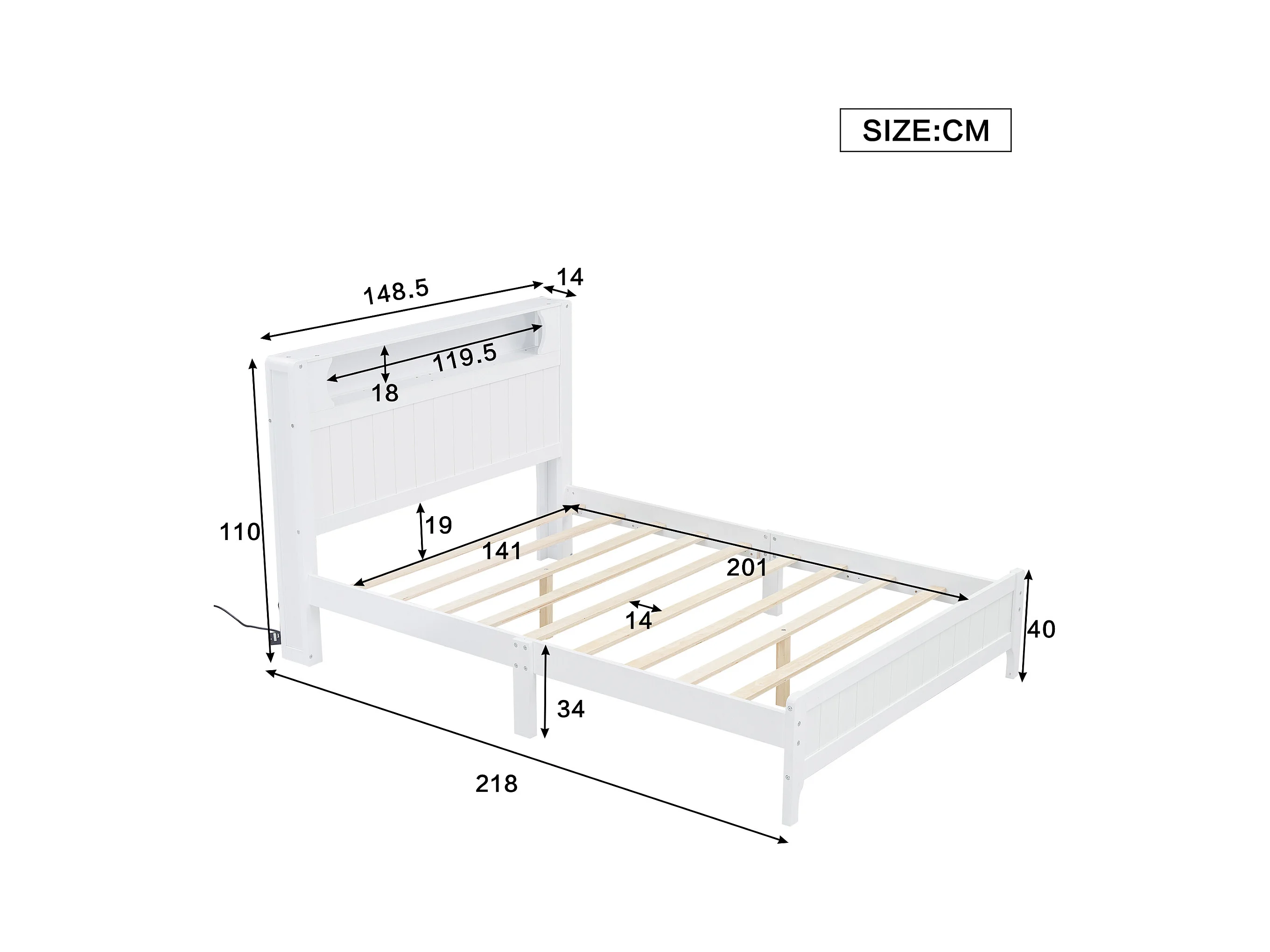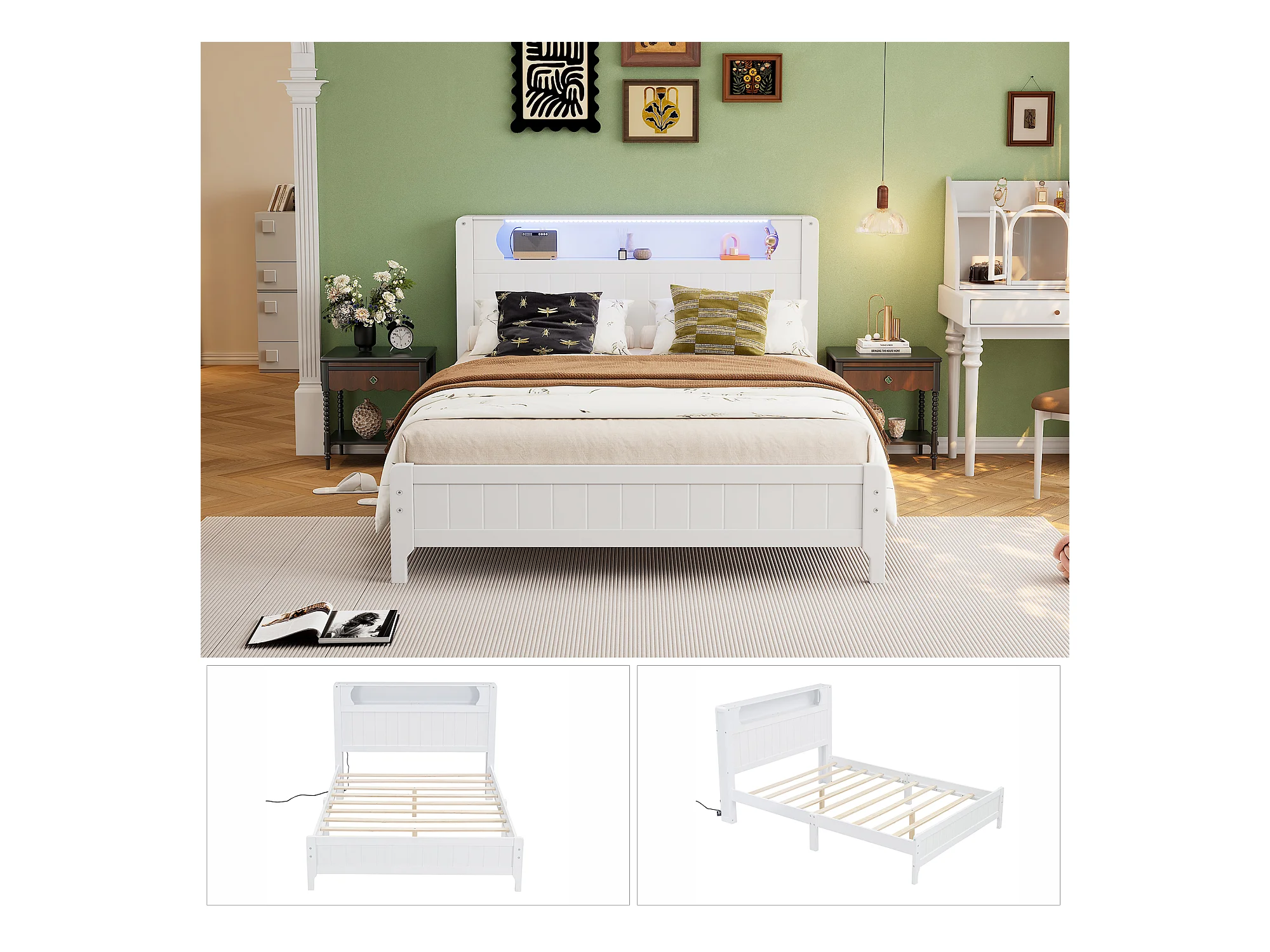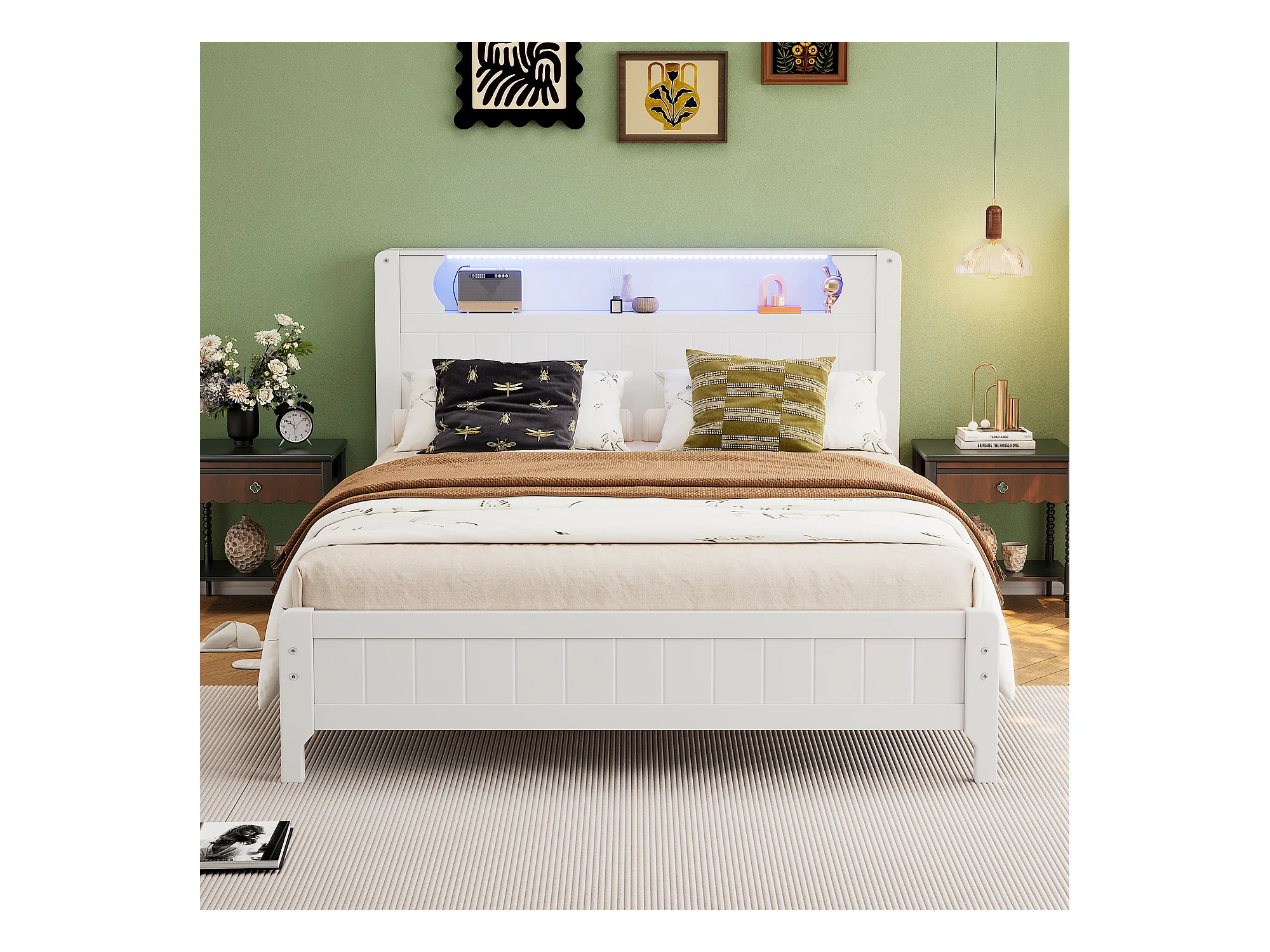 Lit double 140x200 cm avec étagère ouverte et bande lumineuse, lit plateforme en pin blanc et MDF - Pour adolescents et adultes