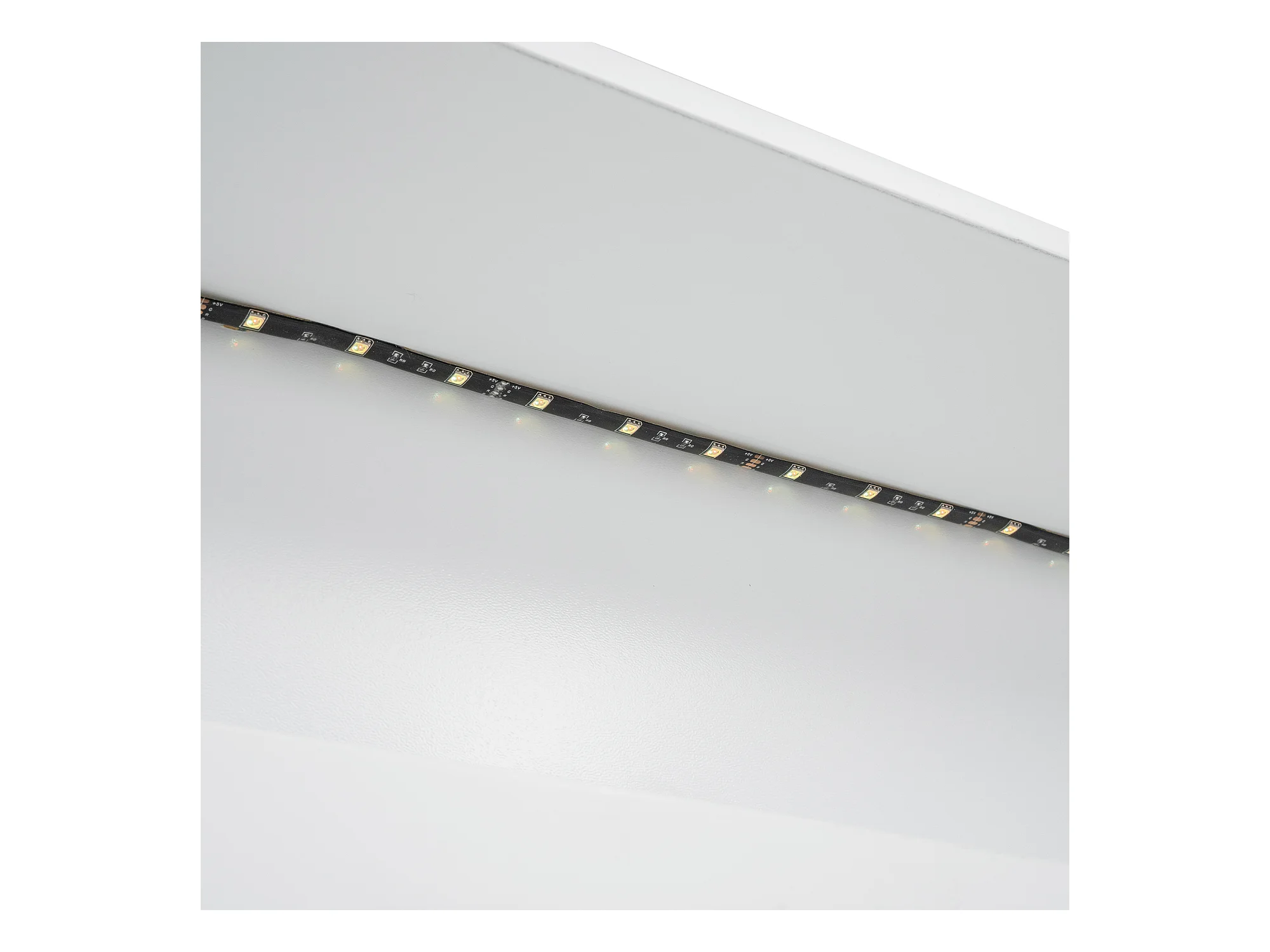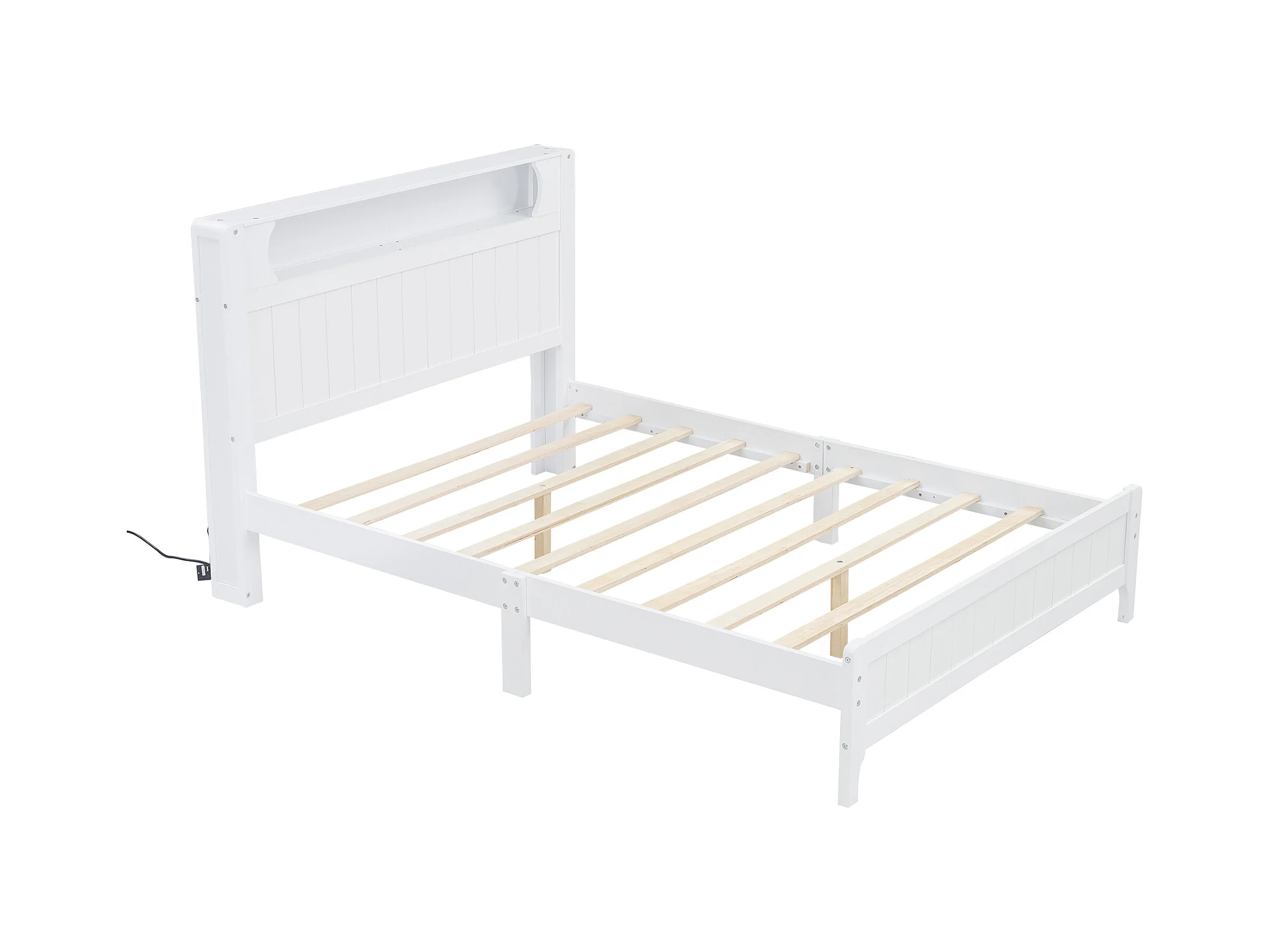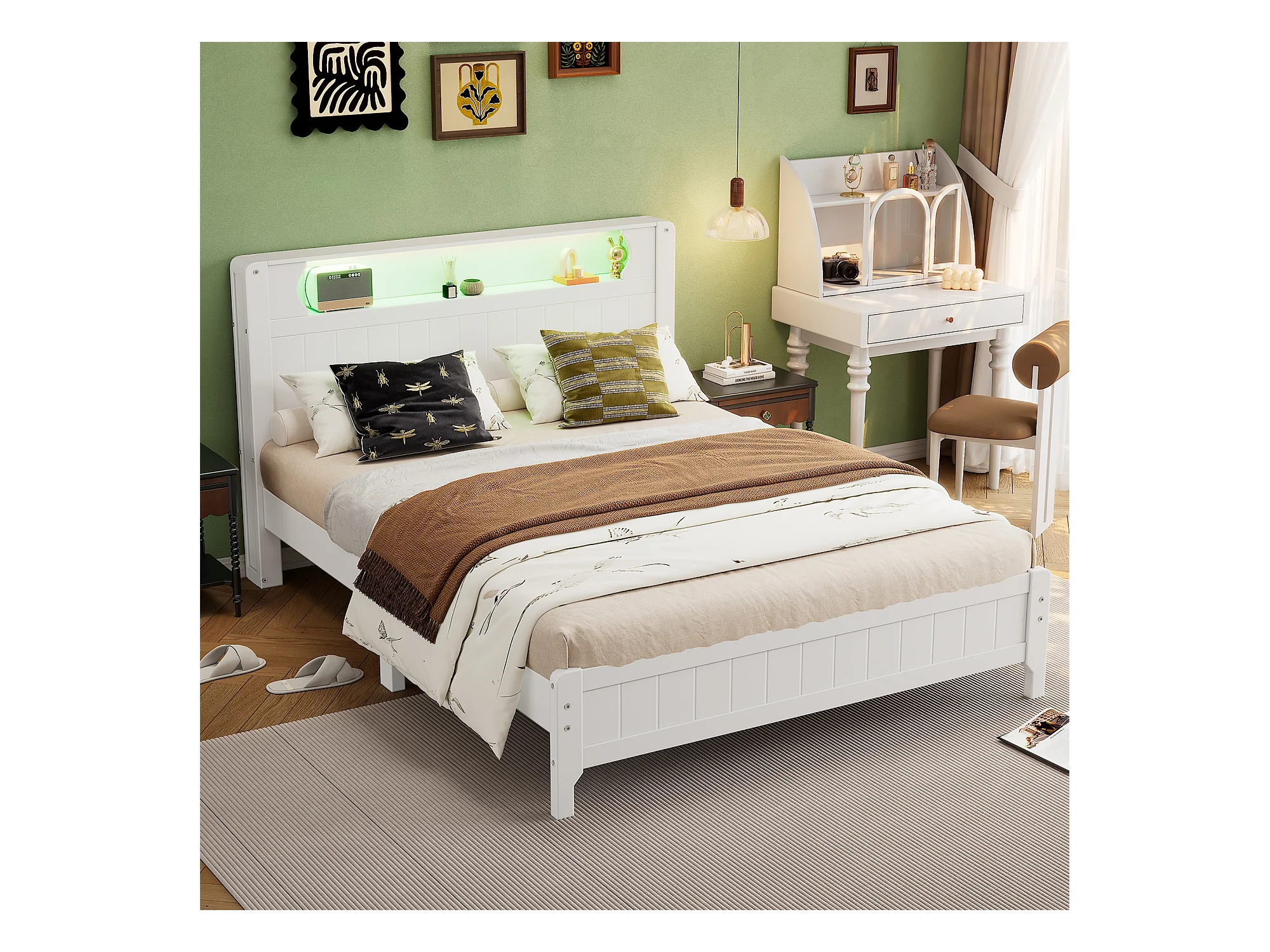 Lit double 140x200 cm avec étagère ouverte et bande lumineuse, lit plateforme en pin blanc et MDF - Pour adolescents et adultes