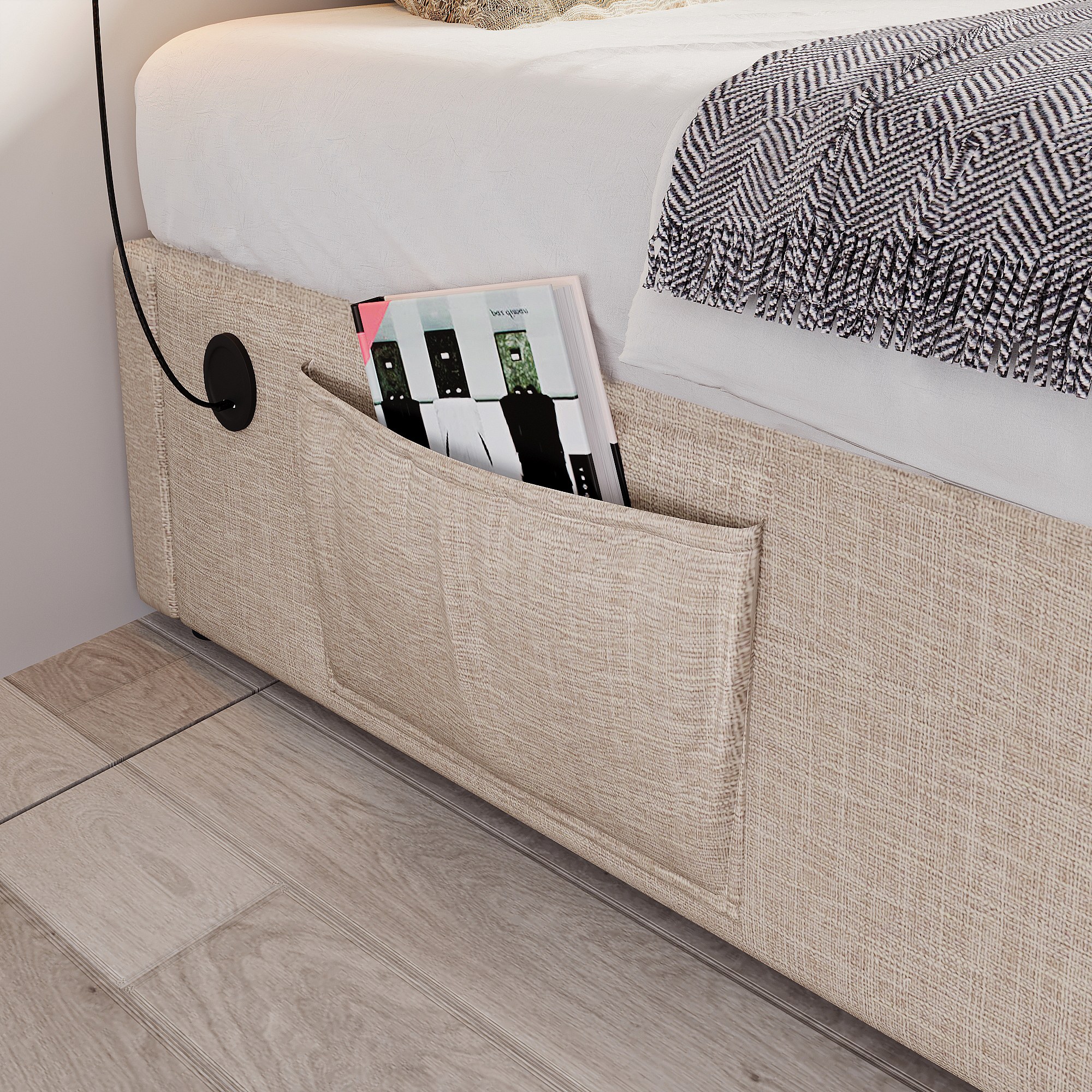 Lit double 140×200 cm avec rangement hydraulique, USB et sommier en bois massif, sans tête de lit, lin naturel