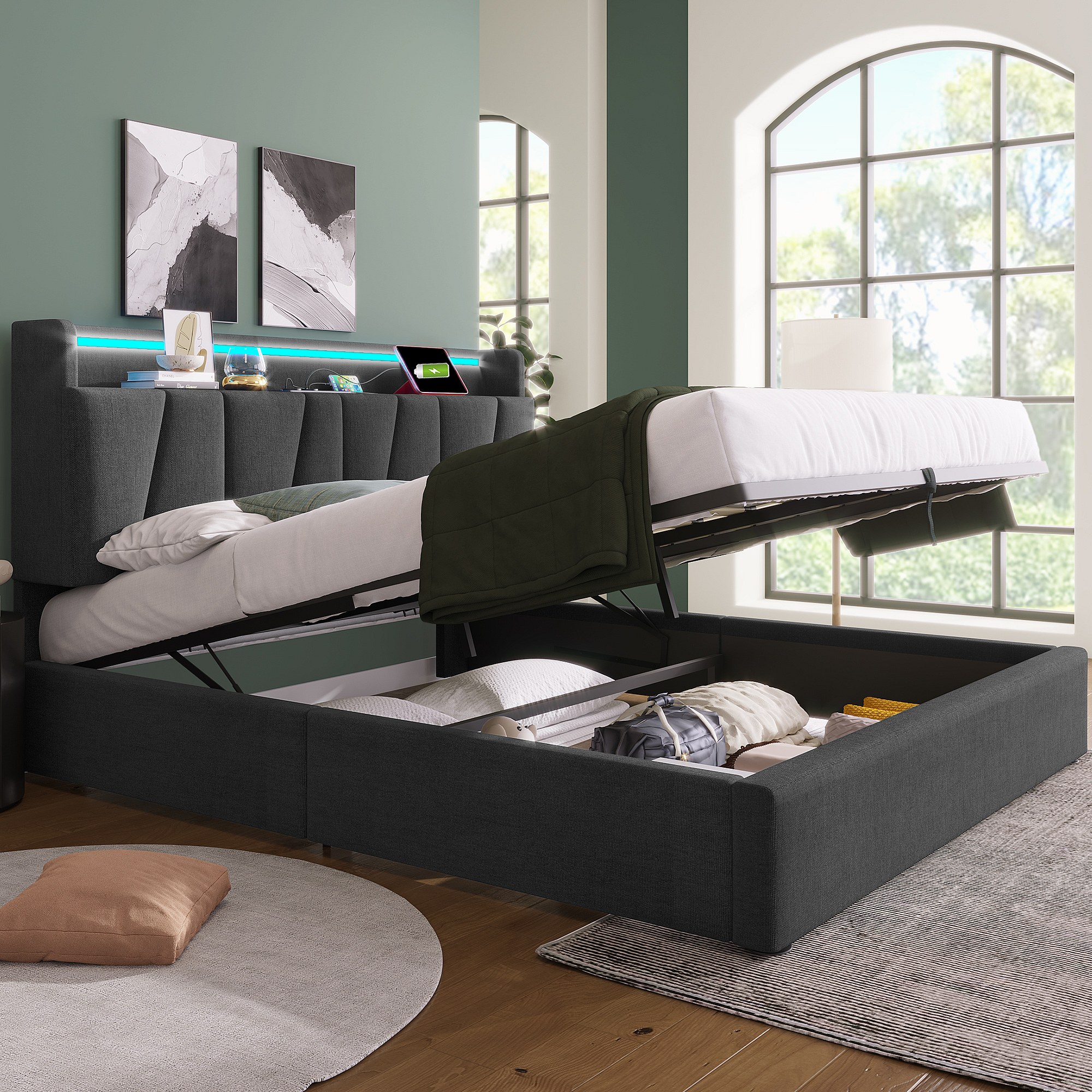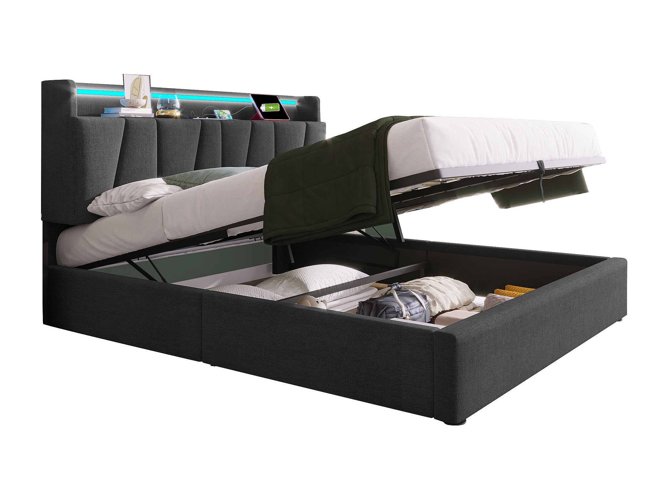Lit double 140x200 cm avec tête de lit de rangement, prises USB et éclairage LED RGBW