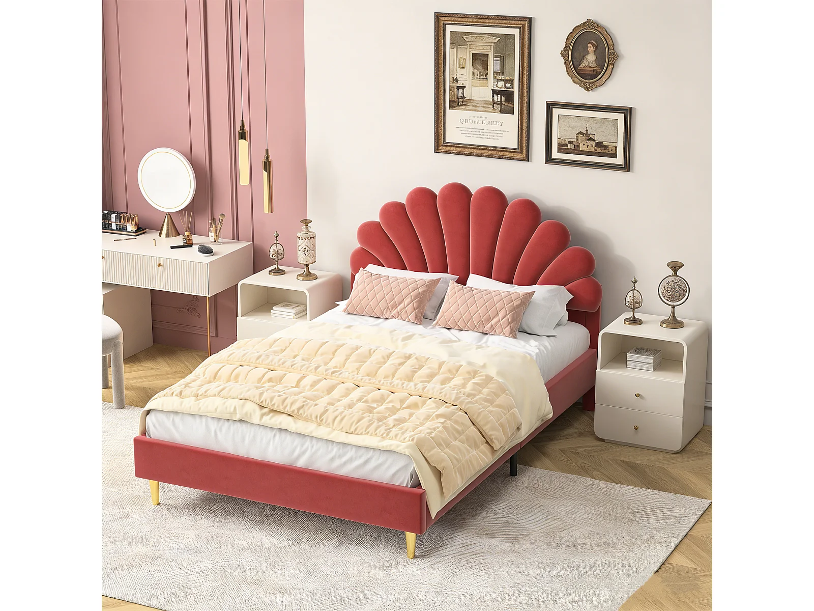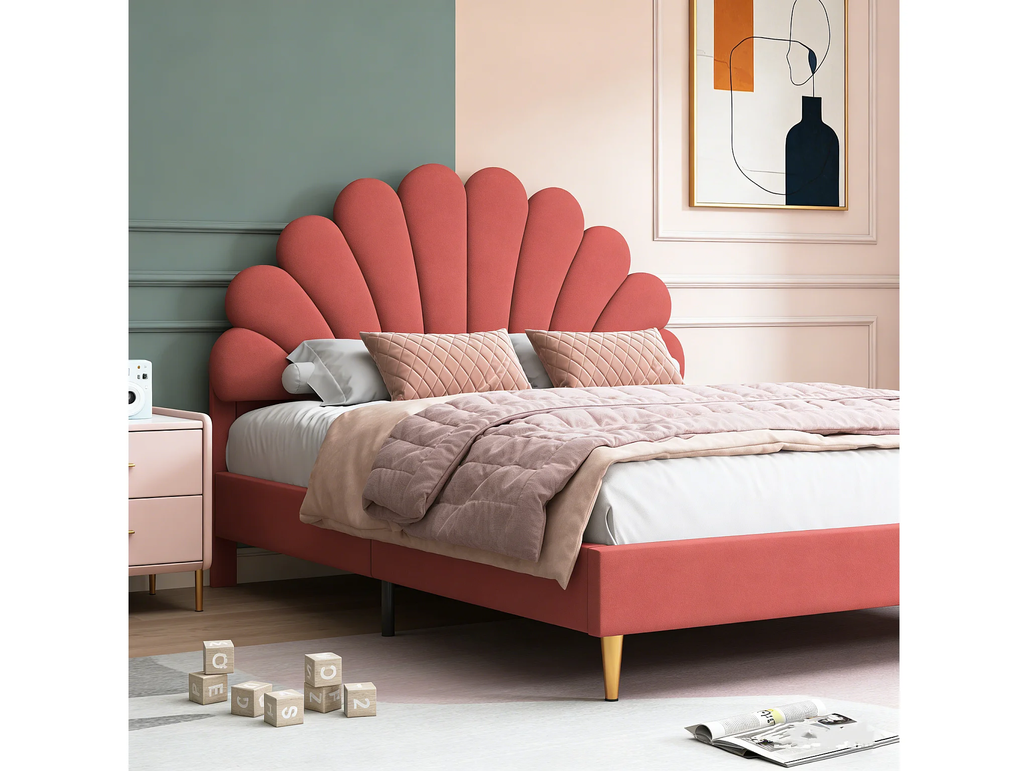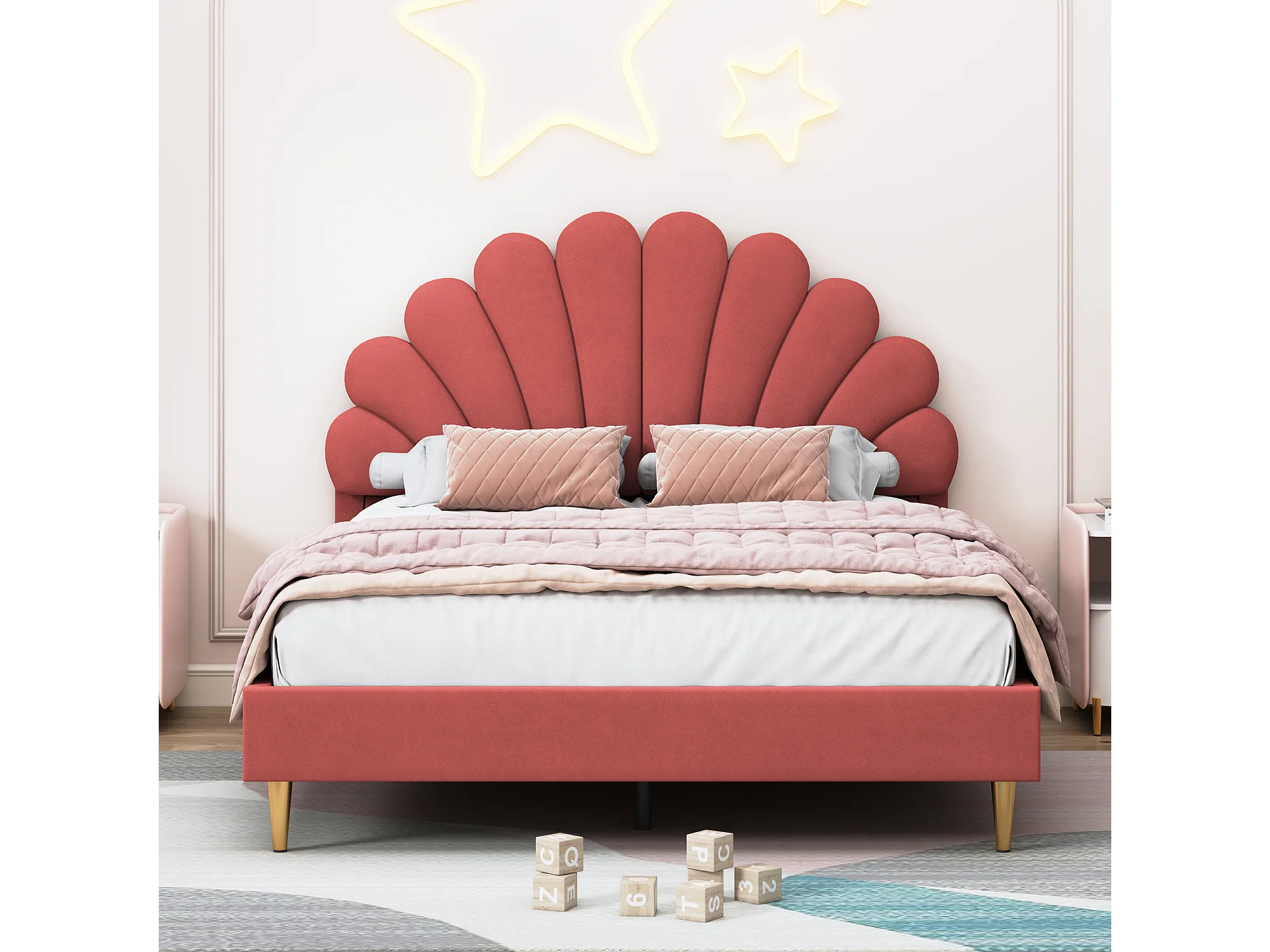 Lit Double 140x200 cm avec Tête de Lit en Forme de Fleur, Cadre de Lit Robuste avec Sommier à Lattes,Bordeaux