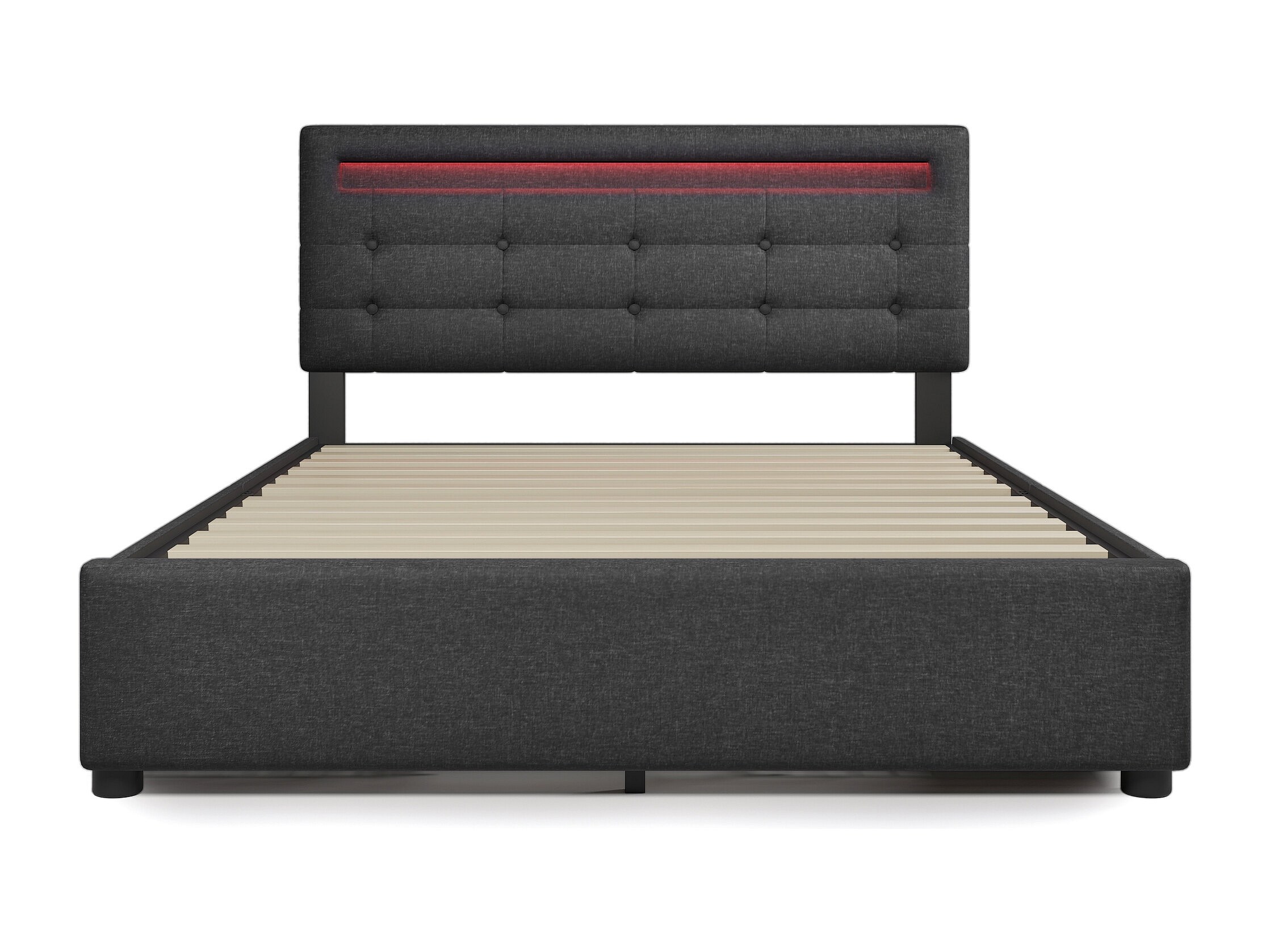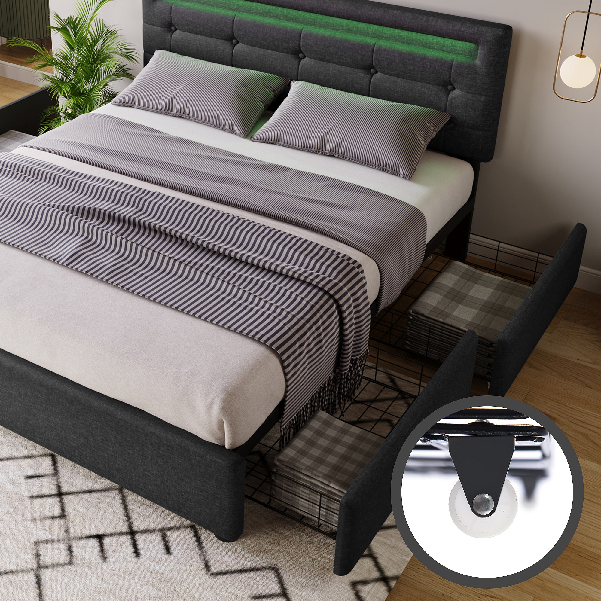 Lit double 140x200 cm en gris avec éclairage LED et 4 tiroirs de rangement, tête de lit réglable