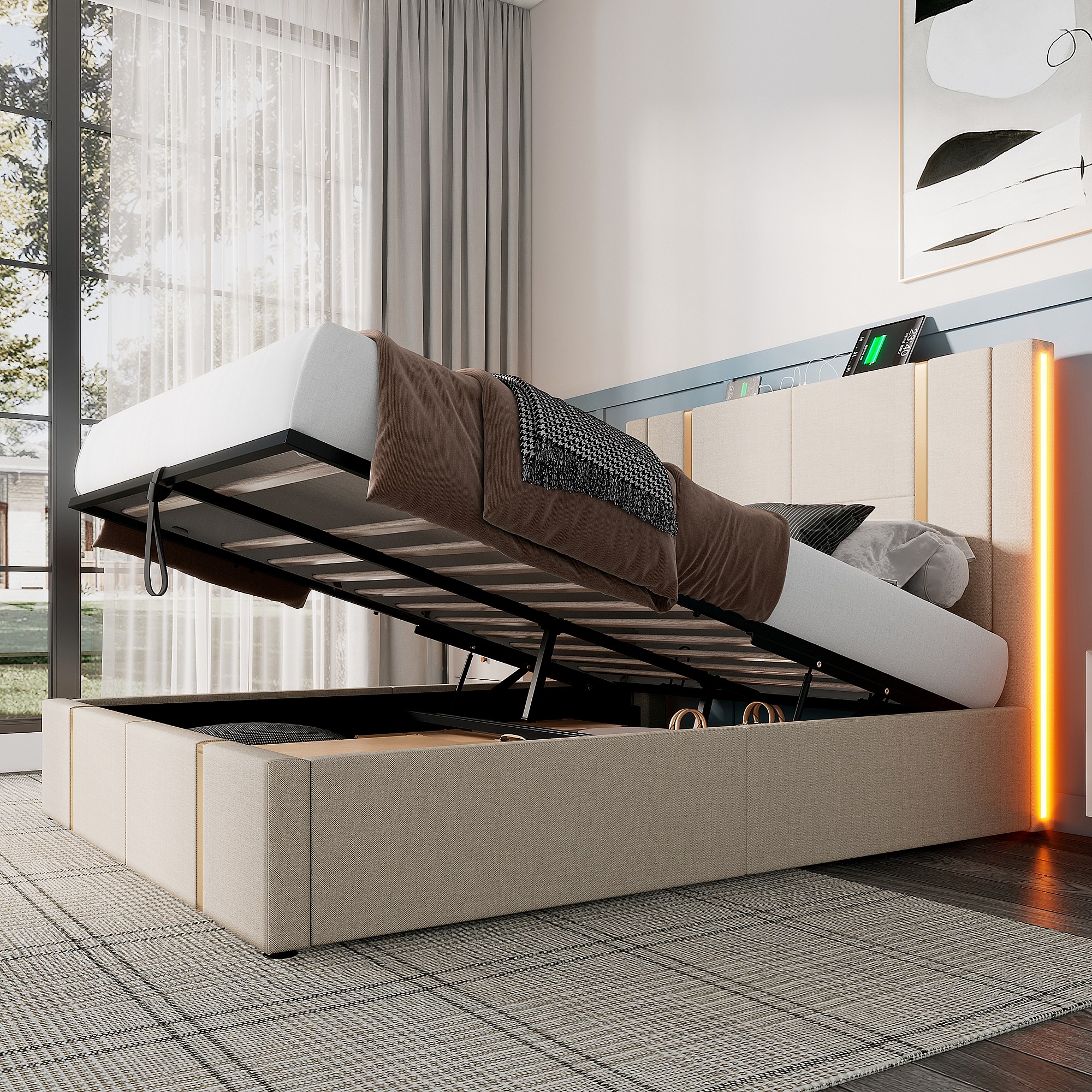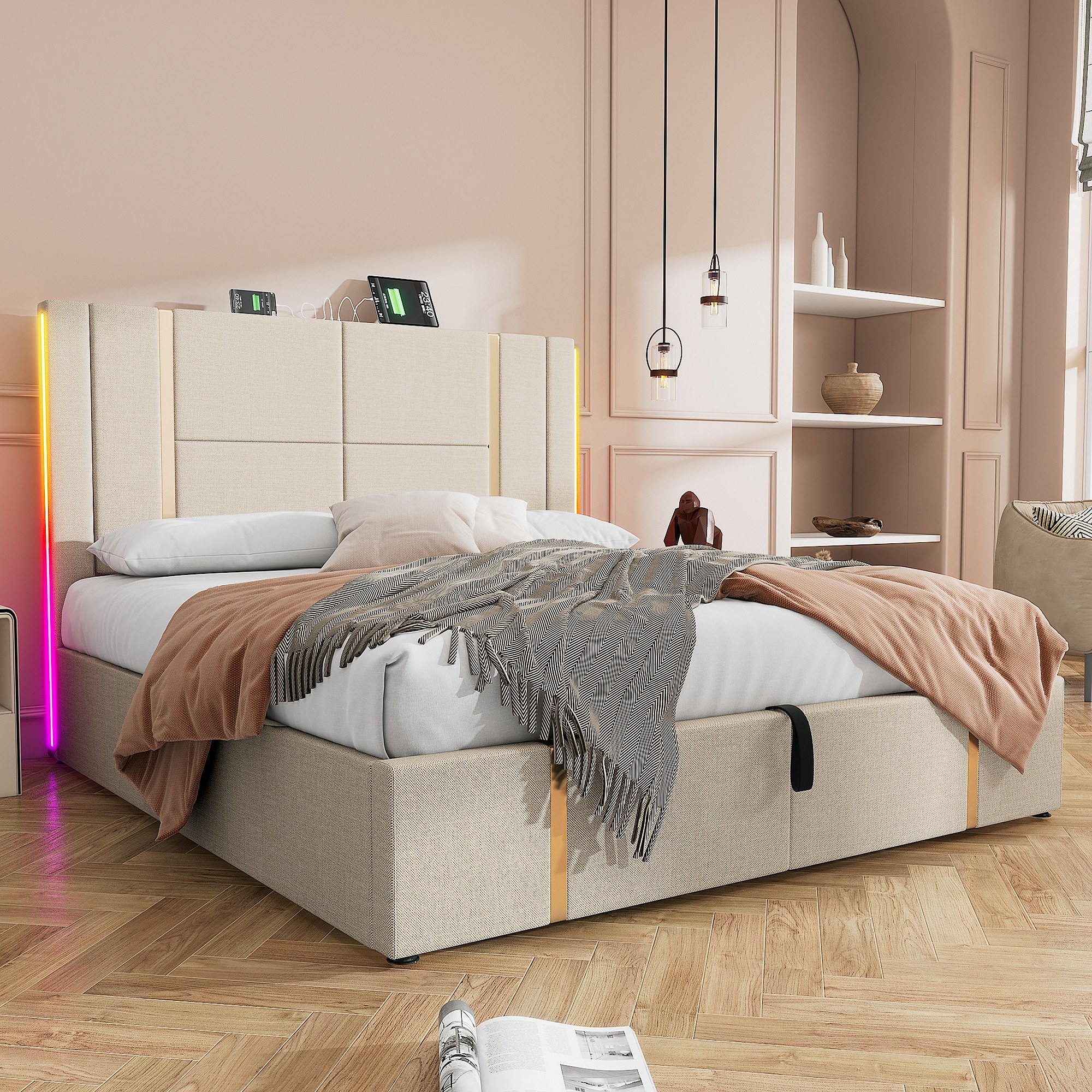 Lit double 140×200 cm en lin beige avec éclairage LED et fonction de chargement USB Type C