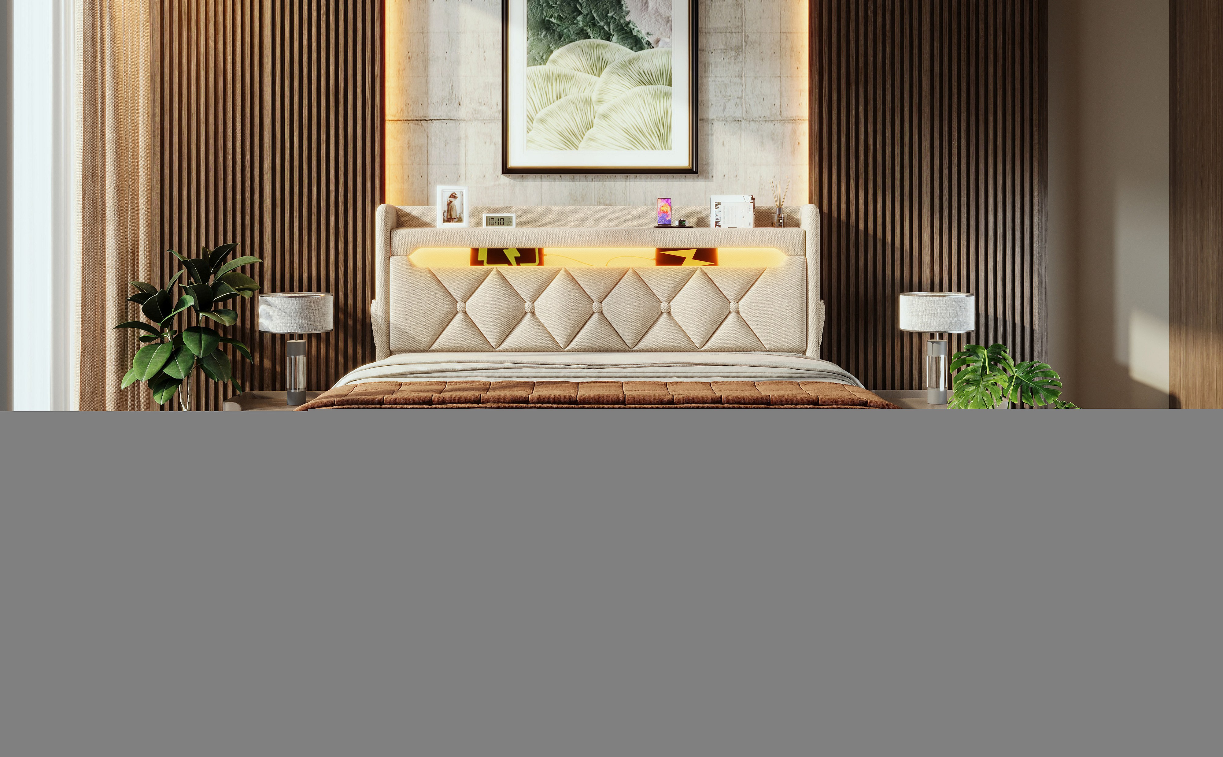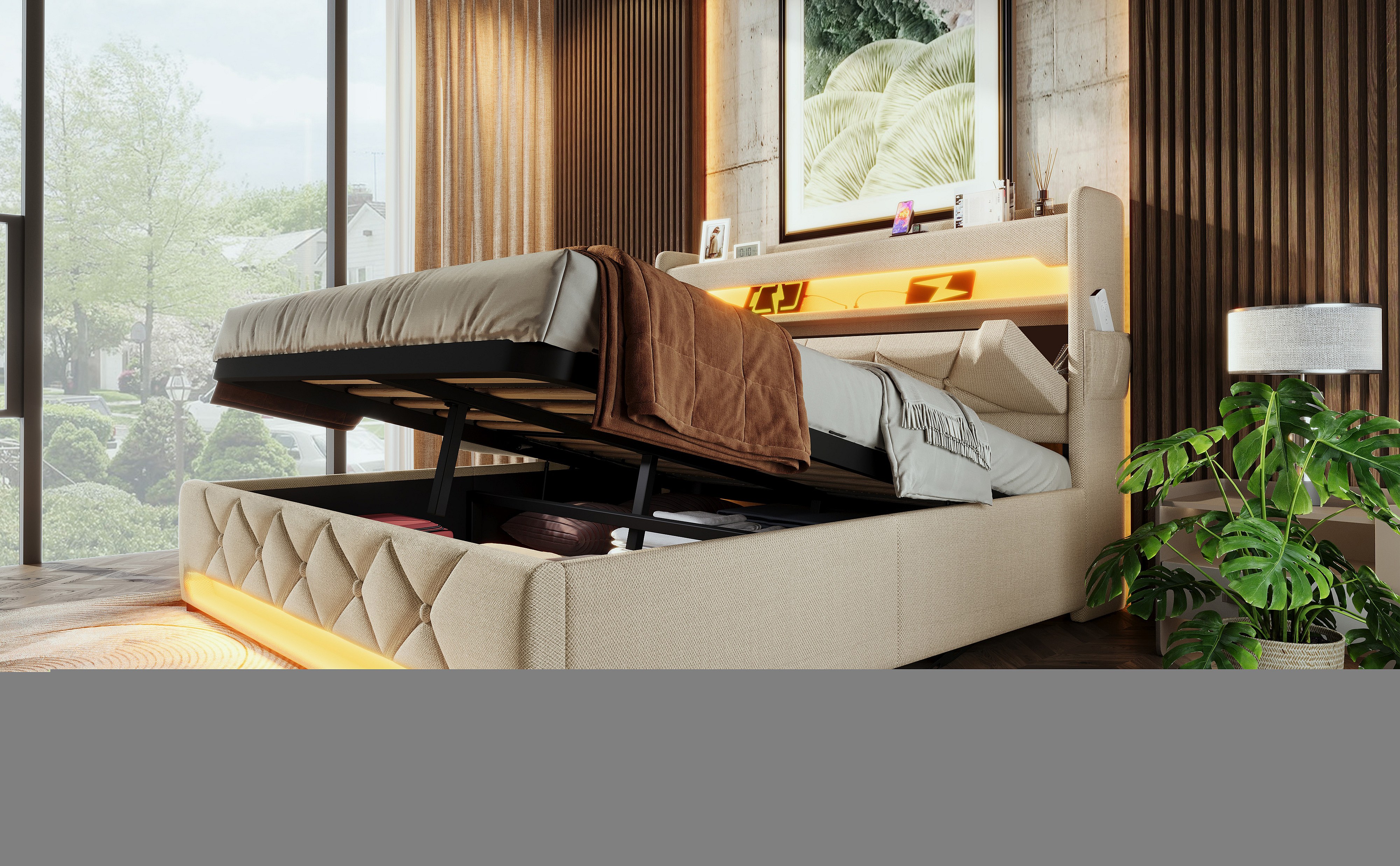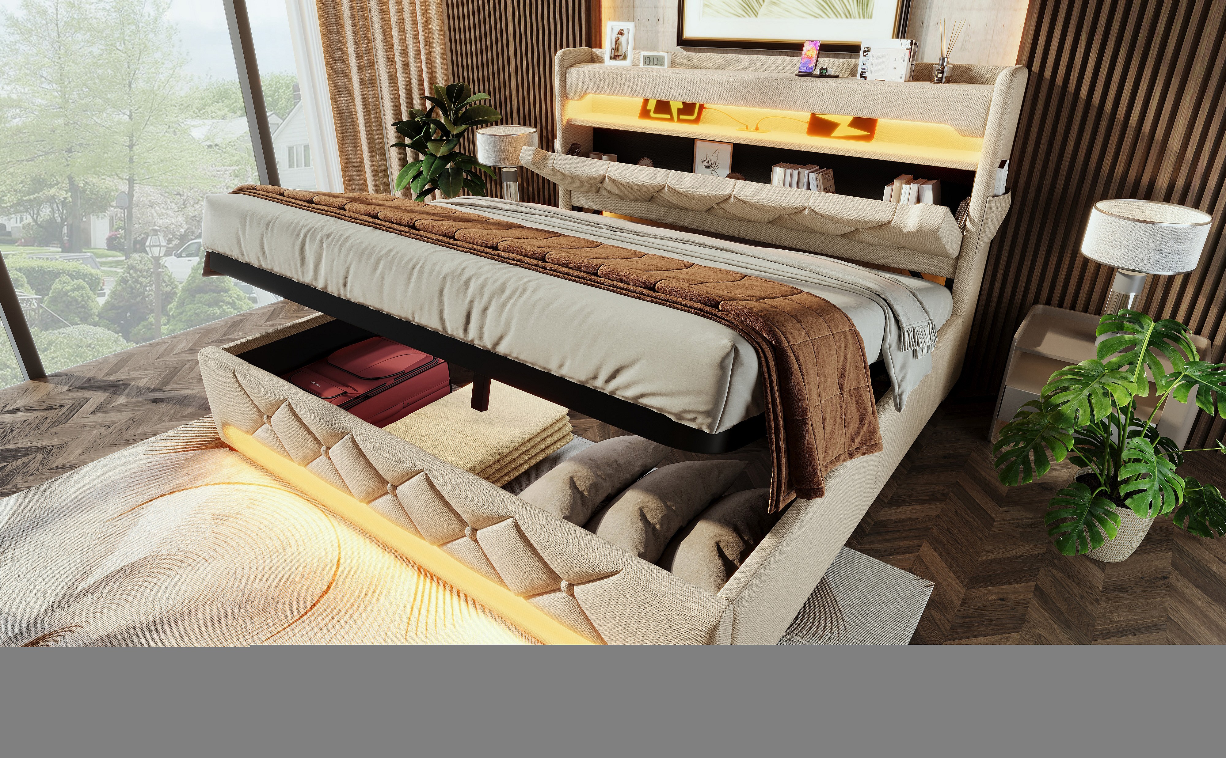Lit double 140×200 cm en lin beige avec tête de lit de rangement et ports USB