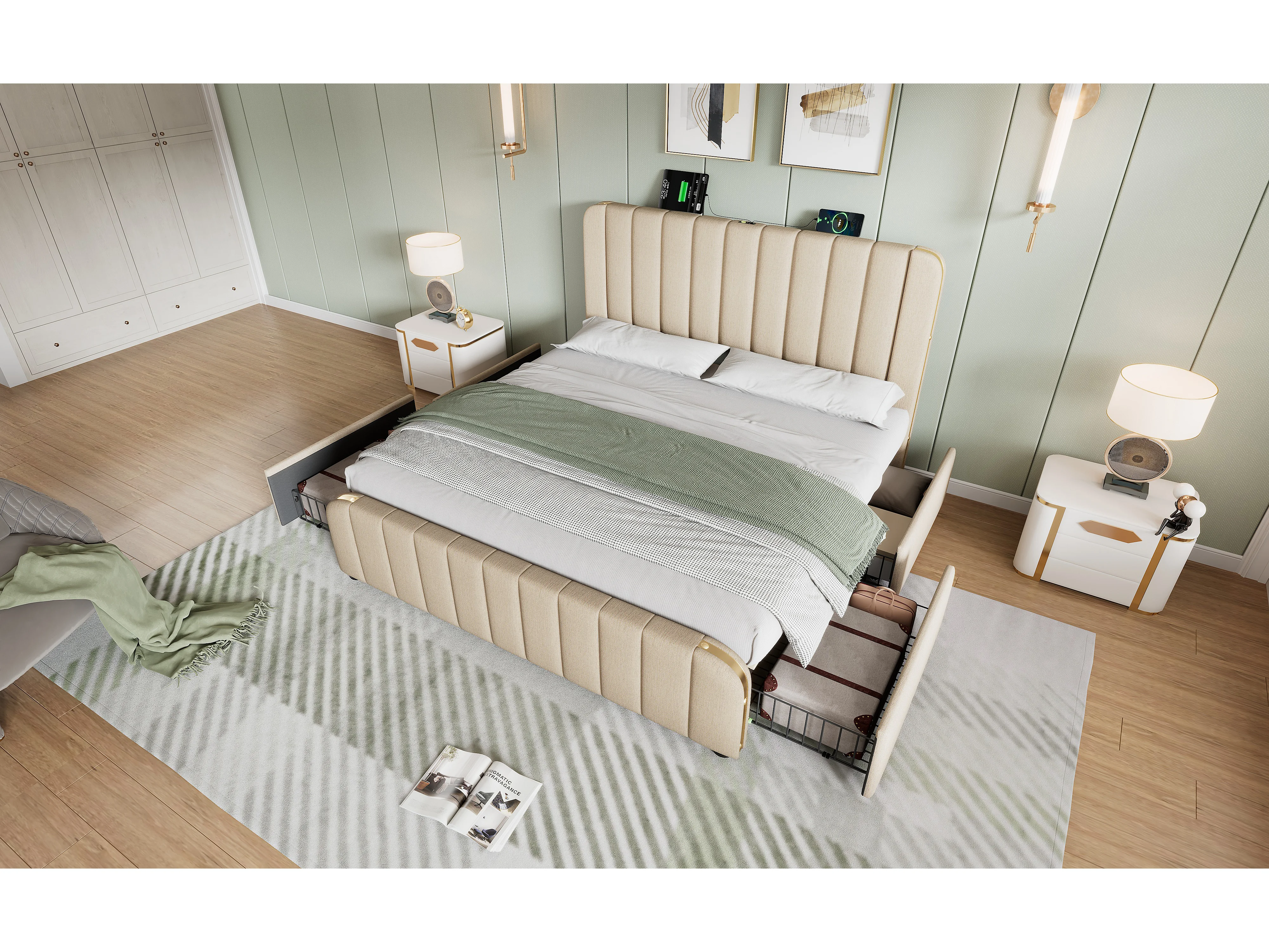 Lit double 140×200 cm en lin beige avec tête de lit rembourrée et 4 tiroirs, USB Type-C intégré