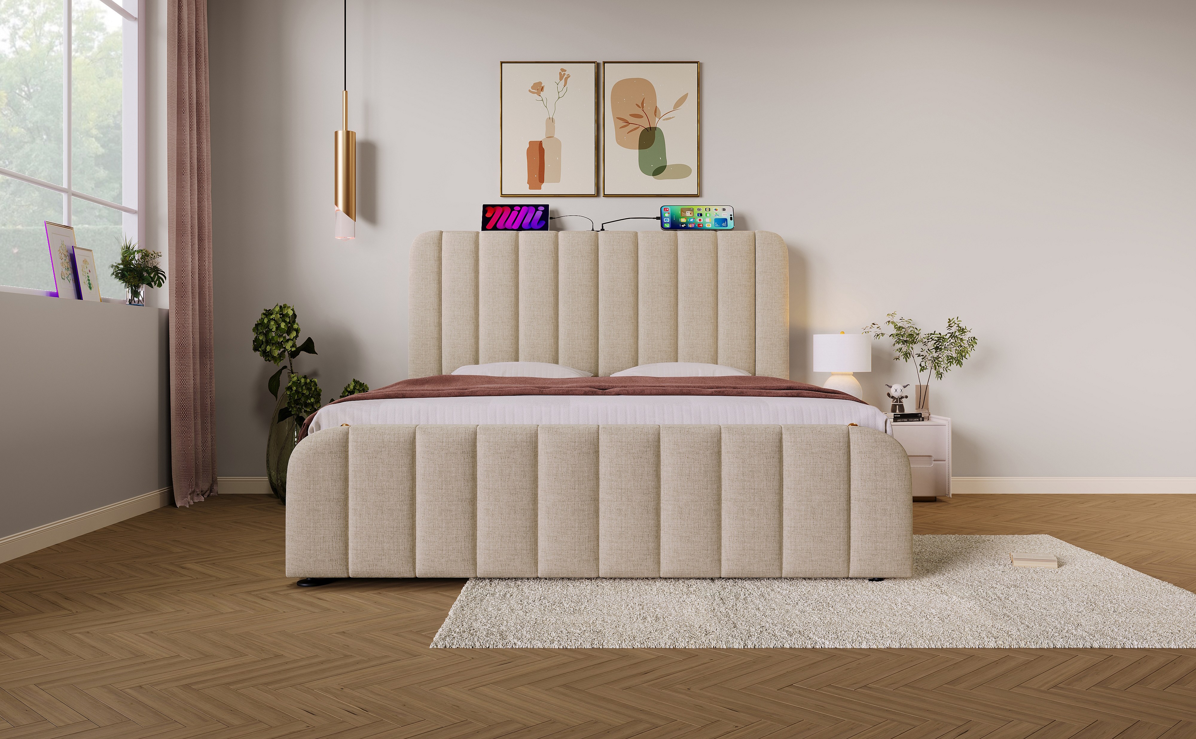 Lit double 140×200 cm en lin beige avec tête de lit rembourrée et ports USB intégrés
