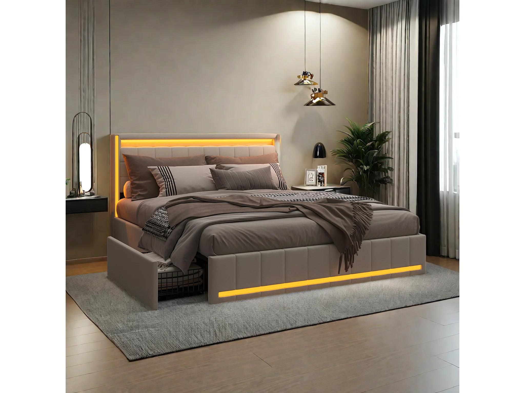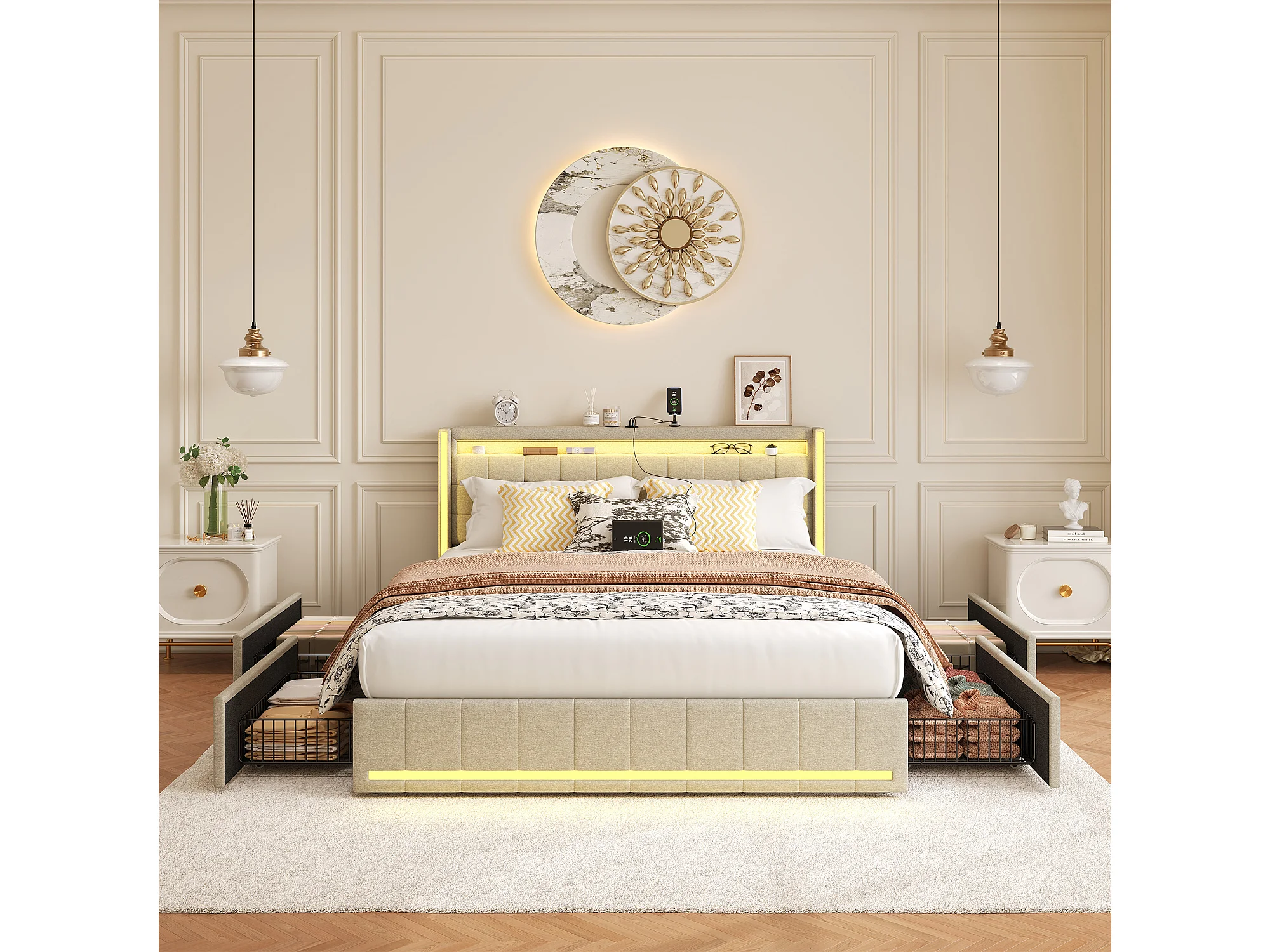 Lit double 140x200 cm en lin beige – Tête et pied de lit avec LED, 4 tiroirs métalliques, ports USB & Type-C