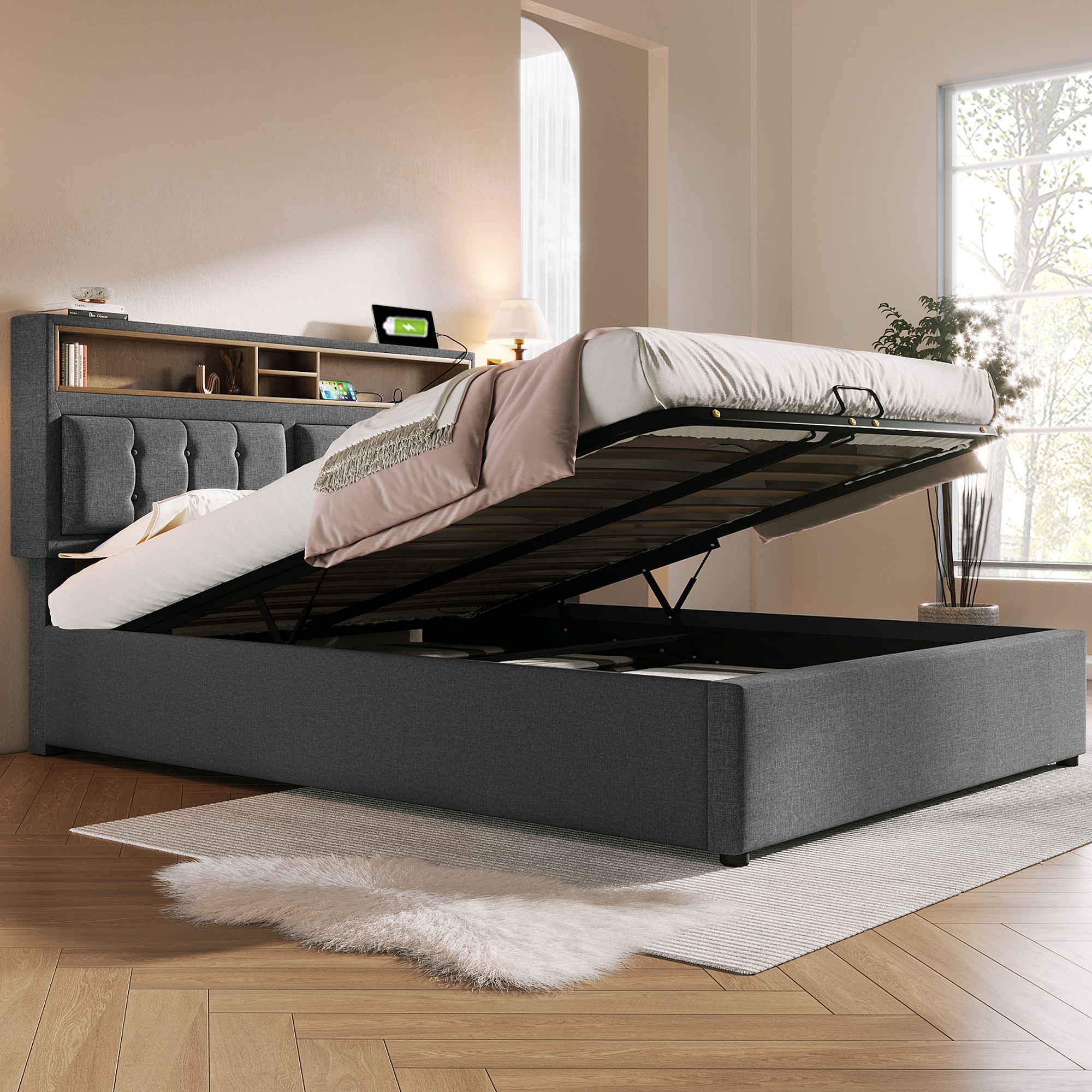 Lit double 140x200 cm en lin gris avec tête de lit réglable et prises USB intégrées