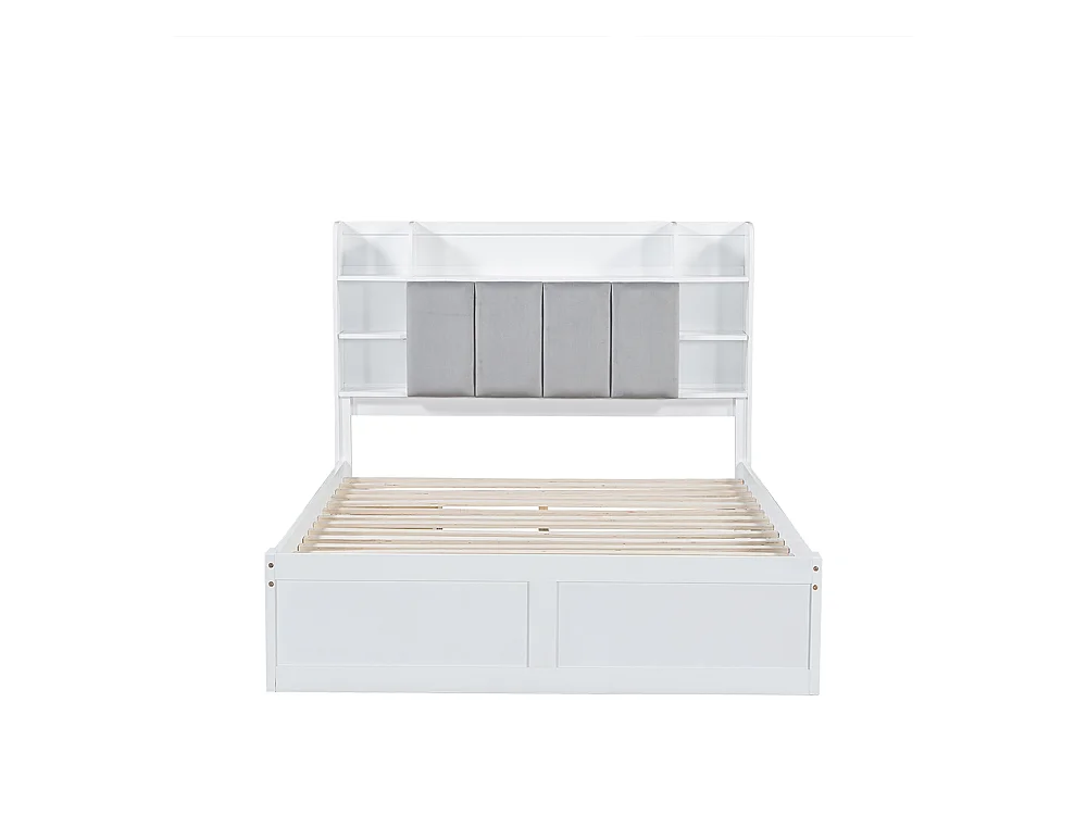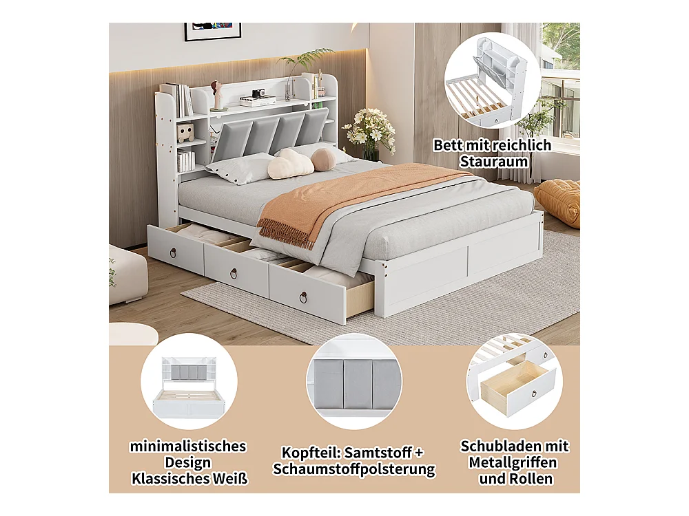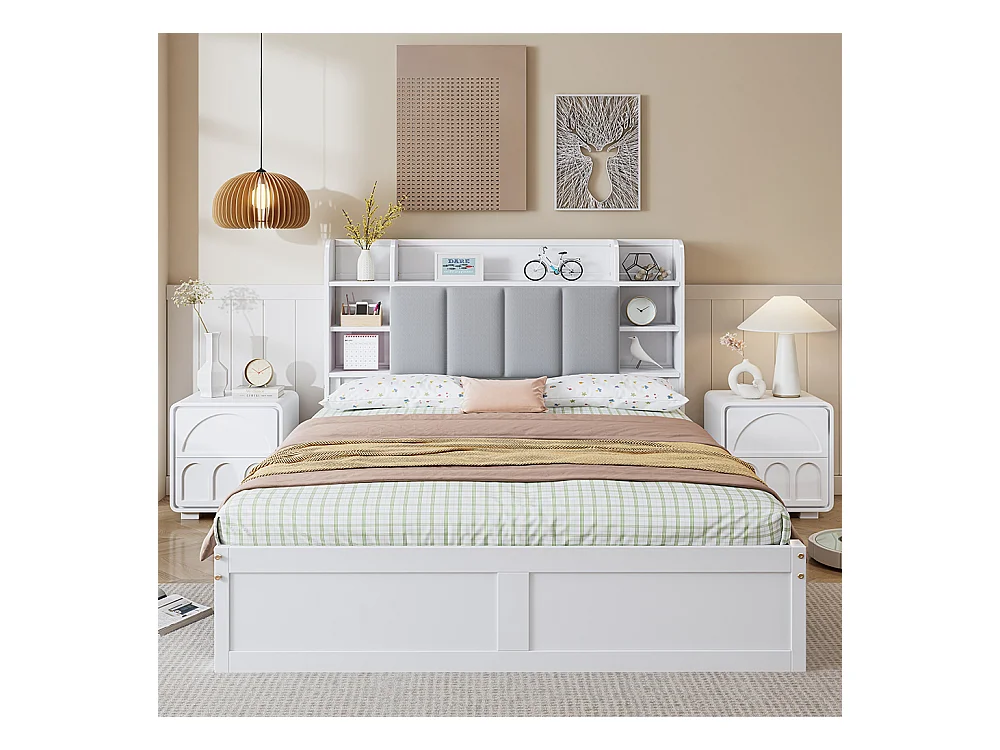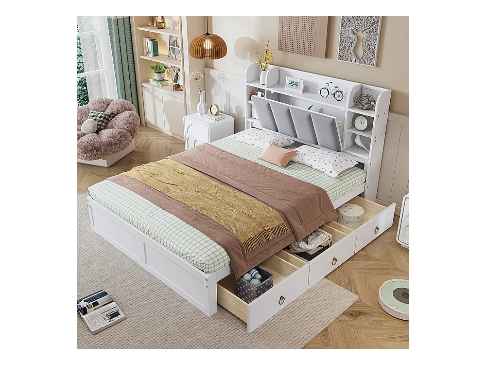 Lit double 140x200 cm Étagère ouverte Trois tiroirs avec roulettes Compartiment de rangement avec porte rabattable Blanc