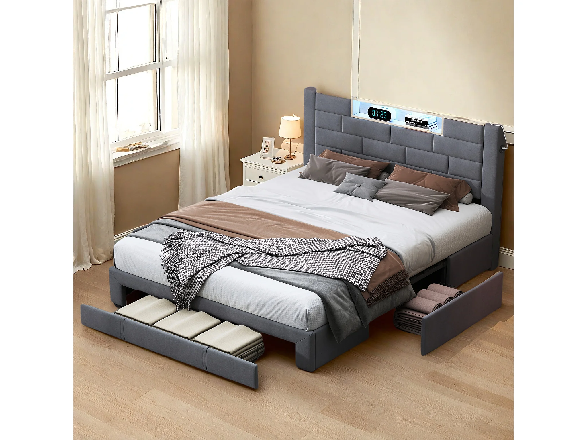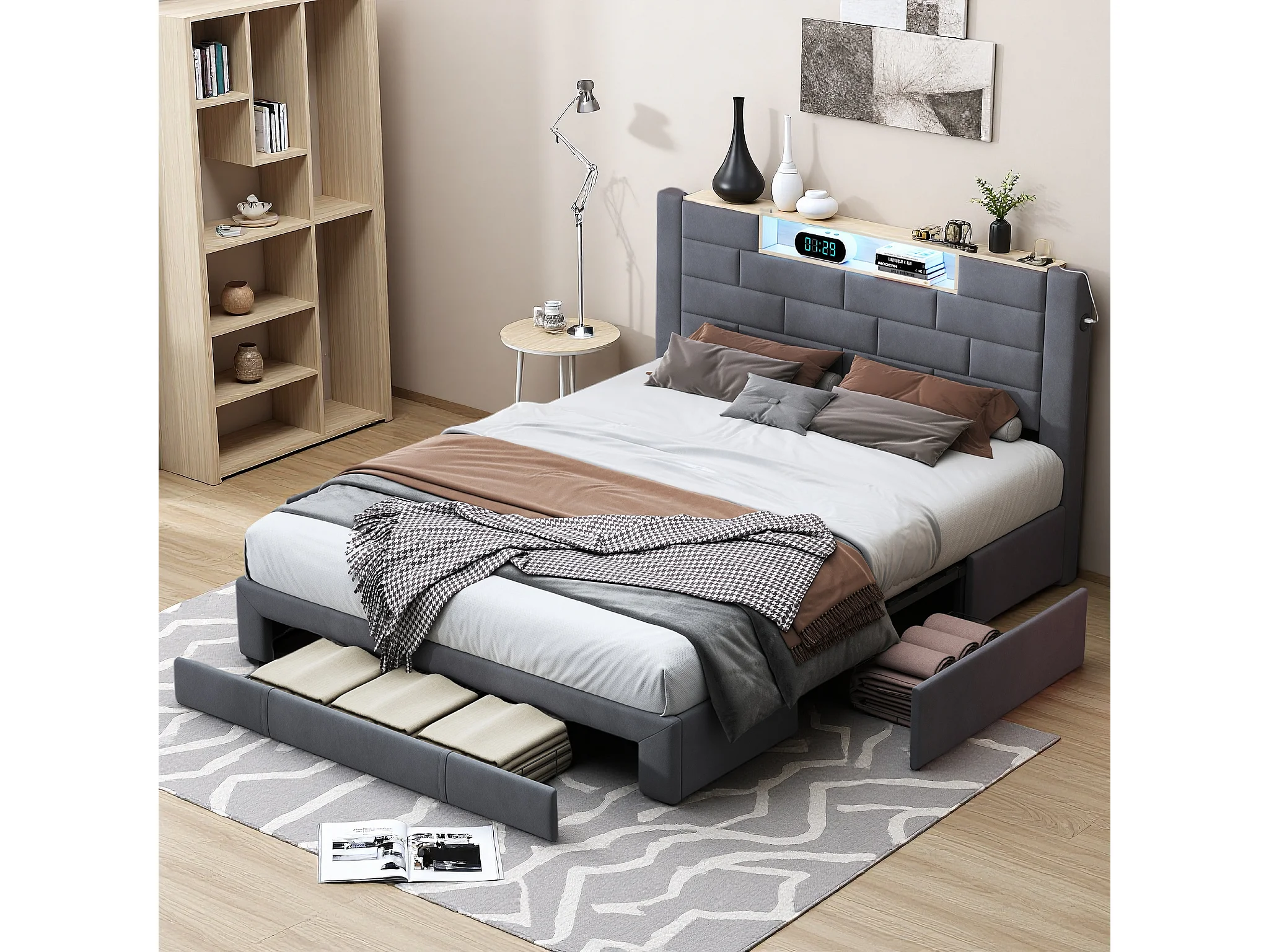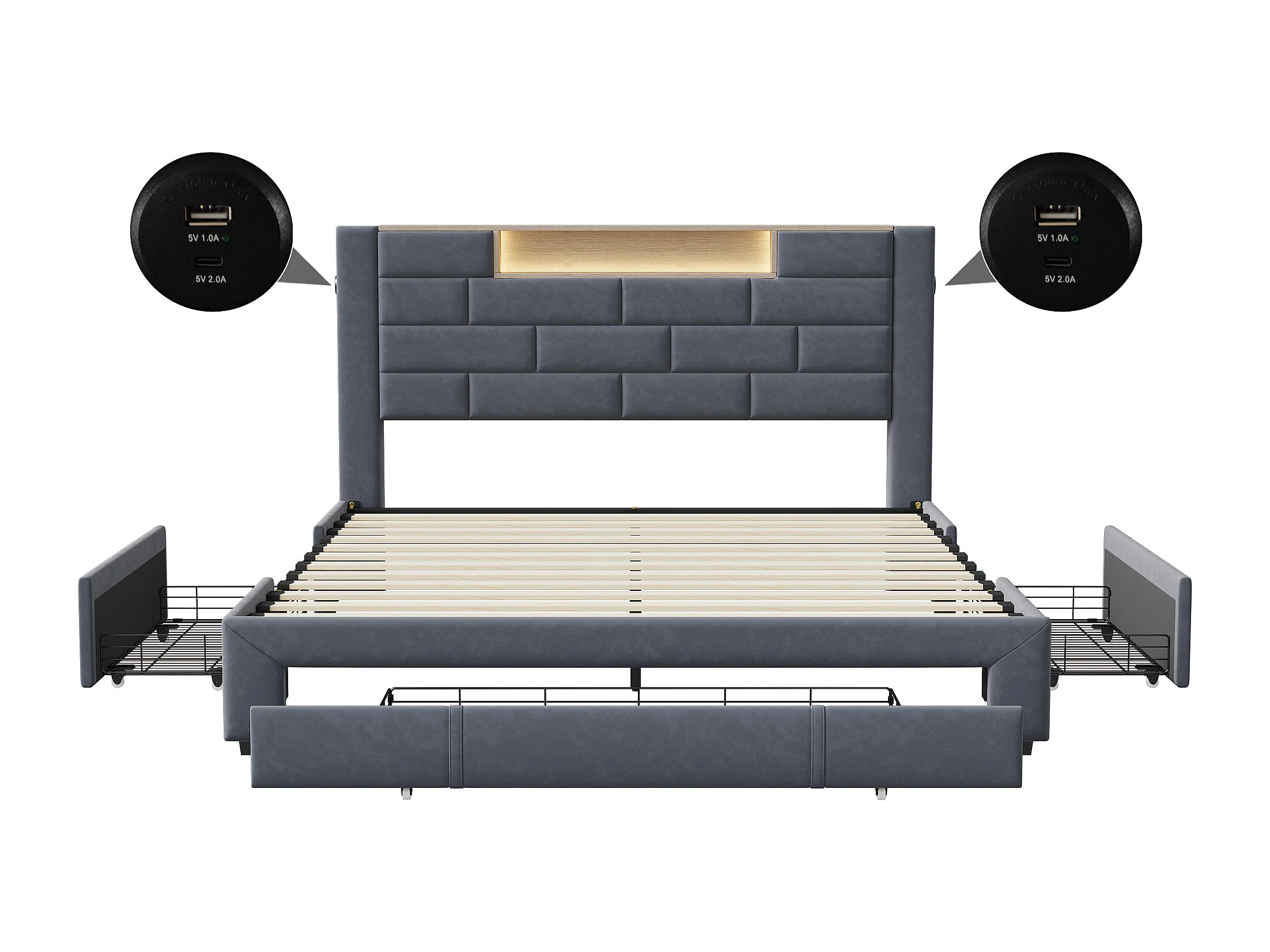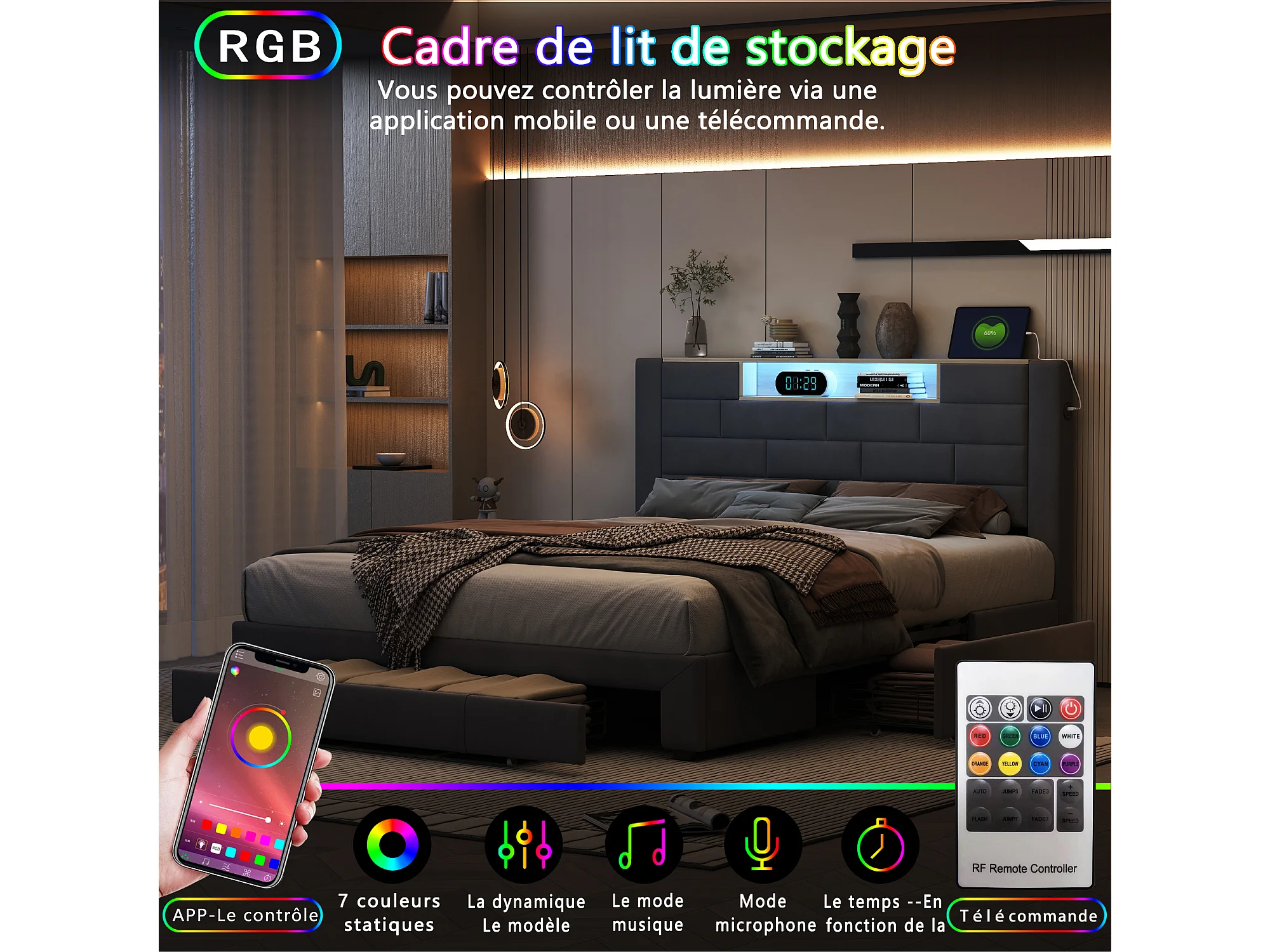 Lit double 140x200 cm - Lit adulte 140x200 cm avec LED et USB - avec 3 tiroirs et tete de lit - Lit 2 personnes - Tissu - Gris