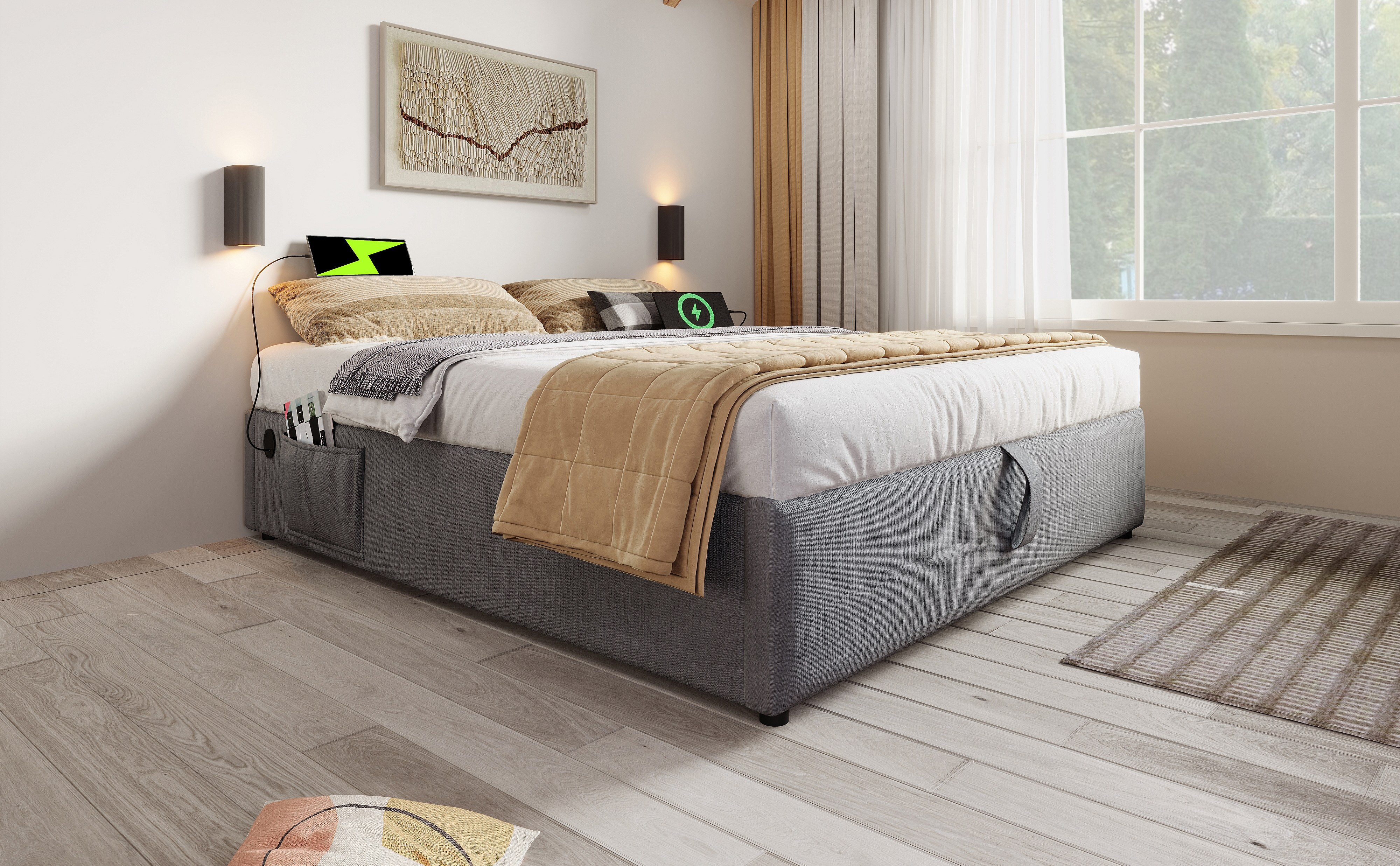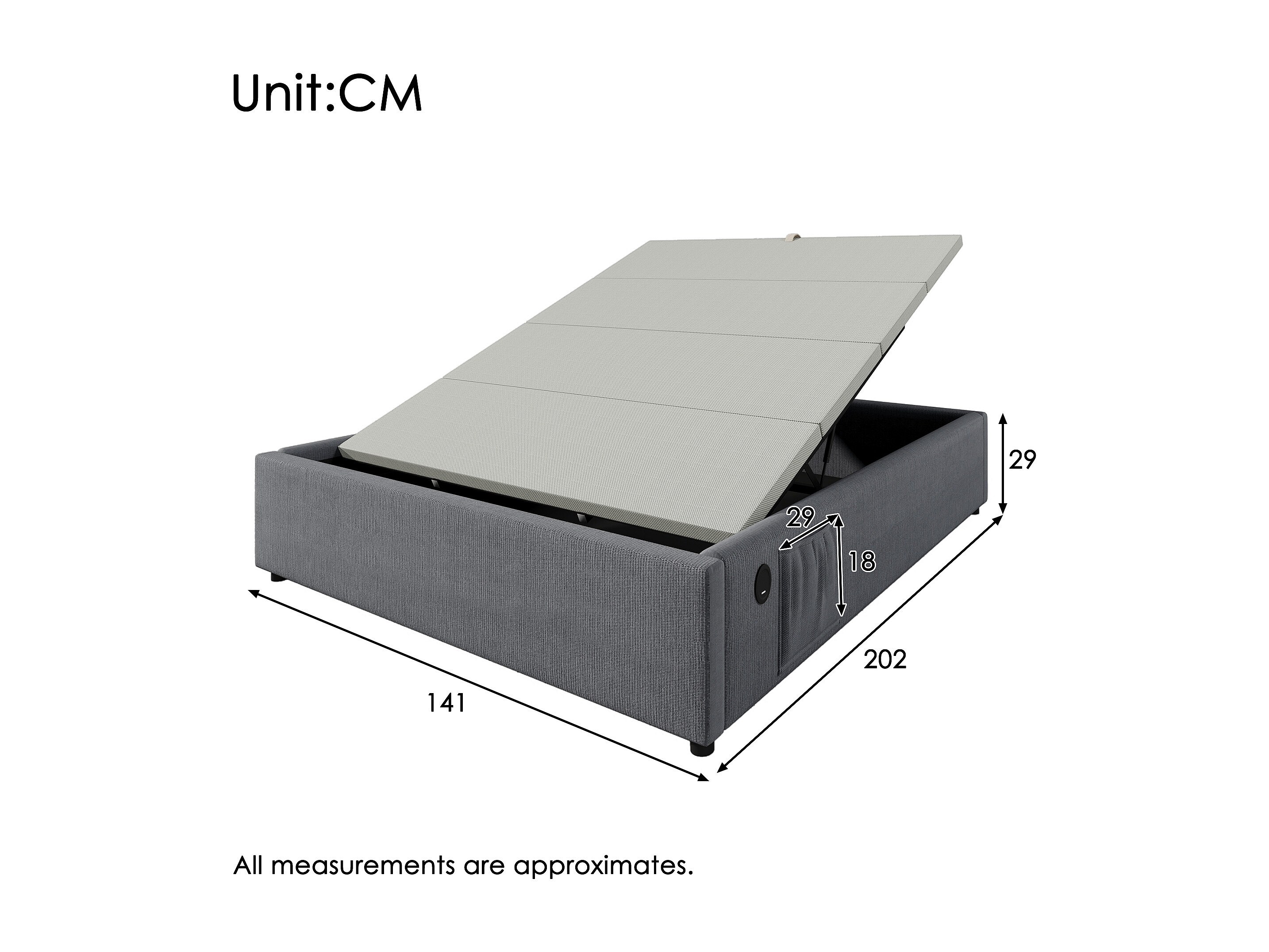 Lit double 140×200 cm, lit de rangement avec USB-C et sommier à lattes en bois massif, sans tête de lit, gris