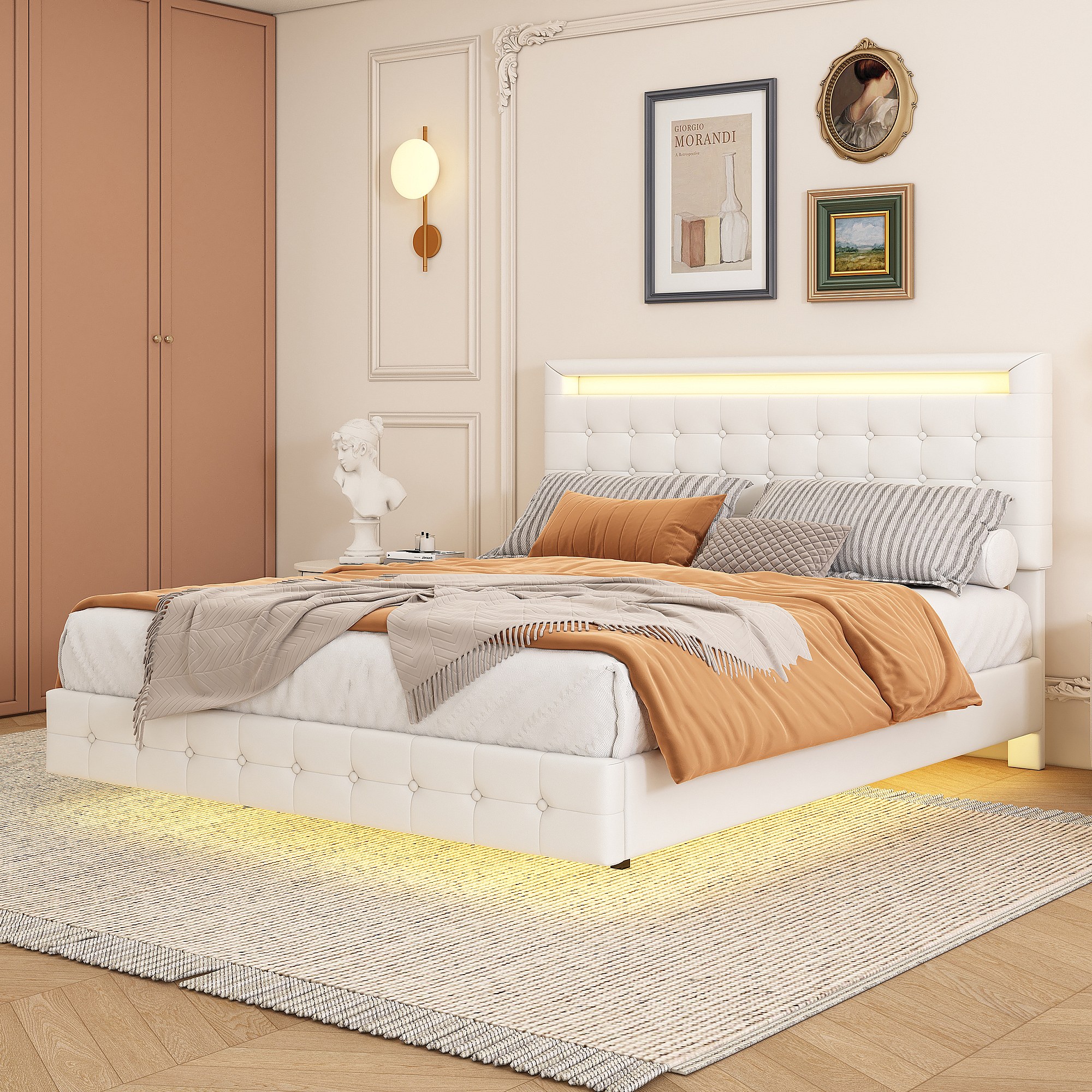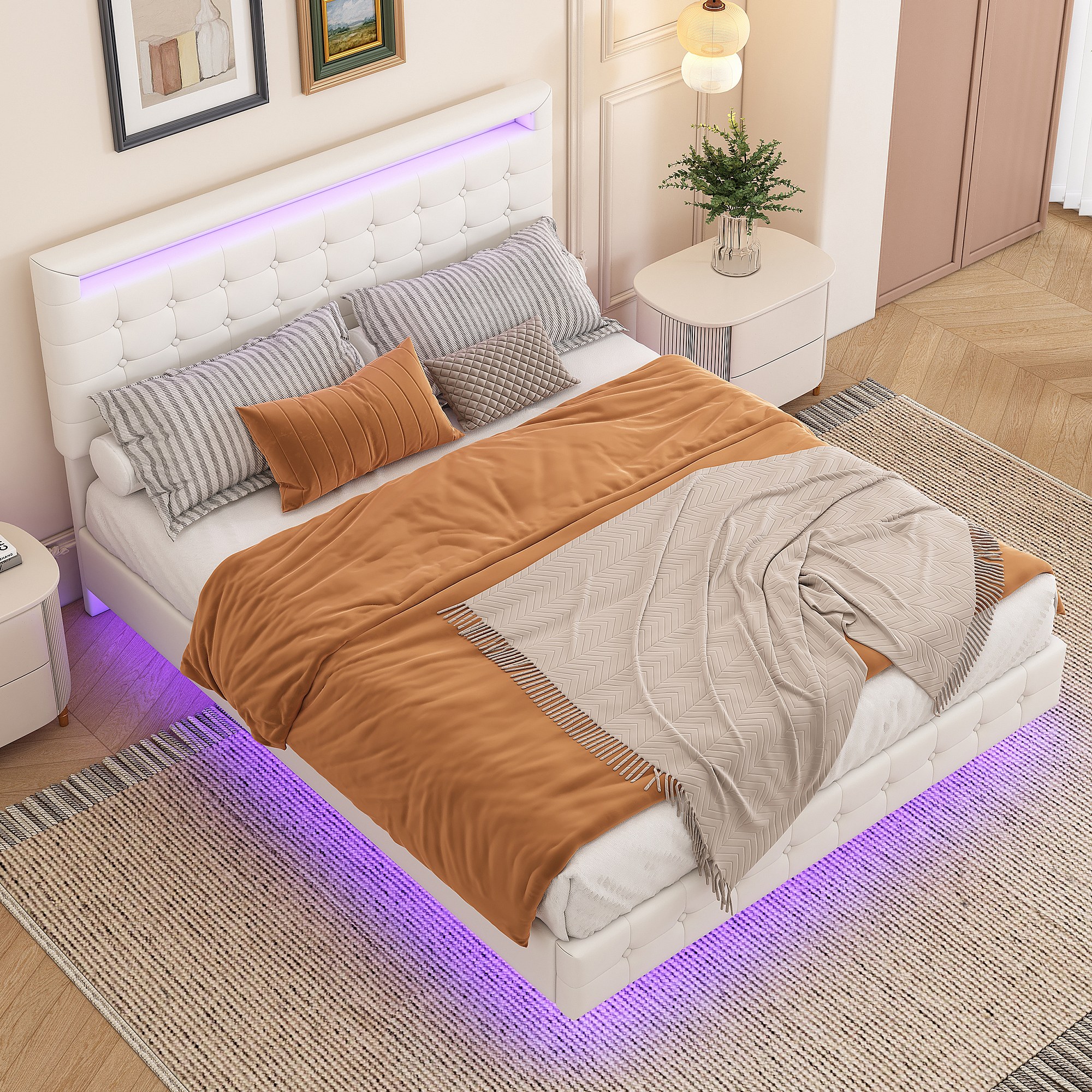 Lit double 140x200 cm, lit plat PU, LED multicolore, télécommande 24 touches, tête réglable en 3 positions, Blanc