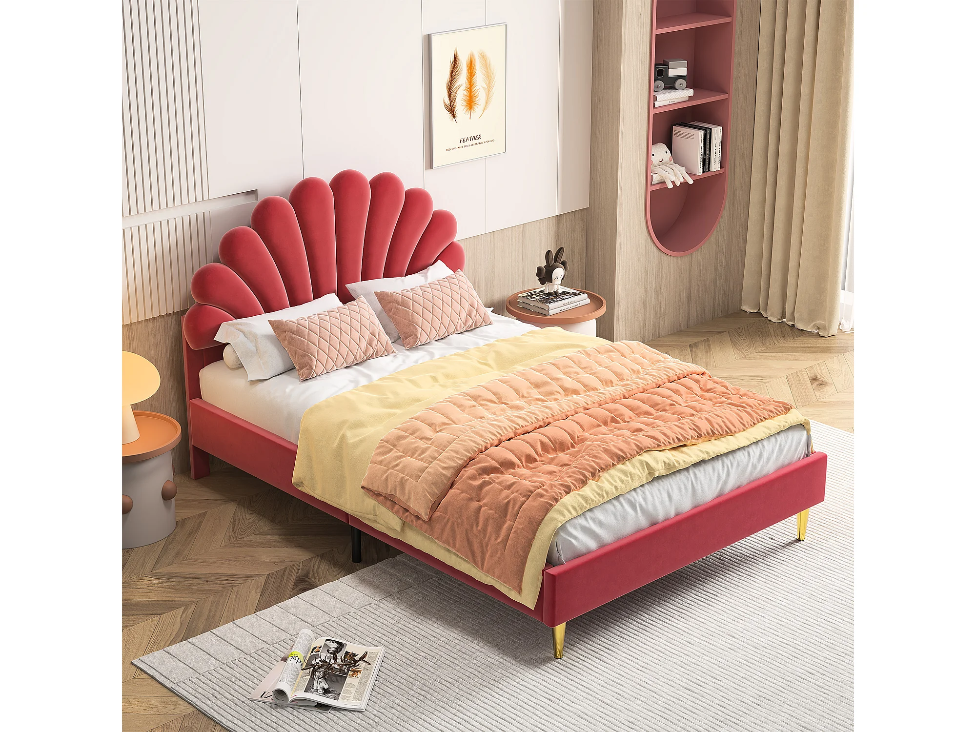 Lit double 140x200 cm – Lit princesse en velours rouge – Tête de lit fleurie – Sommier à lattes – Style scandinave