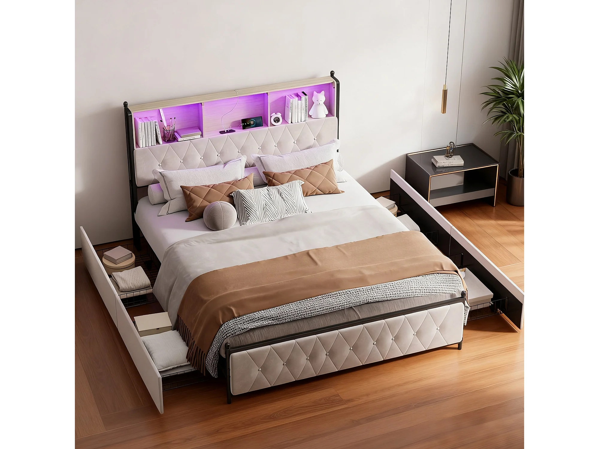 Lit double 140x200 cm - lit rembourré 140x200 cm - lit adulte avec éclairage LED et recharge USB - 4 tiroirs - velours - beige