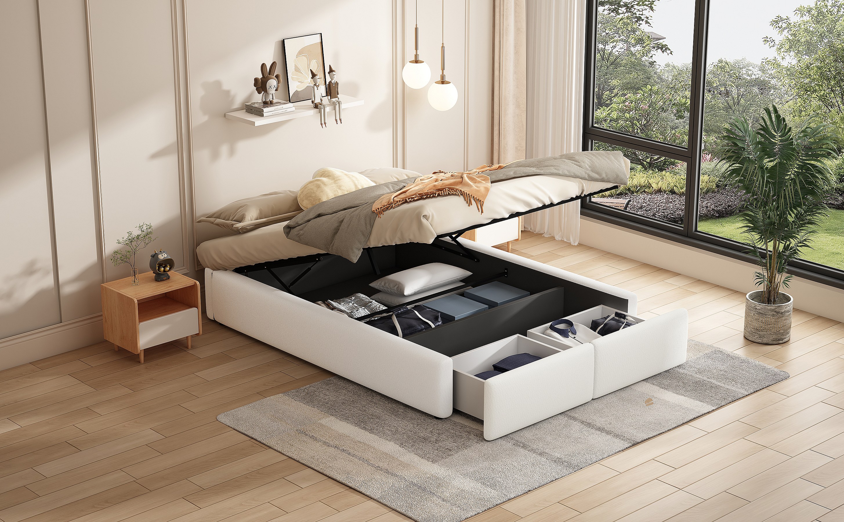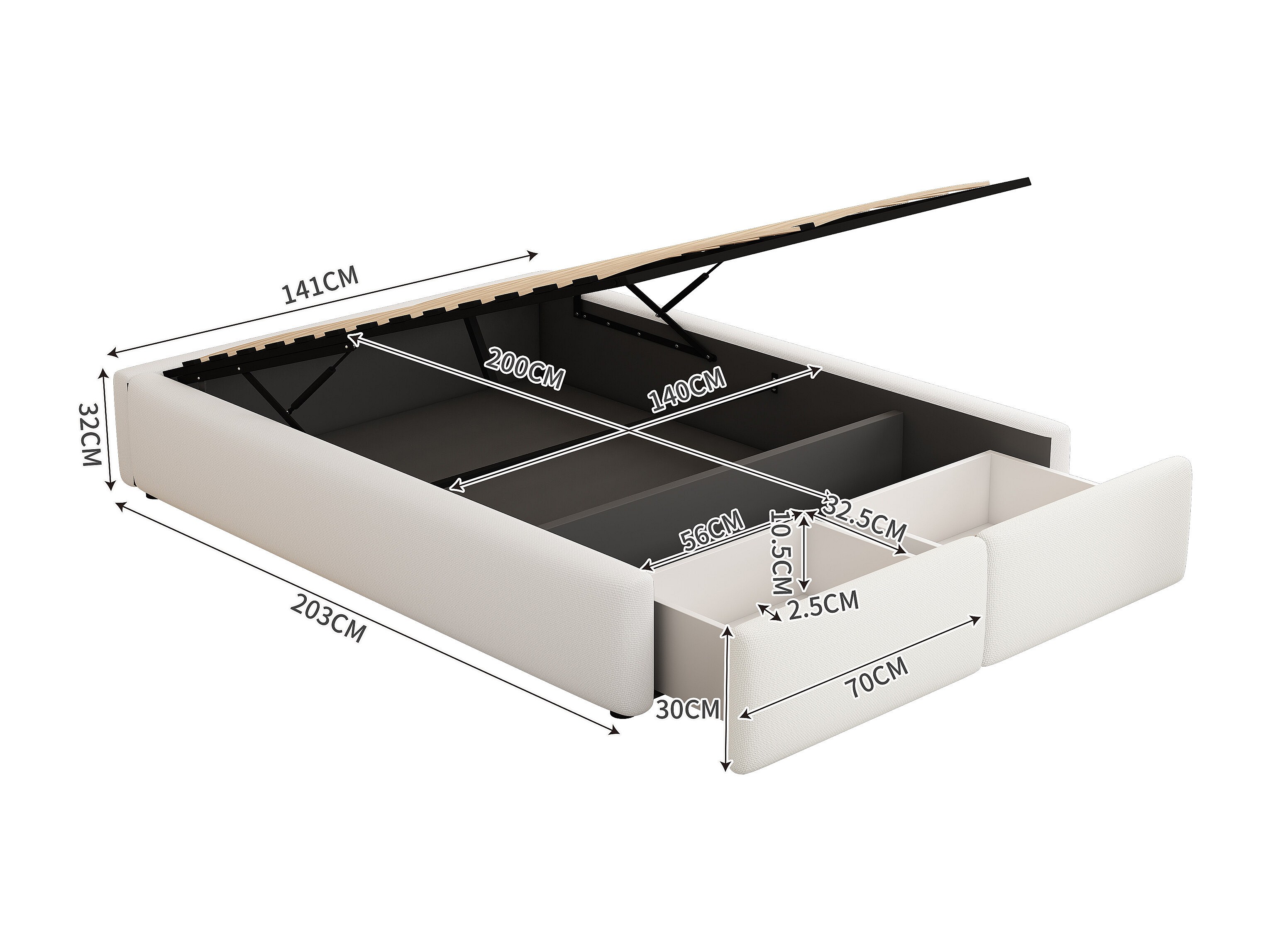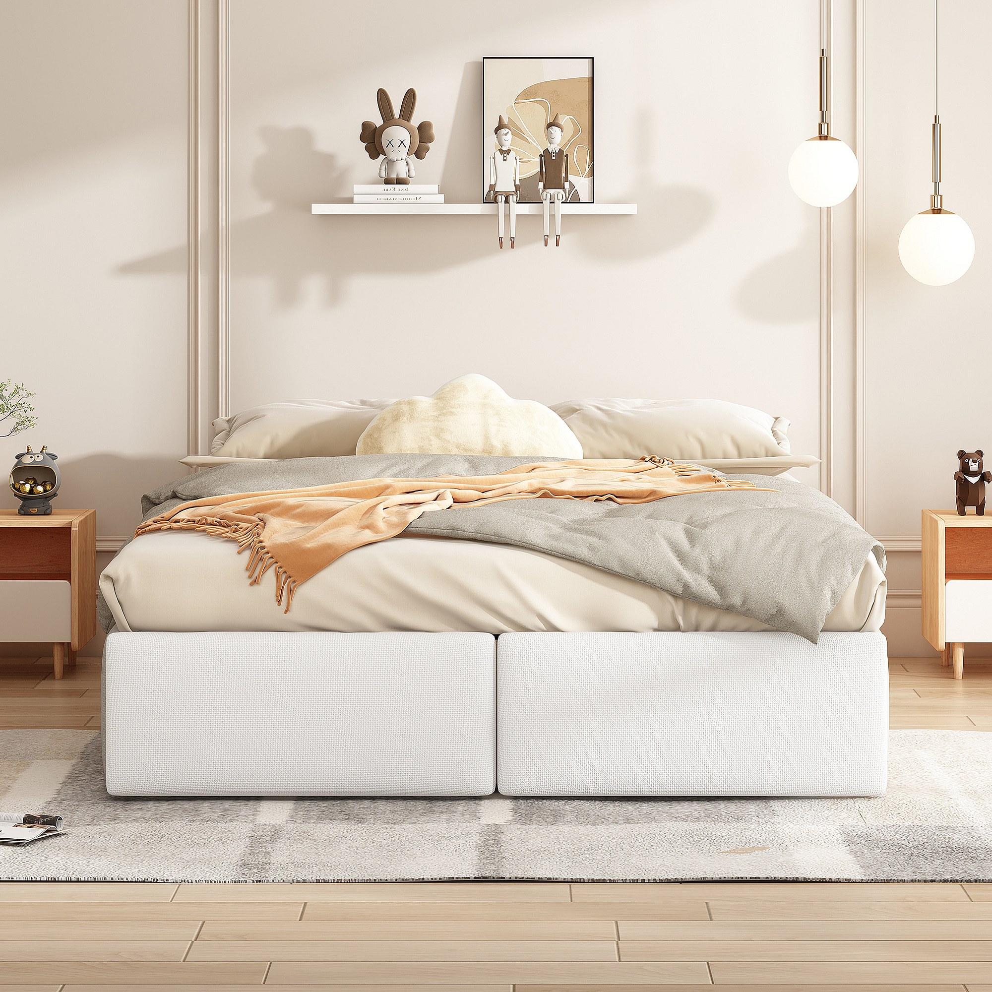 Lit double 140x200 cm, lit rembourré plateforme sans tête de lit, avec rangement hydraulique et 2 tiroirs, Blanc