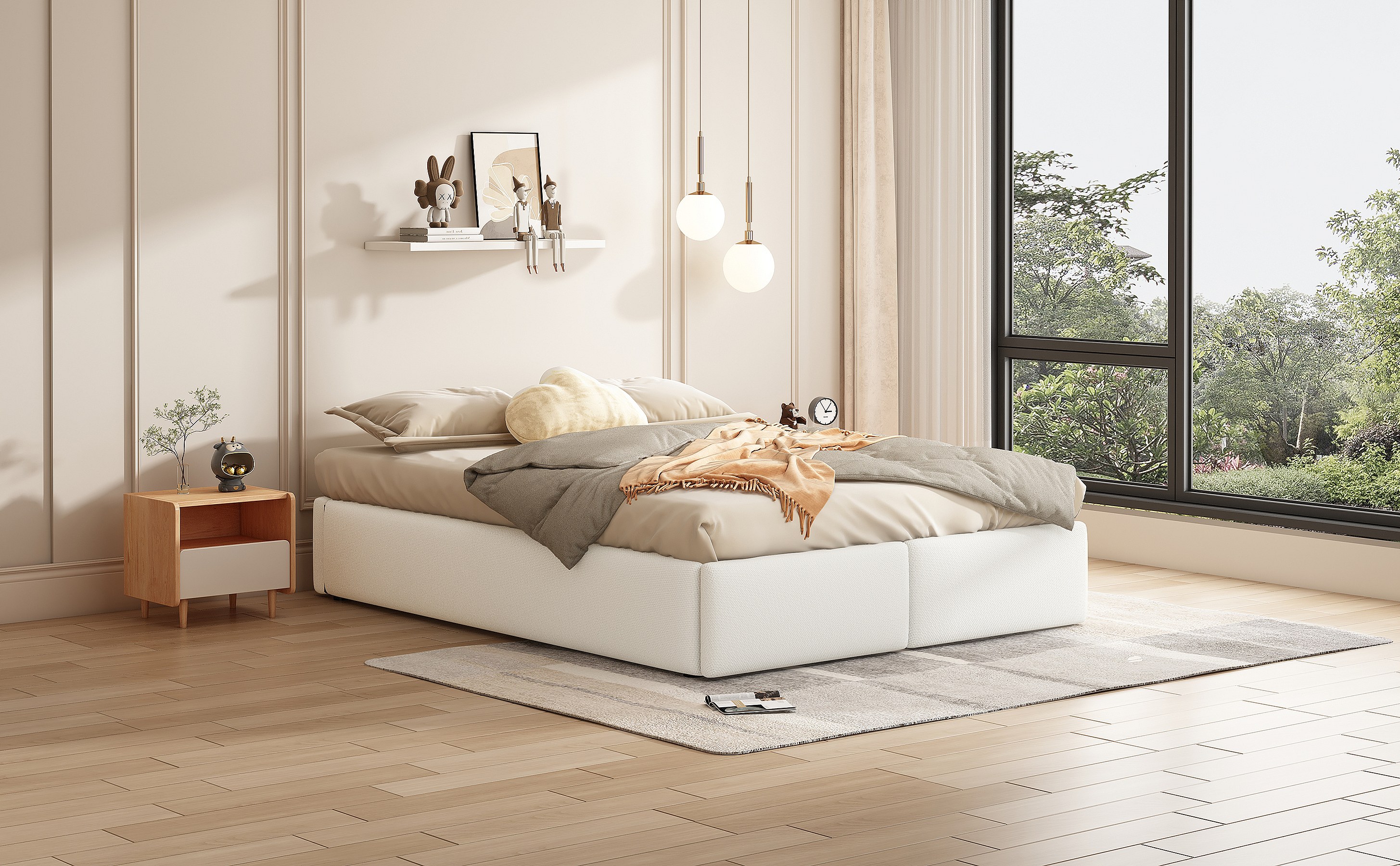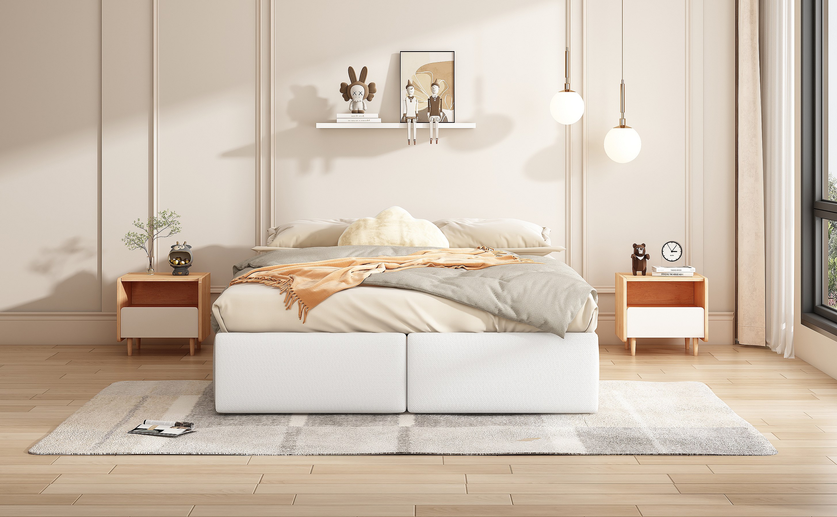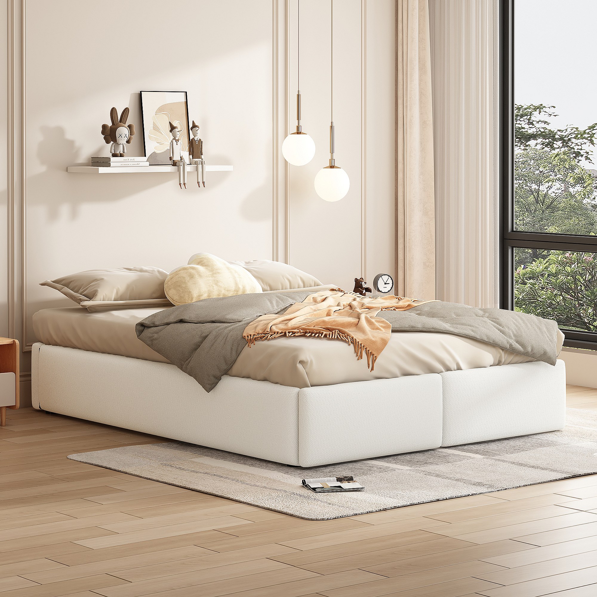 Lit double 140x200 cm, lit rembourré plateforme sans tête de lit, avec rangement hydraulique et 2 tiroirs, Blanc