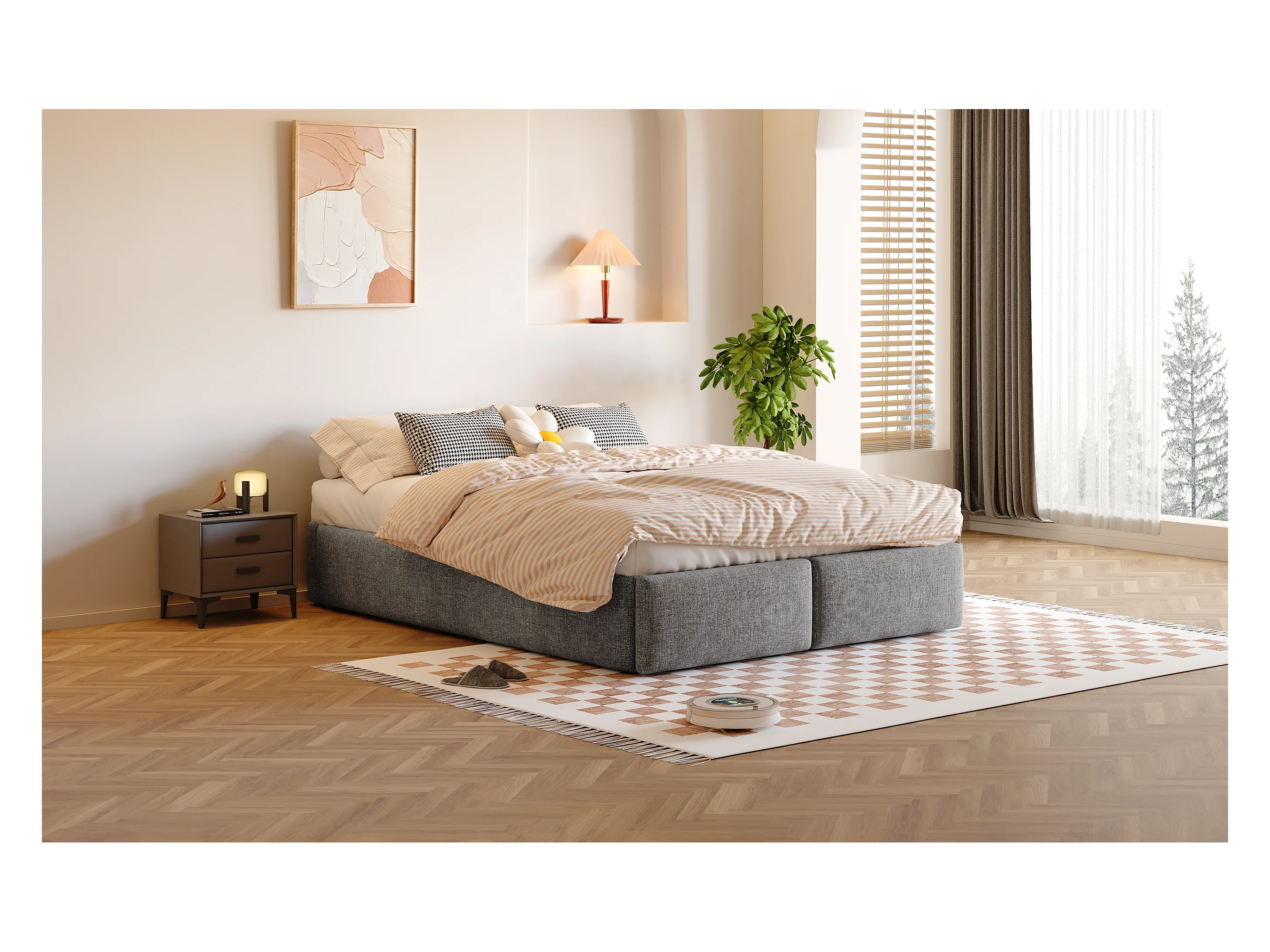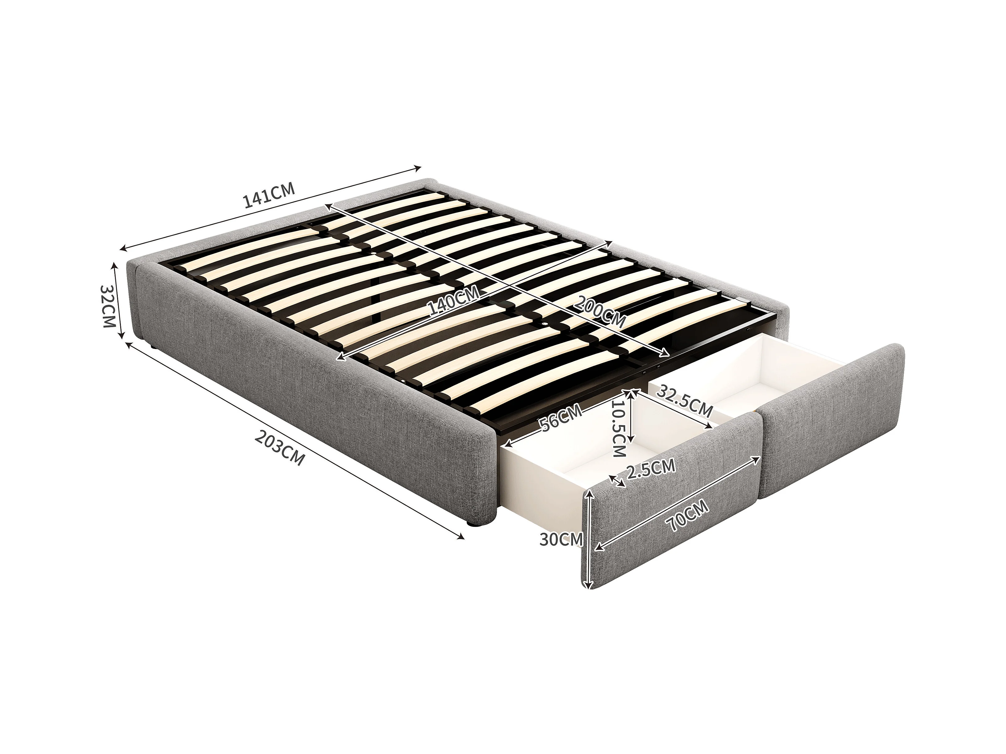 Lit double 140x200 cm, lit rembourré plateforme sans tête de lit, avec rangement hydraulique et 2 tiroirs, Gris
