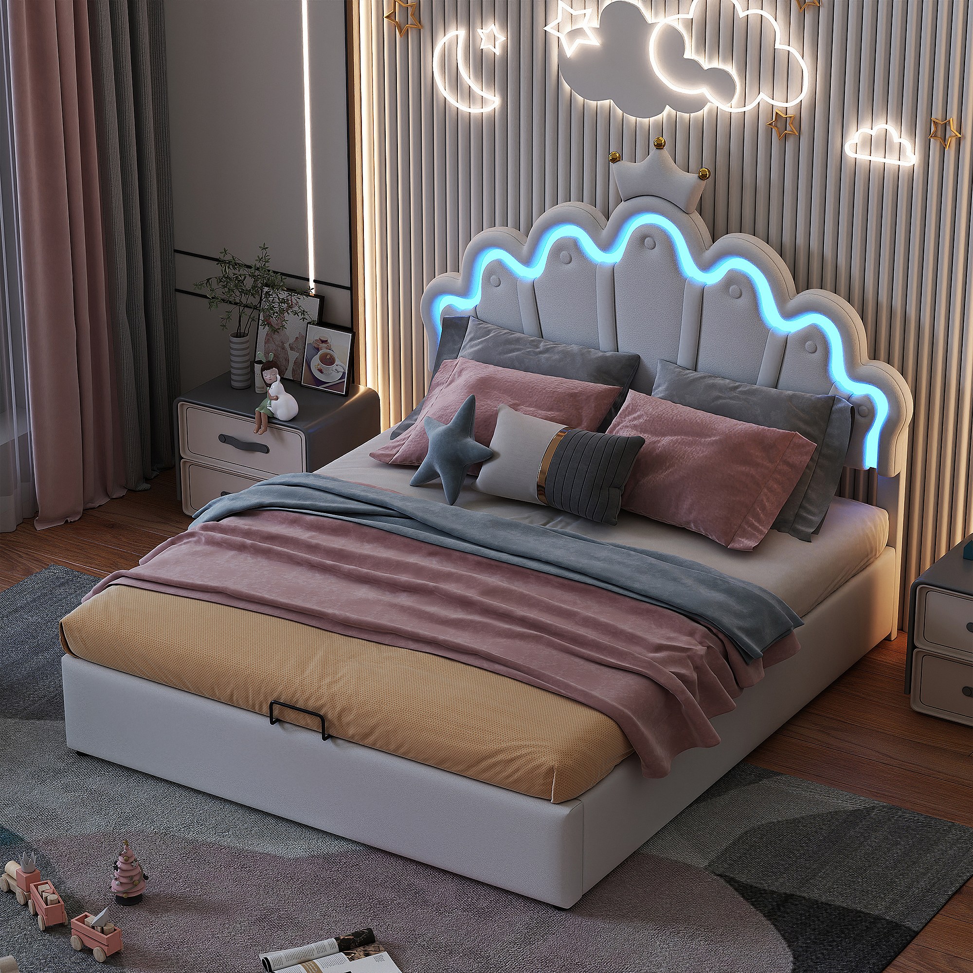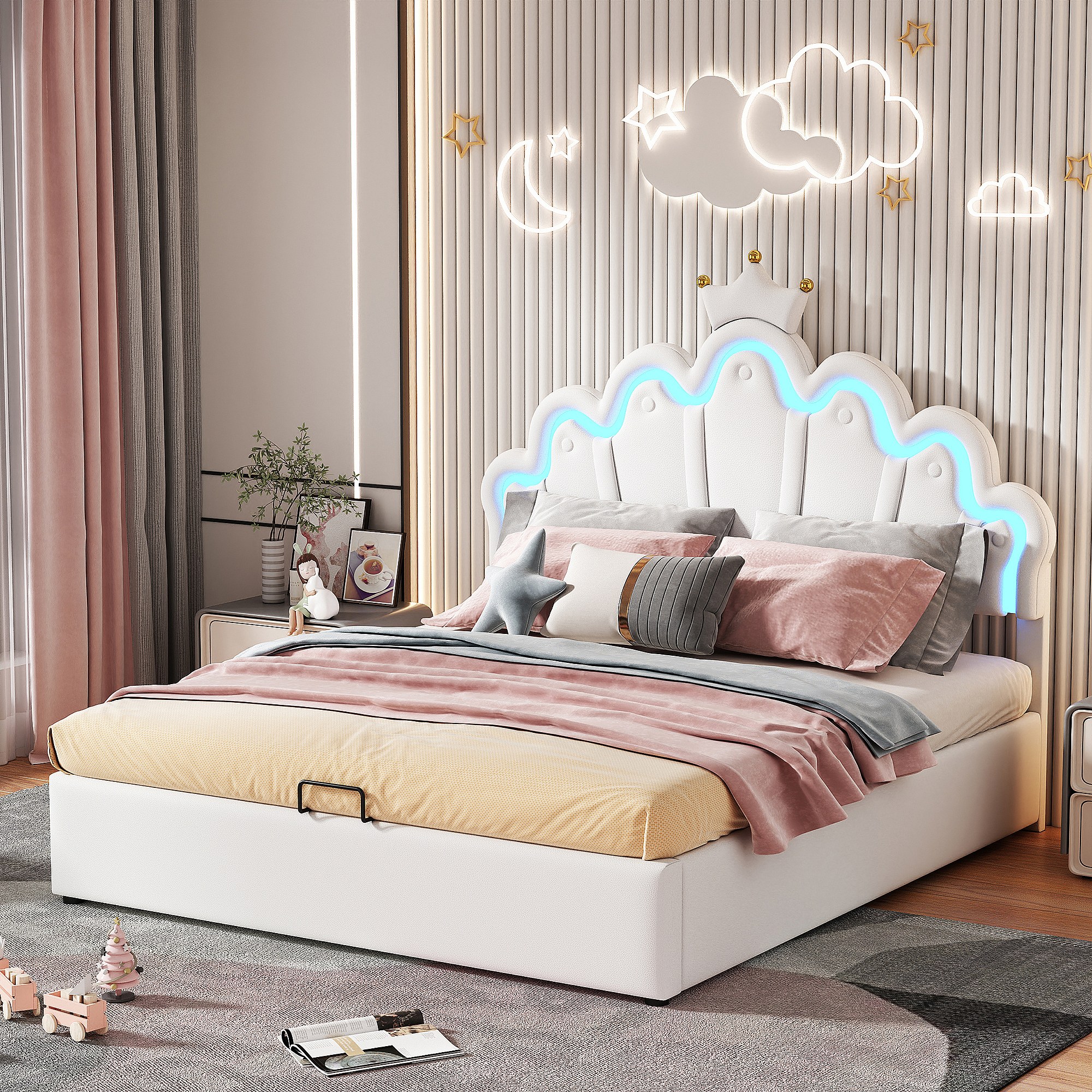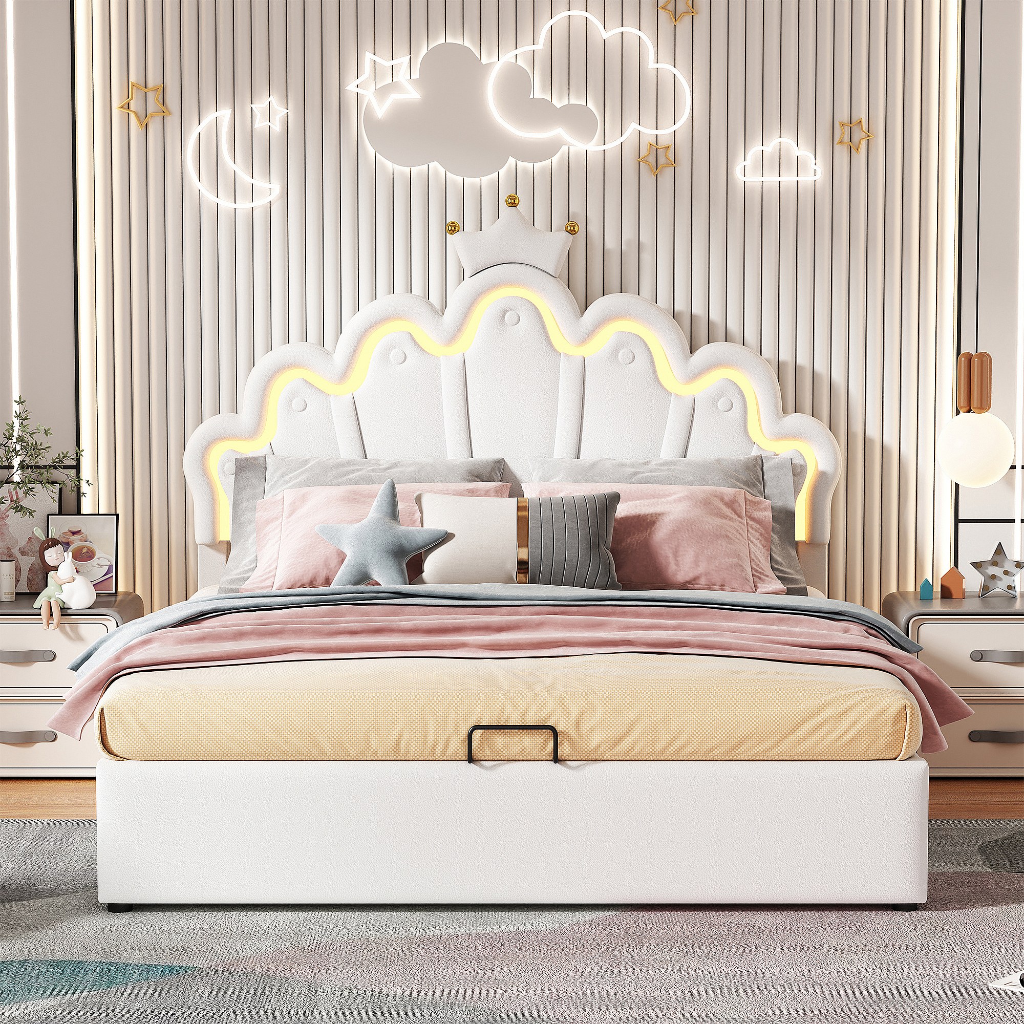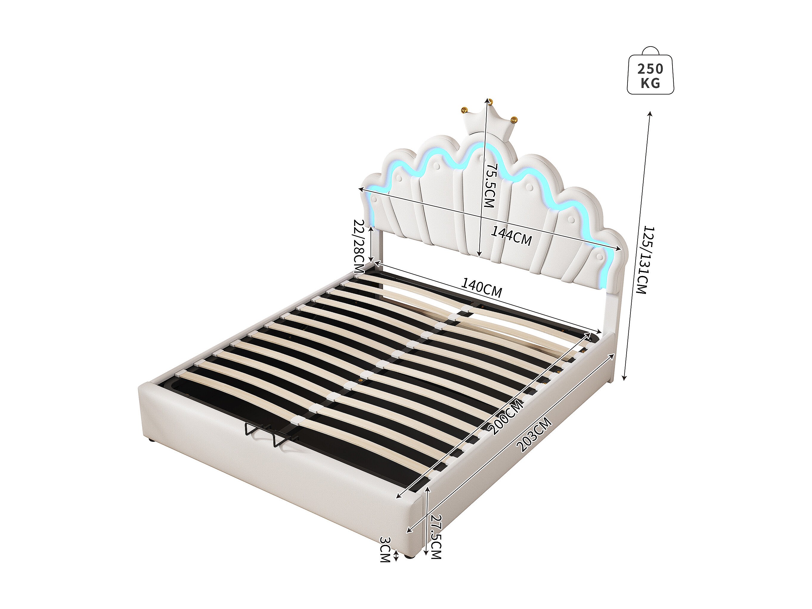 Lit double 140x200 cm, lit rembourré princesse, tête de lit avec bande lumineuse ajustable, couronne, Blanc