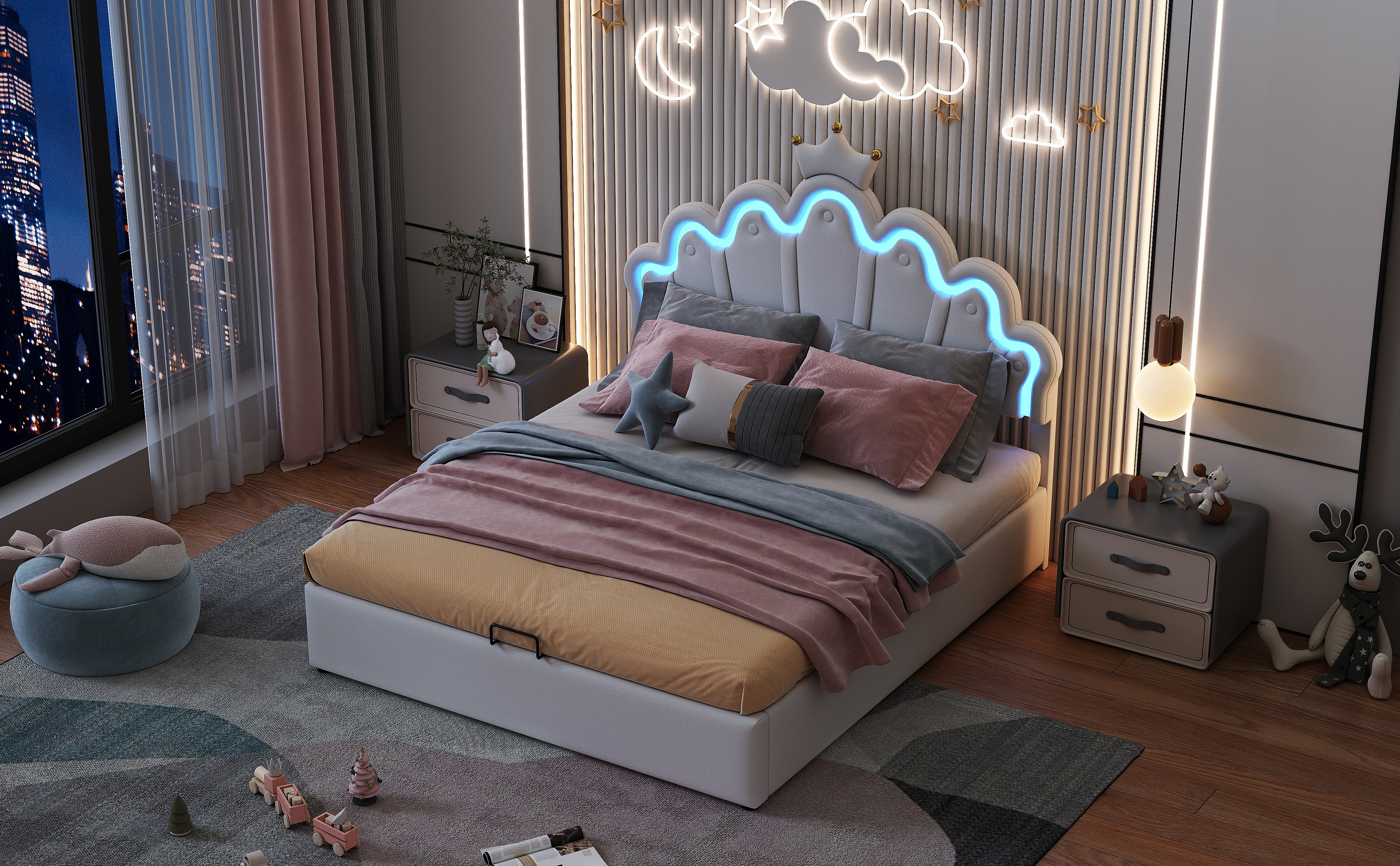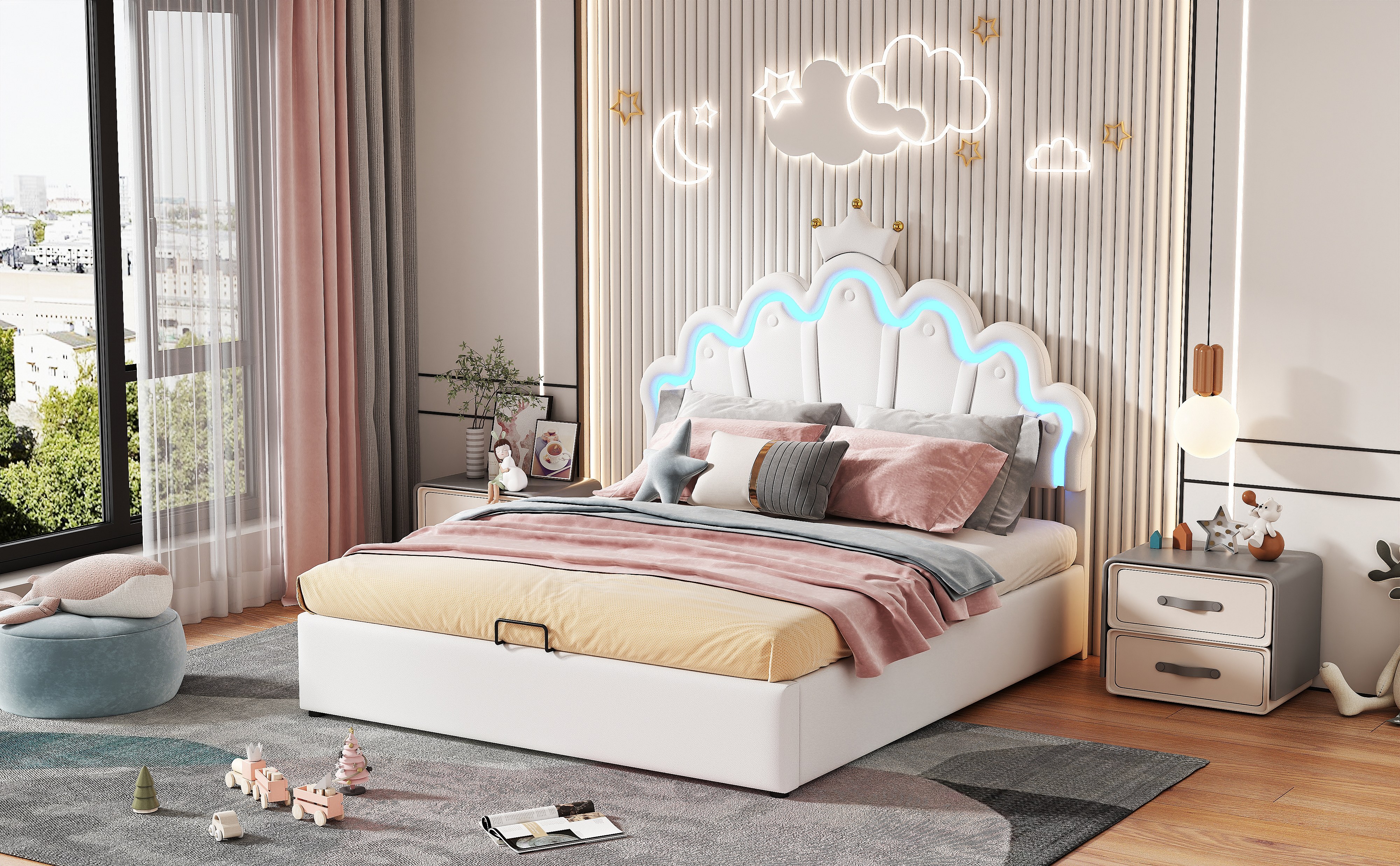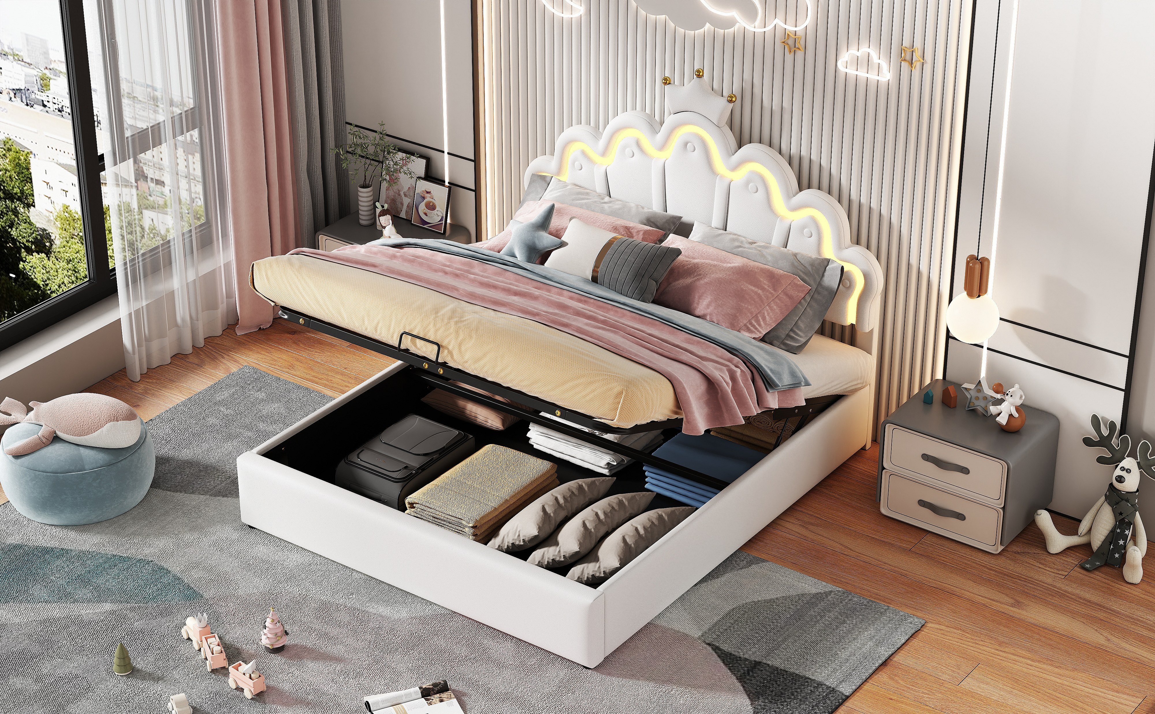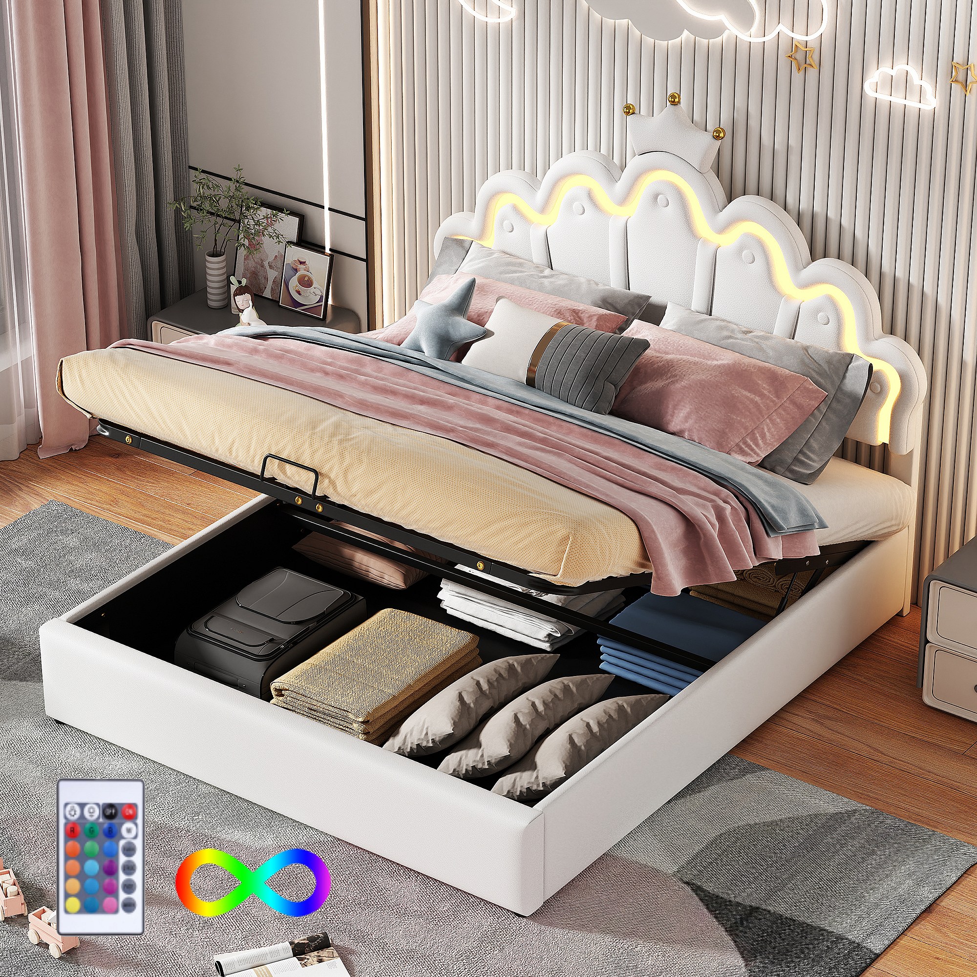 Lit double 140x200 cm, lit rembourré princesse, tête de lit avec bande lumineuse ajustable, couronne, Blanc