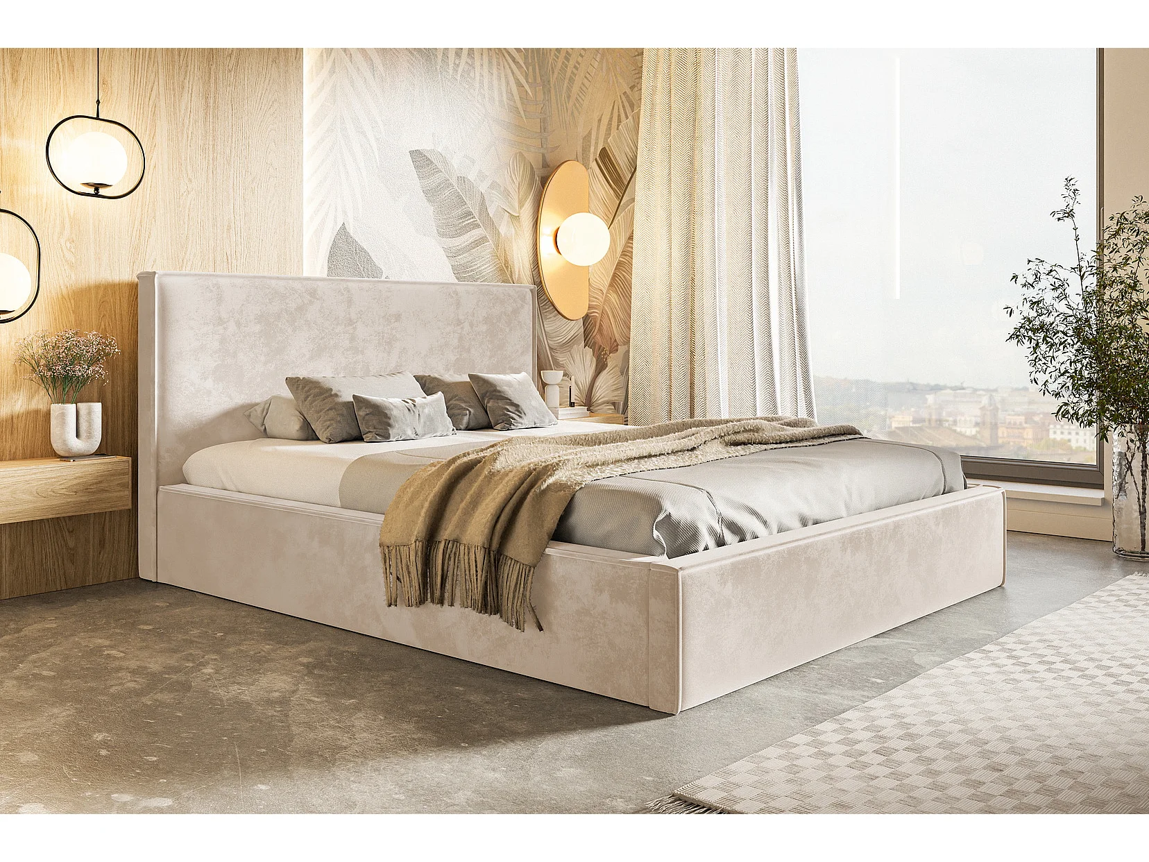 Lit double 140x200 Kyoto avec rangement - sommier métallique, tissu velours Beige (Amor Velvet 4304)