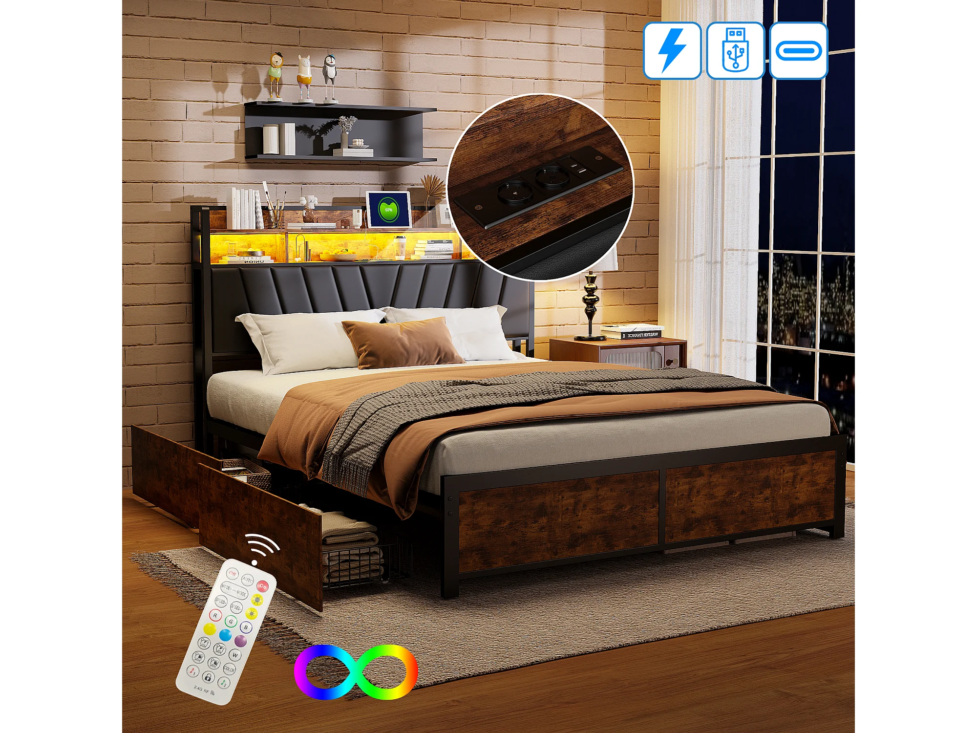 Lit double 140x200cm - avec 4 tiroirs - tête de lit avec éclairage LED et port USB, espace de rangement - noir