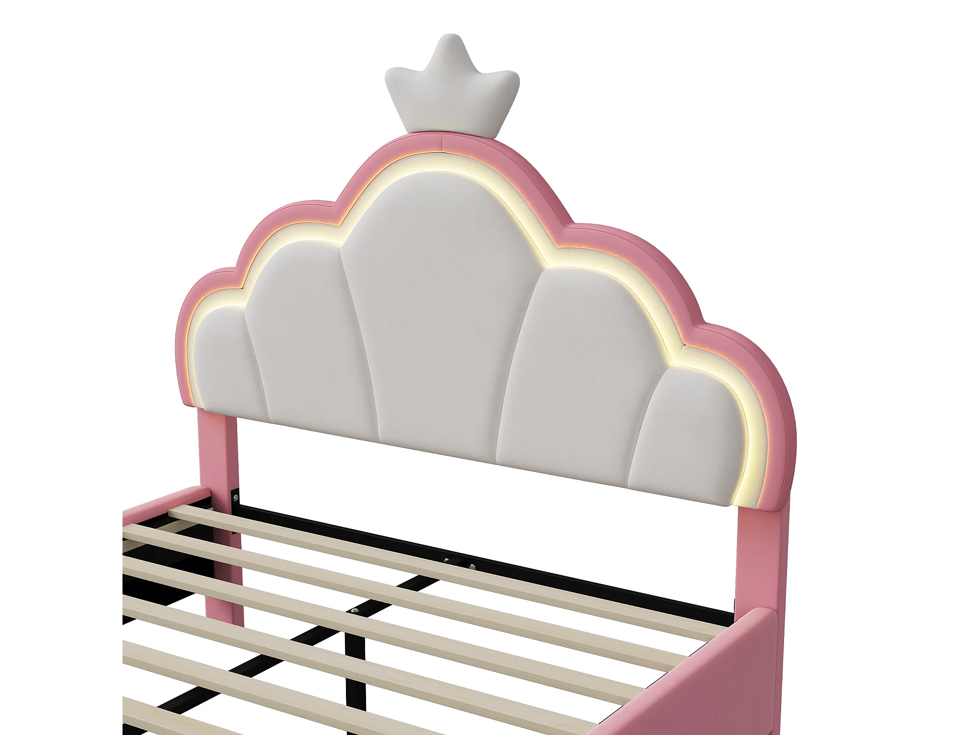 Lit double 140x200cm avec éclairage LED - tête de lit en forme de nuage, hauteur réglable - velours - rose