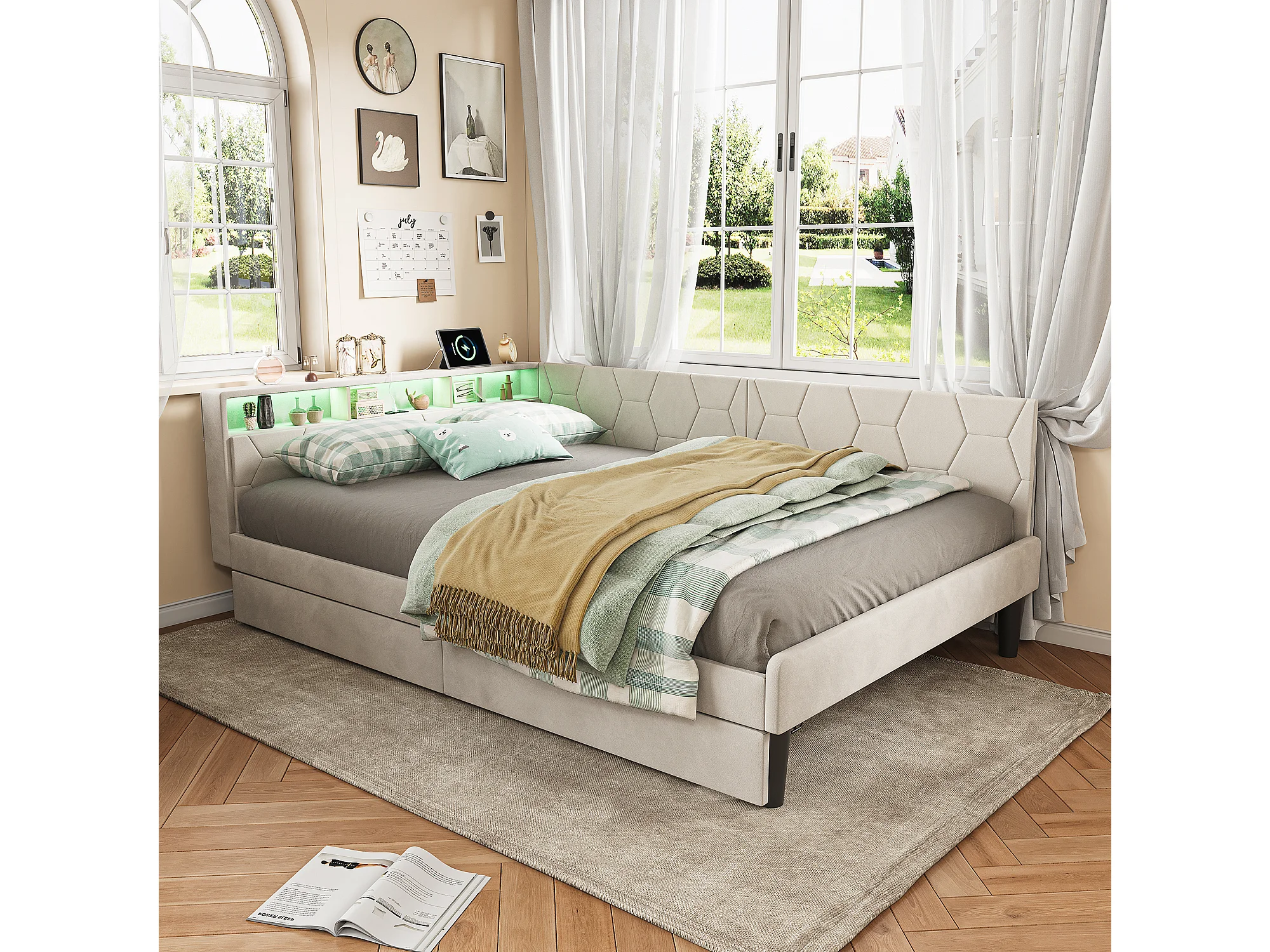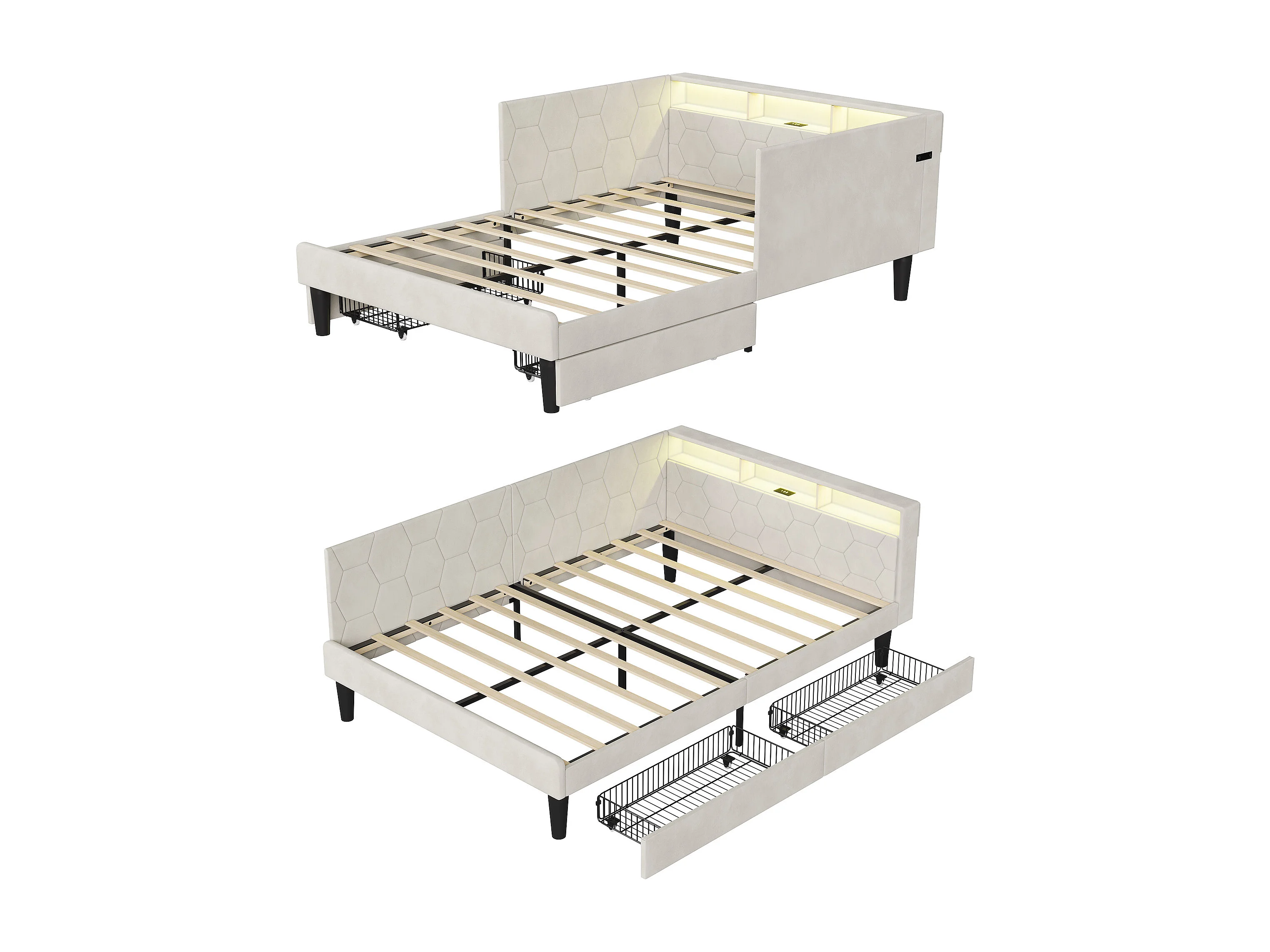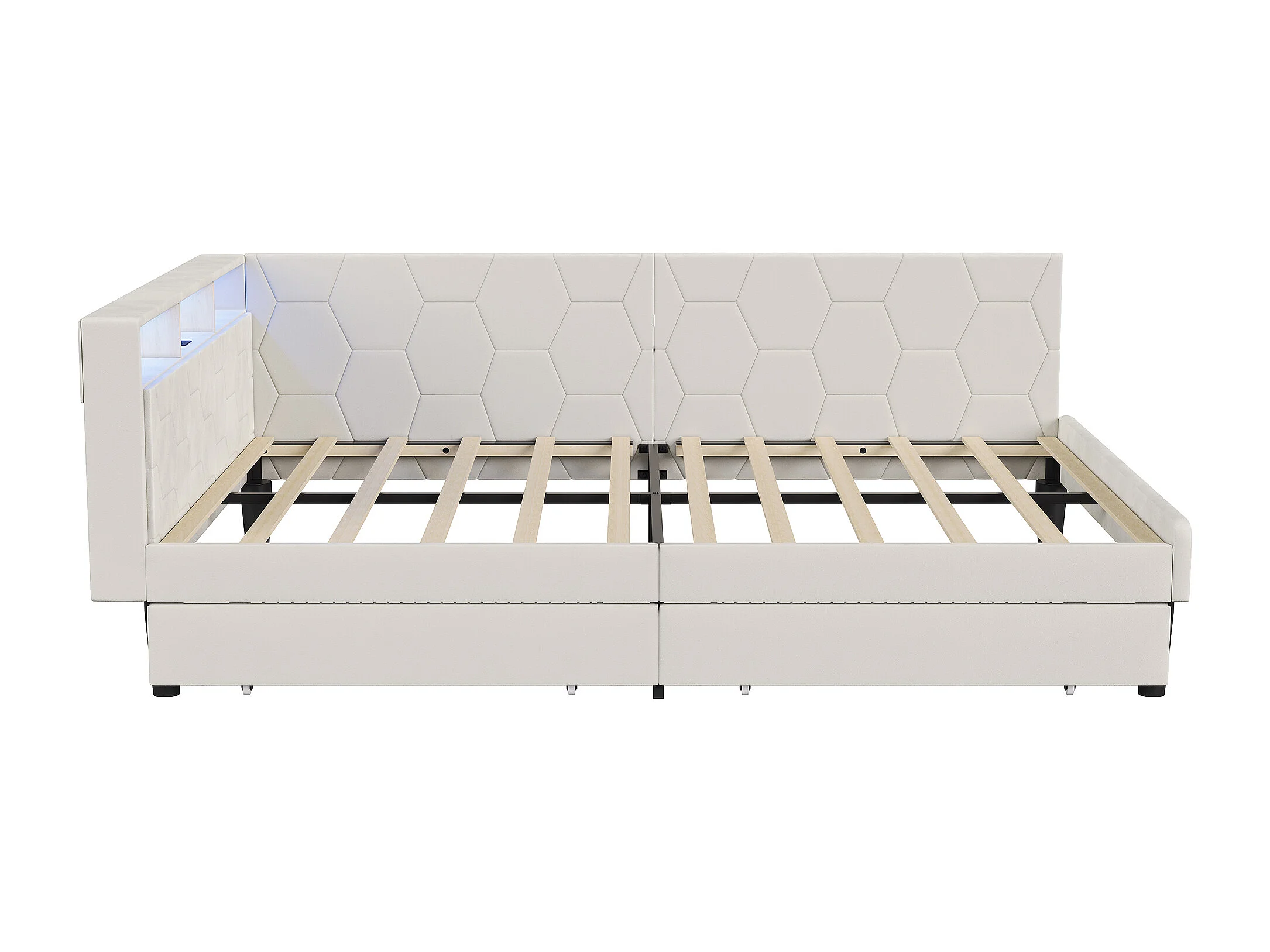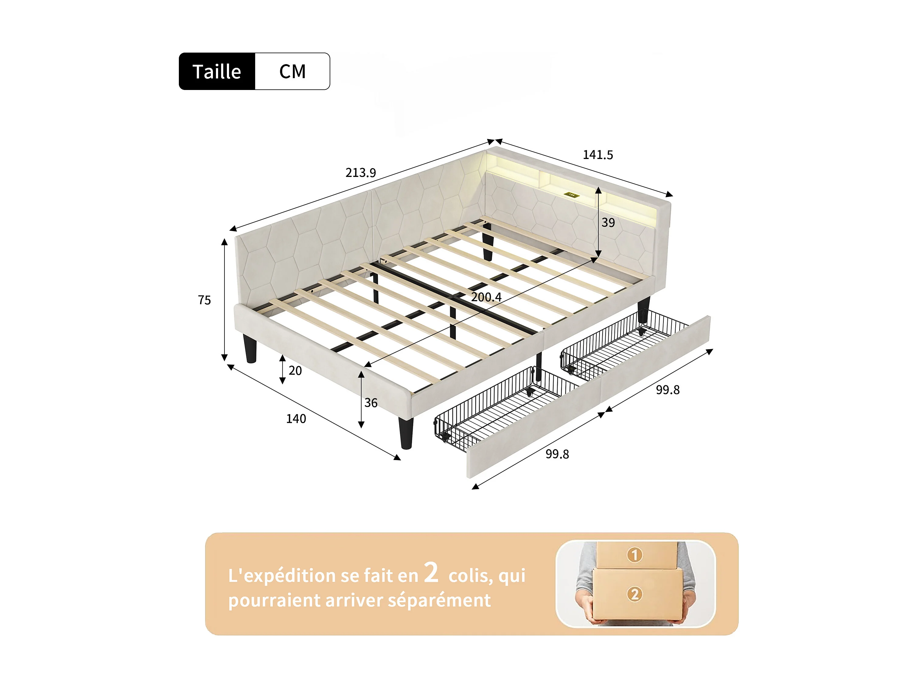 Lit double 140x200cm avec LED et ports USB - Canapé-lit d'angle avec 2 tiroirs - velours - beige