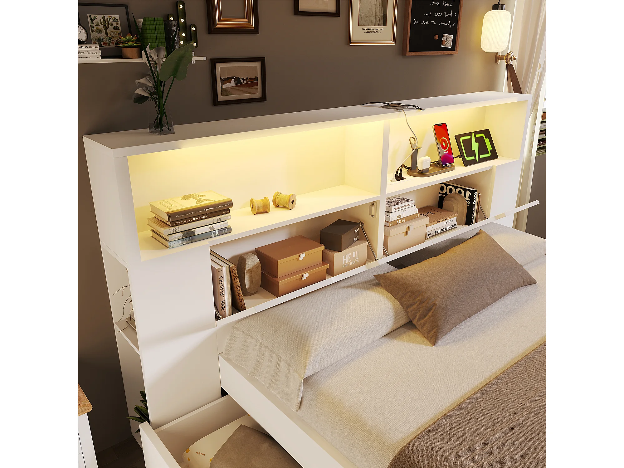 Lit double 140x200cm - avec lumière LED et port USB - avec banc coffre - grand espace de rangement - Blanc (matelas non inclus)