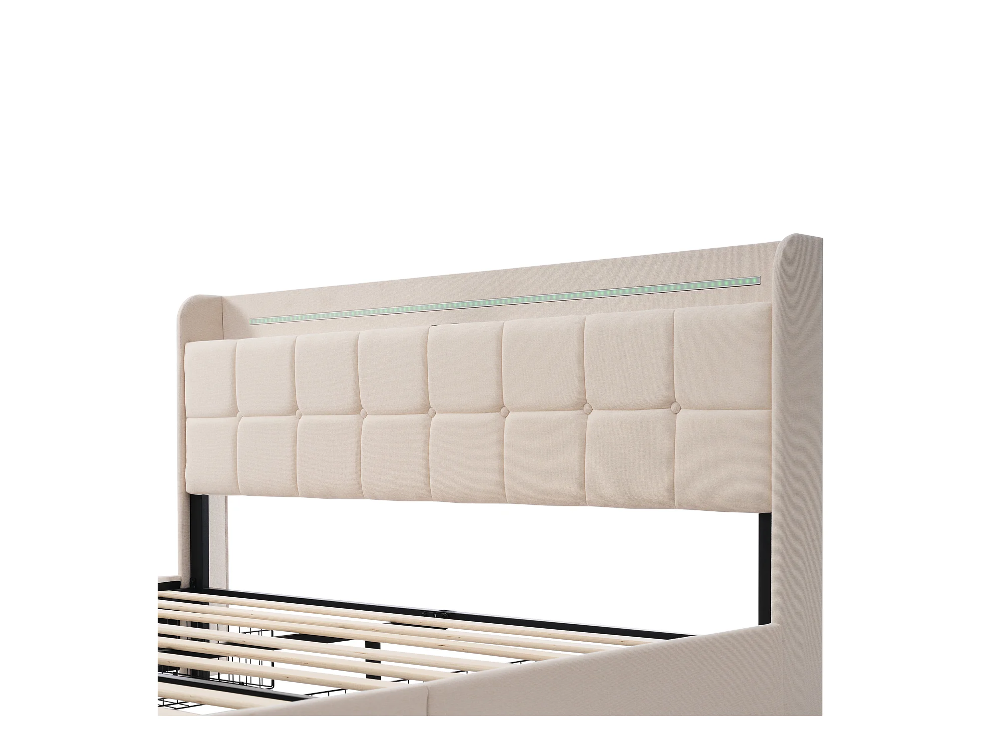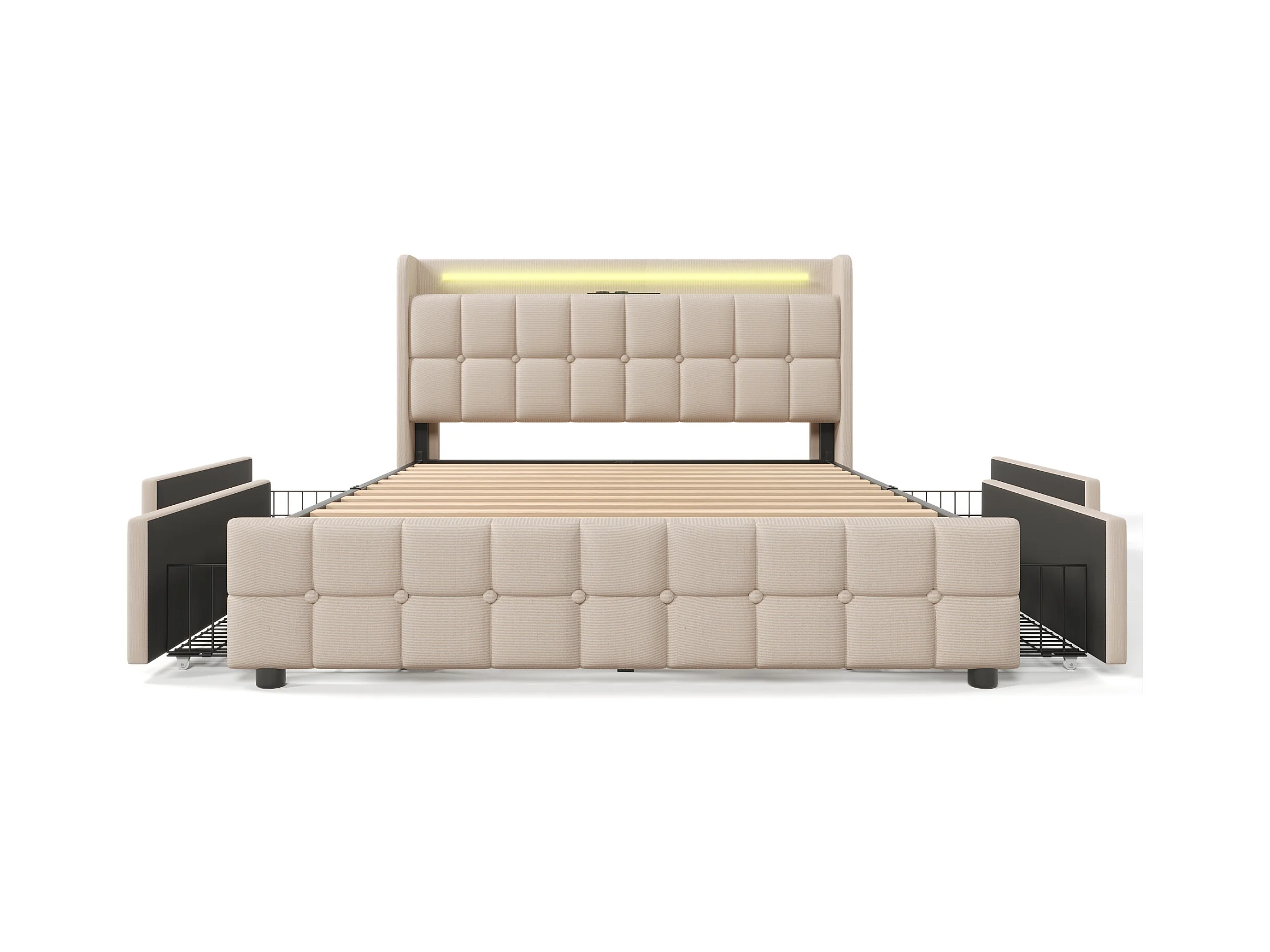 Lit double 140x200cm - Lit adulte avec LED et recharge USB - 4 tiroirs de rangement - lin beige