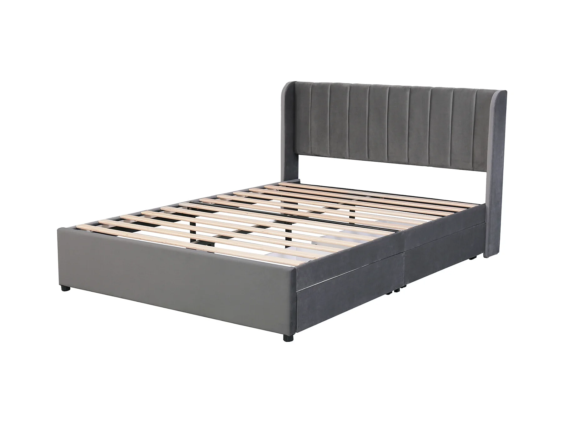 Lit double 140x200cm, lit rembourré en velours, avec 2 tiroirs, sommier à lattes et tête de lit, gris