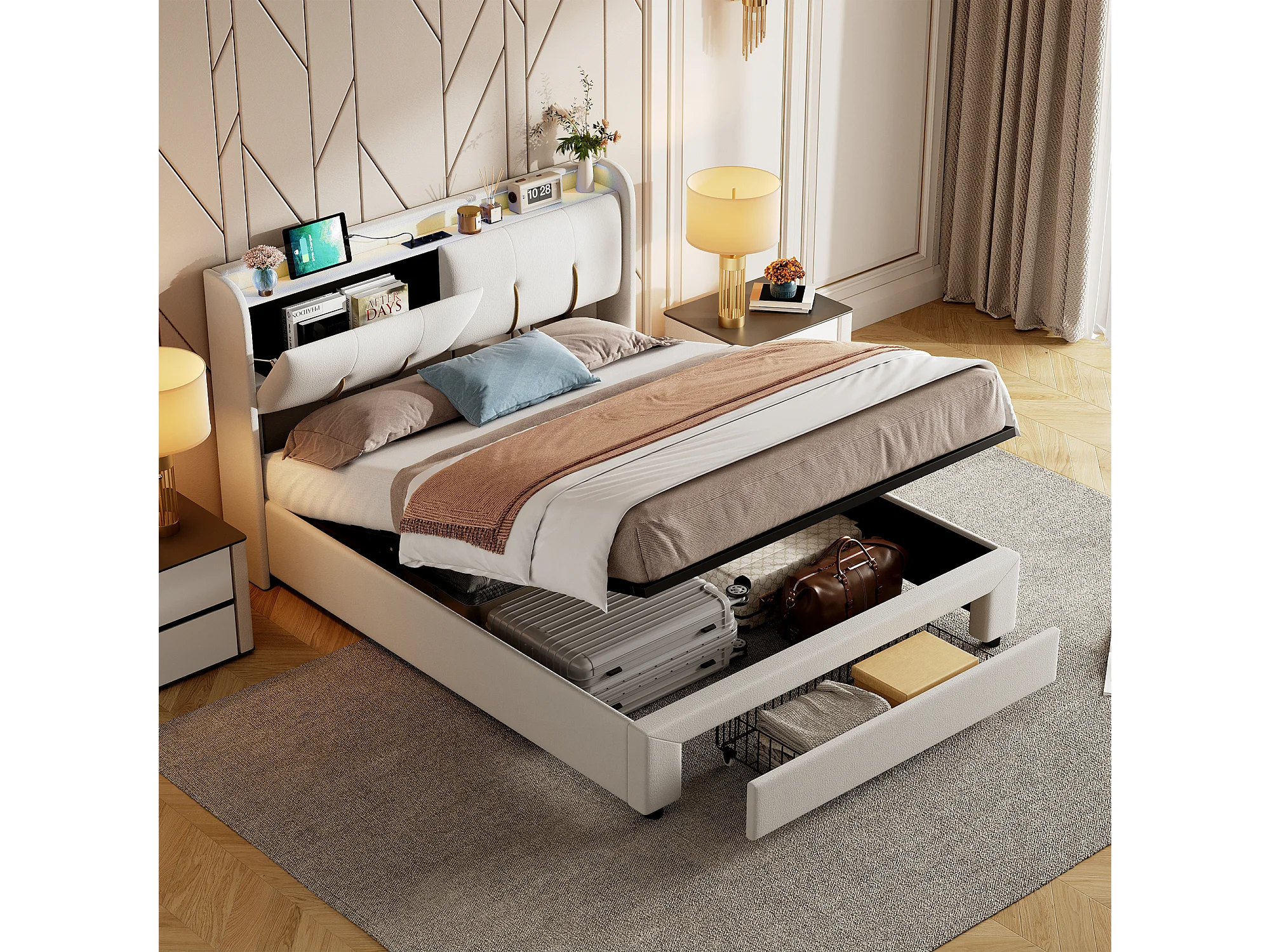 Lit double 140x200cm - Tête de lit avec LED et ports USB - Coffre de rangement hydraulique et 1 tiroir - Velours - Beige