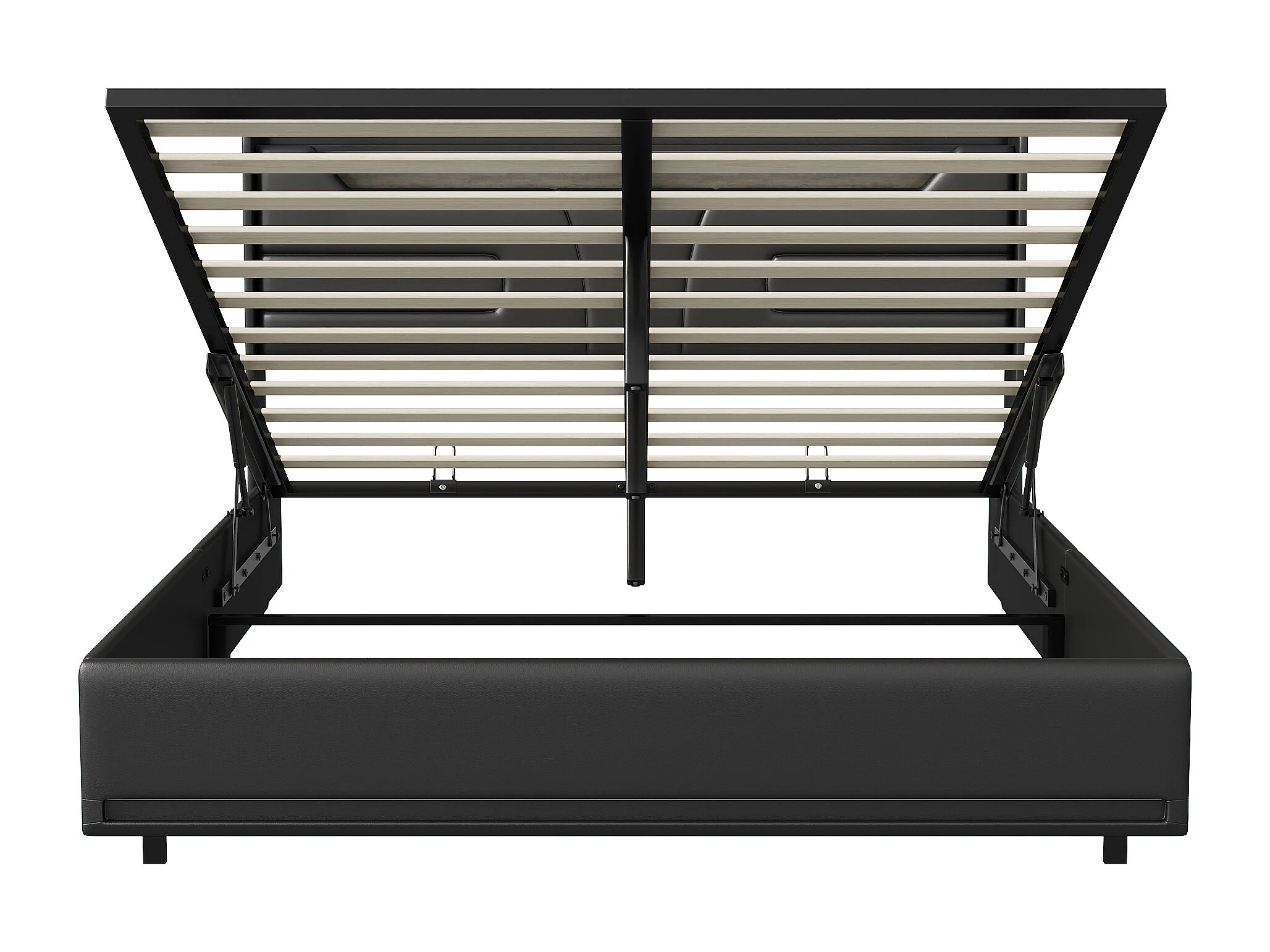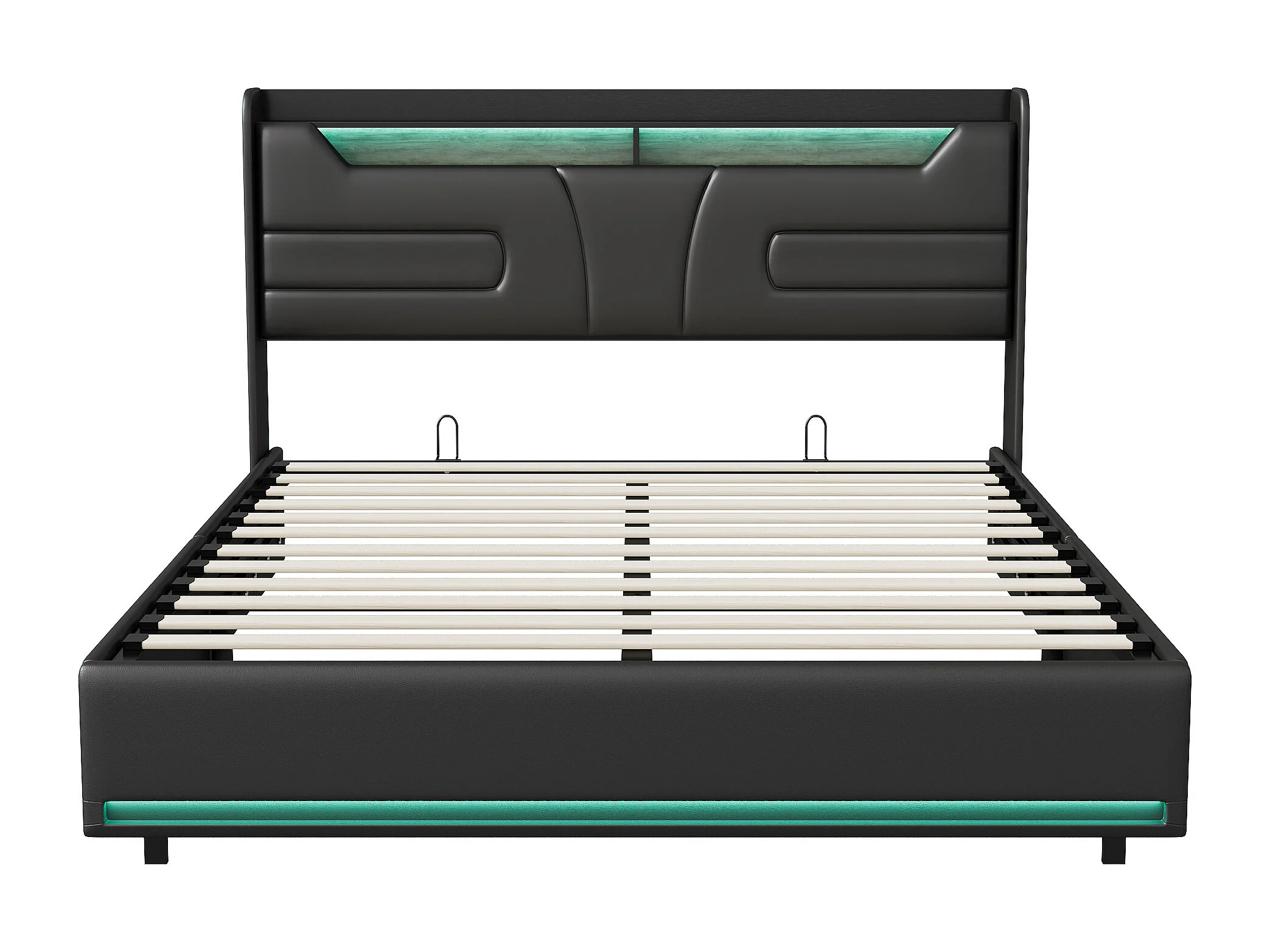 Lit double 160*200, tige à gaz, rangement sous le lit, ceinture lumineuse LED + recharge chevet, PU,noir
